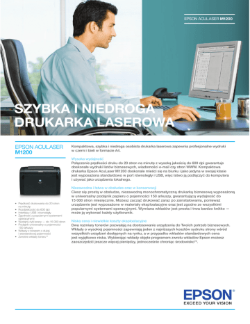 EPSON ACULASER M1200 SZYBKA I NIEDROGA DRUKARKA LASEROWA EPSON ACULASER M1200 Kompaktowa, szybka i niedroga osobista drukarka laserowa zapewnia profesjonalne wydruki w czerni i bieli w formacie A4. Wysoka wydajność Połączenie prędkości druku do 20 stron na minutę z wysoką jakością do 600 dpi gwarantuje doskonałe wydruki listów biznesowych, wiadomości e-mail czy stron WWW. Kompaktowa drukarka Epson AcuLaser M1200 doskonale mieści się na biurku i jako jedyna w swojej klasie jest wyposażona standardowo w port równoległy i USB, więc łatwo ją podłączyć do komputera i używać jako urządzenia lokalnego. • • • • • • • • Prędkość drukowania do 20 stron na minutę Rozdzielczość do 600 dpi Interfejsy: USB i równoległy Zgodność z popularnymi systemami operacyjnymi Wydajny cykl pracy — do 15 000 stron Podajnik uniwersalny o pojemności 150 arkuszy Wkłady z tonerem o dużej i standardowej pojemności Zwrotne wkłady toneru*6 Niezawodna i łatwa w obsłudze oraz w konserwacji Ciesz się prostą w obsłudze, niezawodną monochromatyczną drukarką biznesową wyposażoną w uniwersalny podajnik papieru o pojemności 150 arkuszy, gwarantującą wydajność do 15 000 stron miesięcznie. Możesz zacząć drukować zaraz po zainstalowaniu, ponieważ urządzenie jest wyposażone w materiały eksploatacyjne oraz jest zgodne ze wszystkimi popularnymi systemami operacyjnymi. Wymiana wkładów jest prosta i trwa bardzo krótko — może ją wykonać każdy użytkownik. Niska cena i niewielkie koszty eksploatacyjne Dwa rozmiary tonerów pozwalają na dostosowanie urządzenia do Twoich potrzeb biznesowych. Wkłady o wysokiej pojemności zapewniają jeden z najniższych kosztów sydruku strony wśród wszystkich urządzeń dostępnych na rynku, a w przypadku wkładów standardowych cena jest wyjątkowo niska. Wybierając wkłady objęte programem zwrotu wkładów Epson możesz zaoszczędzić jeszcze więcej pieniędzy, jednocześnie chroniąc środowisko*6. WYMIARY I SPECYFIKACJA PRODUKTU FUNKCJE DRUKOWANIA Technologia druku Rozdzielczość Szybkość drukowania Czas drukowania pierwszej strony Czas rozgrzewania Maksymalne obciążenie miesięczne Monochromatyczna, laserowa 600 dpi 20 stron na minutę 10,2 s*1 16 s*2 15 000 stron na miesiąc PARAMETRY TECHNICZNE KONTROLERA Procesor Pamięć Języki kontrolne drukarki 48 MHz 2 MB W oparciu o hosta INTERFEJSY STANDARDOWE OBSŁUGA NOŚNIKÓW Podawanie papieru Rozmiar papieru Gramatura papieru Odbiór papieru MATERIAŁY EKSPLOATACYJNE WYMAGANIA W ZAKRESIE ZASILANIA Znamionowe napięcie/częstotliwość/natężenie Zużycie energii WYMAGANIA SYSTEMOWE ORAZ OBSŁUGIWANE SYSTEMY OPERACYJNE Wymagania systemowe Obsługa systemów Windows Obsługa komputerów Mac Inne funkcje STEROWNIKI I OPROGRAMOWANIE WYMIARY I WAGA Wymiary (S x G x W) Waga WARUNKI ŚRODOWISKOWE Temperatura Wilgotność Ciśnienie akustyczne BEZPIECZEŃSTWO I PRZEPISY Normy bezpieczeństwa Dyrektywa EMC/EMI (Electromagnetic Compatibility — Kompatybilność Elektromagnetyczna) AL_M1200_Branded PDF – 1PL – 09/09 GWARANCJA*5 Zgodny z USB 2.0 Port równoległy Podajnik uniwersalny na 150 arkuszy A4, A5, B5, ISO-B5, LT, HLT, LGL, GLT, GLG, EXE, F4, MON, C10, DL, C5, C6, przezrocza, etykiety, rozmiar dostosowany: Sz: 76~216 mm; Dł: 127~356 mm 60~163 g/m2 100 arkuszy (stroną zadrukowaną do dołu) Wkład zwrotny wywoływacza o wysokiej pojemności: 3 200 stron*3 — C13S050523 Wkład wywoływacza o wysokiej pojemności: 3 200 stron*3 — C13S050521 Wkład zwrotny wywoływacza o standardowej pojemności: 1 800 stron*3 – C13S050522 Wkład zwrotny wywoływacza o standardowej pojemności: 1 800 stron*3 — C13S050520 Wkład wywoływacza o początkowej pojemności: 900 stron*3 Moduł fotoprzewodnika: 20 000 stron — C13S051099 220~240 V ±10%/50~60 Hz ±3 Hz/4,5 A Średnio podczas drukowania: 347 W; Tryb gotowości: 41 w, Uśpienie: 8 W, Wyłączona: 0 W 279 mm 261 mm 385 mm MODELE PRODUKTU Epson AcuLaser M1200 C11CA71001 MATERIAŁY EKSPLOATACYJNE Wkład zwrotny wywoływacza o wysokiej pojemności: 3 200 stron*3 C13S050523 Wkład wywoływacza o wysokiej pojemności: 3 200 stron*3 C13S050521 Wkład zwrotny wywoływacza o standardowej pojemności: 1 800 stron*3 C13S050522 Wkład wywoływacza o standardowej pojemności: 1 800 stron*3 PC: Zgodna ze standardami IBM PC/AT PROCESOR: Pentium 233 MHz lub szybszy Ekran: VGA (640 x 480) lub o większej rozdzielczości Windows 2000/XP/Vista/XP 64-bitowy/Vista 64-bitowy/Windows 7*4 Komputery Macintosh: OSX 10.3.9 ~ OSX 10.5.x Informacje o zgodności z systemami Linux, Unix, Novell, SAP itp. zostały zawarte na stronie http://www.business-solutions.epson.co.uk/Compatible.htm Sterownik drukarki (wraz ze Status Monitor) Instrukcja obsługi Web-to-Page 385 x 279 x 261 mm 6 kg Tryb pracy: 10~35°C/Przechowywanie: 0~35°C Tryb pracy: 15~85%RH/Przechowywanie: 10~85%RH Drukowanie: 54 dB (A) Stan gotowości: 39 dB (A) Uśpienie: na poziomie szumu tła Stężenie małych cząsteczek: maksymalnie 4,0 mg/godz. Stężenie ozonu maksymalnie 1,5 mg/godz. Stężenie styrenu: maksymalnie 1,0 mg/godz. Benzen: maksymalnie 0,05 mg/godz. TVOC: maksymalnie 10 mg/godz. EN 60825-1+A11, A2 (2001) EN 55022 (2006) klasy B EN 61000-3-2 (2006) EN 61000-3-3 (1995+A1:2001+A2:2005) EN 55024 (1998+A1:2001+A2:2003) Standardowa: 2 lata naprawa w serwisie Opcjonalna: 3 lata, naprawa w serwisie (ECPGRP10) Opcjonalna: 3 lata na miejscu (ECPGRP15) Infolinia: 0801 64 64 53 (0,29 zł/min.) www.epson.pl Znaki towarowe oraz zastrzeżone znaki towarowe są własnością firmy Seiko Epson Corporation lub odpowiednich firm. Informacje o produkcie mogą ulec zmianie bez uprzedzenia. C13S050520 Wkład wywoływacza o początkowej pojemności: 900 stron*3 Moduł fotoprzewodnika: 20 000 stron *1 Szacunki czasowe opracowano na podstawie zadania drukowania uruchomionego w ciągu jednej sekundy od pojawienia się ostatniej strony poprzedniego zadania drukowania *2 Od try