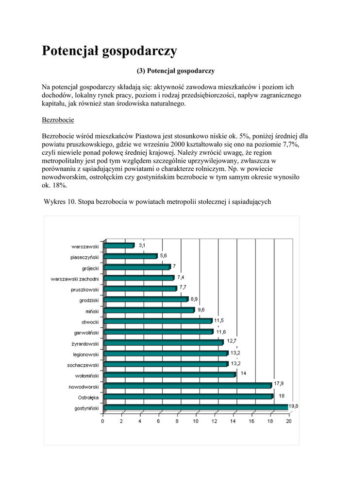 Potencjał gospodarczy (3) Potencjał gospodarczy Na potencjał gospodarczy składają się: aktywność zawodowa mieszkańców i poziom ich dochodów, lokalny rynek pracy, poziom i rodzaj przedsiębiorczości, napływ zagranicznego kapitału, jak również stan środowiska naturalnego. Bezrobocie Bezrobocie wśród mieszkańców Piastowa jest stosunkowo niskie ok. 5%, poniżej średniej dla powiatu pruszkowskiego, gdzie we wrześniu 2000 kształtowało się ono na poziomie 7,7%, czyli niewiele ponad połowę średniej krajowej. Należy zwrócić uwagę, że region metropolitalny jest pod tym względem szczególnie uprzywilejowany, zwłaszcza w porównaniu z sąsiadującymi powiatami o charakterze rolniczym. Np. w powiecie nowodworskim, ostrołęckim czy gostynińskim bezrobocie w tym samym okresie wynosiło ok. 18%. Wykres 10. Stopa bezrobocia w powiatach metropolii stołecznej i sąsiadujących Dochody mieszkańców Dochody mieszkańców Piastowa i pozostałych gmin pow. pruszkowskiego są stosunkowo wysokie w porównaniu do średniej kraju i woj. mazowieckiego. Zważywszy wysoką gęstość zaludnienia w Piastowie można wnioskować o stosunkowo dużej chłonności lokalnego rynku, co podnosi atrakcyjność miasta dla inwestorów oraz może ułatwiać rozwój lokalnego sektora usług. Wykres 11 Podatek od dochodów osobistych w zł na jednego mieszkańca Lokalny rynek pracy Pomimo takich stosunkowo korzystnych warunków rozmiary lokalnego rynku pracy są niewielkie. Jedynie 21% mieszkańców Piastowa w wieku produkcyjnym znajduje zatrudnienie na miejscu, w porównaniu do ponad 40% w gminach sąsiadujących. Natomiast gmina Warszawa Włochy importuje prawie połowę pracujących na jej terenie. Mała zasobność lokalnego rynku pracy w Piastowie jest w dużej mierze wynikiem roli miasta wyznaczonej jej w okresie centralnego planowania jako "sypialni" dla tzw. Warszawskiego Okręgu Przemysłowego. Największym pracodawcą dla mieszkańców Piastowa są zakłady Ursusa i niedawna redukcja 2000 pracowników w tym zakładzie miała poważne skutki dla mieszkańców miasta w postaci kilkuprocentowego wzrostu bezrobocia. Natomiast restrukturyzacja największych zakładów miejscowego przemysłu (Tudora i Stomilu) nie poskutkowała znacznym spadkiem liczby miejsc pracy w Piastowie (wykres 13), jak to miało miejsce np. w sąsiadujących gminach. Wykres 12 Procent zatrudnionych na terenie gminy w stosunku do liczby mieszkańców w wieku produkcyjnym. Gmina Włochy importuje pracowników z innych gmin. Skut ki transformacji rynkowej są w Piastowie ograniczone jeśli wziąść pod uwagę strukturę zatrudnienia - większość pracujących w mieście zatrudnionych jest w sektorze publicznym (51%). Podobne proporcje znajdujemy w Ursusie i w mniejszym stopniu w Pruszkowie. Uzależnienie lokalnego rynku pracy od sektora publicznego jest typowe dla całego Pruszkowskiego Zespołu Miejskiego, podczas gdy w gminach sąsiednich, a zwłaszcza w stołecznej gminie Włochy transformacja gospodarcza posunęła się znacznie dalej, przynosząc w efekcie ok. 70% zatrudnienia w sektorze prywatnym (wykres 14). Branżowa struktura zatrudnienia wskazuje, że ośrodki pruszkowskiego zespołu miejskiego, w tym również Piastów, posiadają znacznie słabiej rozwinięty sektor handlu i usług rynkowych, aniżeli w gminach sąsiednich, gdzie transformacja gospodarcza jest dalej posunięta. Można przypuszczać, że ten właśnie sektor będzie się w Piastowie rozwijał najbardziej. Wykres 13 Ubytek miejsc pracy w Piastowie i gminach sąsiadujących w okresie 1997-99 (w procentach) Wykres 14 Struktura zatrudnienia: pracujący w sektorach publicznym i prywatnym w Pruszkowskim Zespole Miejskim w porównaniu do gmin sąsiednich. ykres 15 Struktura zatrudnienia wg. branż Przedsiębiorczość Poziom lokalnej przesiębiorczości jest w Piastowie stosunkowo niski, nawet w porównaniu do reszty Pruszkowskiego Zespołu Miejskiego (Pruszkowa i Ursusa). Wskaźnikiem przesiębiorczości jest liczba prywatnych firm na 1000 osób w wieku produkcyjnym i przedstawia go wykres 16. Niepokojące jest również, iż tempo przyrostu liczby prywatnych firm jest w Piastowie niewielkie, szczególnie na tle gmin sąsiadujących (wykres 17). W Biorąc pod uwagę stosunkowo wysoką chłonność lokalnego rynku w Piastowie można przypuszczać, że istnieją w mieście pewne hamulce przedsiębiorczości, nad którymi należy się zastanowić. Tym bardziej, że dochodowość firm działających w mieście jest dość wysoka w porównaniu do średniej dla powiatu, województwa i kraju. W tym kontekście wskaźnik obecności kapitału zagranicznego w mieście jest niższy od oczekiwanego (wykres 18). Wykres 16: Przedsiębiorczość: liczba prywatnych firm na 1000 osób w wieku produkcyjnym Wyk res 17 Przyrost firm prywatnych w Piastowie i w gminach okolicznych w okresie 1997-99 (na 1000 osób w wieku produkcyjnym) Dochodowość przedsiębiorstw: podatek od osób prawnych na 1 pracującego Wykres 18 Wykres 19 Liczba firm z kapitałem zagranicznym na 1000 osób w wieku produkcyjnym. Na 2500 prywatnych firm działających w Piastowie 25% stanowią firmy produkcyjne a ok. 35% stanowią firmy handlowo usługowe. Firmy obsługujące biznes stanowią ok. 14 %. Jest to najbardziej rozwojowy sektor i składają się na niego banki, pośrednictwo oraz szeroko rozumiany konsulting i przetwarzanie informacji. Wielkość tego sektora jest jednym ze wskaźników lokalnego rozwoju i w budowaniu strategii należy zwrócić uwagę na promocję miasta skierowaną do sektora otoczenia biznesu. Wykres 20 Struktura firm działających w Piastowie i gminach sąsiadujących Wykres 21 Wielkość sektora otoczenia biznesu (banki, pośrednictwo, konsulting): procent wśród wszystkich firm działających w mieście. analizy potencjału gospodarczego Wnioski z Wyniki analizy wskazują na istnienie w Piastowe niewykorzystanego potencjału rozwoju gospodarczego. Wynika to 