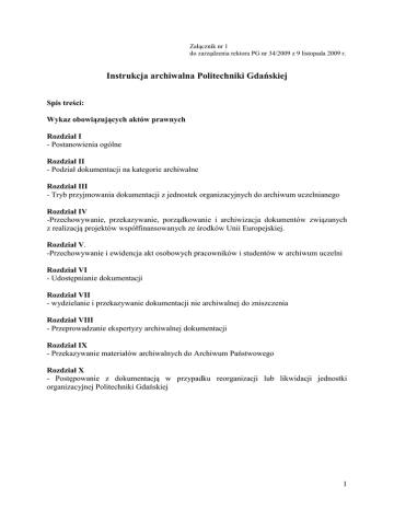 Załącznik nr 1 do zarządzenia rektora PG nr 34/2009 z 9 listopada 2009 r. Instrukcja archiwalna Politechniki Gdańskiej Spis treści: Wykaz obowiązujących aktów prawnych Rozdział I - Postanowienia ogólne Rozdział II - Podział dokumentacji na kategorie archiwalne Rozdział III - Tryb przyjmowania dokumentacji z jednostek organizacyjnych do archiwum uczelnianego Rozdział IV -Przechowywanie, przekazywanie, porządkowanie i archiwizacja dokumentów związanych z realizacją projektów współfinansowanych ze środków Unii Europejskiej. Rozdział V. -Przechowywanie i ewidencja akt osobowych pracowników i studentów w archiwum uczelni Rozdział VI - Udostępnianie dokumentacji Rozdział VII - wydzielanie i przekazywanie dokumentacji nie archiwalnej do zniszczenia Rozdział VIII - Przeprowadzanie ekspertyzy archiwalnej dokumentacji Rozdział IX - Przekazywanie materiałów archiwalnych do Archiwum Państwowego Rozdział X - Postępowanie z dokumentacją w przypadku reorganizacji lub likwidacji jednostki organizacyjnej Politechniki Gdańskiej 1 Wykaz obowiązujących aktów prawnych z zakresu postępowania z dokumentacją spraw załatwionych i funkcjonowania Działu Zasobów Archiwalnych 1. Ustawa z dnia 14 lipca 1983 r. o narodowym zasobie archiwalnym i archiwach (tekst jednolity Dz. U. Nr 97 z 2006 roku poz. 673 z późniejszymi zmianami) 2. Rozporządzenie Ministra Kultury z dnia 16 września 2002 roku w sprawie postępowania z dokumentacją, zasad jej klasyfikowania i kwalifikowania oraz zasad i trybu przekazywania materiałów archiwalnych do archiwów państwowych (Dz. U. Nr 167 poz. 1375) 3. Ustawa z dnia 29 września 1994 r. o rachunkowości (tekst jednolity Dz. U. nr 152 z 2009 r. poz. 1223) 4. Rozporządzenie Ministra Spraw Wewnętrznych i Administracji z dnia 21 kwietnia 2006 roku w sprawie ochrony przeciwpożarowej budynków, innych obiektów budowlanych i terenów (Dz. U. Nr 80 z 2006 roku poz. 563) 5. Ustawa z dnia 29 sierpnia 1997 r. o ochronie danych osobowych (tekst jednolity Dz. U. Nr 101 z 2002 roku poz. 926 z późniejszymi zmianami) 6. Ustawa z dnia 22 stycznia o ochronie informacji niejawnych (tekst jednolity Dz. U. Nr 196 z 2005 roku poz. 1631 z późniejszymi zmianami) 7. Ustawa z dnia 12 września 2002 roku o zmianie ustawy – Ordynacja podatkowa oraz o zmianie niektórych innych ustaw (Dz. U. Nr 169 poz. 1387 z późniejszymi zmianami) 8. Rozporządzenie Ministra Nauki i Szkolnictwa Wyższego z dnia 2 listopada 2006 r. w sprawie dokumentacji przebiegu studiów (Dz. U. Nr 224, poz. 1634 z późniejszymi zmianami) 9. Ustawa z dnia 4 lutego 1994 r. o prawie autorskim i prawach pokrewnych (tekst jednolity: Dz. U. Nr 90 z 2006 roku poz. 631 z późniejszymi zmianami) 10. Ustawa z dnia 27 lipca 2005 roku Prawo o szkolnictwie wyższym (Dz. U. Nr 164 poz. 1365 z późniejszymi zmianami) 11. Rozporządzenie z dnia 25 maja 1996 roku w sprawie zakresu prowadzenia przez pracowników dokumentacji w sprawach związanych ze stosunkiem pracy oraz sposobu prowadzenia akt osobowych (Dz. U. nr 62 poz. 286 wraz ze zmianami) Rozdział I: Postanowienia ogólne 1. 2. § 1. Instrukcja określa zasady i tryb postępowania z dokumentacją spraw załatwionych, powstających w związku z działalnością Politechniki Gdańskiej. Przedmiotem regulacji zawartych w instrukcji jest: a) tryb postępowania z dokumentacją spraw zakończonych, przekazywanych z jednostek organizacyjnych do Działu Zasobów Archiwalnych, b) zasady przechowywania, ewidencjonowania i udostępniania dokumentacji w Dziale Zasobów Archiwalnych, c) zasady przekazywania materiałów do archiwum państwowego, 2 d) zasady i tryb brakowania dokumentacji niearchiwalnej (tj. przygotowania do przekazania na makulaturę lub zniszczenie dokumentacji której okres przechowywania, zgodnie z obowiązującym w Politechnice Gdańskiej Jednolitym Rzeczowym Wykazem Akt, minął). 3. Instrukcja ustala zasady i sposób postępowania z dokumentacją spraw jawnych. 4. Tryb postępowania z dokumentacja niejawną regulują odrębne przepisy. 5. Użyte w instrukcji określenia oznaczają: a) akta sprawy – całą dokumentację (pisma, dokumenty, notatki, formularze, plany, rysunki itp.) zawierającą dane, informacje, które były, są lub mogą być istotne przy rozpatrywaniu danej sprawy, b) archiwum państwowe – Archiwum Państwowe w Gdańsku, c) Dział Zasobów Archiwalnych – powołany do gromadzenia, przechowywania, zabezpieczenia, ewidencjonowania i udostępniania dokumentacji spraw zakończonych, a także brakowania dokumentacji niearchiwalnej (akt kategorii B) i przekazywania materiałów archiwalnych (akt kategorii A) do archiwum państwowego, d) brakowanie dokumentacji niearchiwalnej – typowanie do zniszczenia dokumentacji o czasowym okresie przechowywania, e) dokument – akt mający znaczenie dowodu, ustanawiający uprawnienie lub stwierdzający prawdziwość określonych w nim zdarzeń bądź danych, f) dokumentacja niearchiwalna – wszelka dokumentacja o czasowym okresie przechowywania, nie stanowiąca materiałów archiwalnych, która po upływie obowiązującego okresu przechowywania podlega brakowaniu, g) jednolity rzeczowy wykaz akt – tematyczny podział akt powstających w toku działalności Politechniki Gdańskiej, określający w poszczególnych pozycjach symbol klasyfikacyjny i hasło rzeczowe oraz kategorię archiwalną, h) jednostka aktowa – tekturowa teczka wiązana lub segregator służący do przechowywania akt spraw jednorodnych lub pokrewnych tematycznie (obejmujących tą samą grupę spraw ustalonych w jednolitym rzeczowym wykazie akt), i) jednostka organizacyjna – Politechnika Gdańska, j) kategoria archiwalna – oznaczenie wartości archiwalnej dokumentacji – historycznej lub czasowej przy pomocy symboli „A”, „B”, „BE”, „Bc”, k) komórka organizacyjna – wydział, dział, sekcja, samodzielne stanowisko pracy wyodrębnione w strukturze Politechniki Gdańskiej, l) kwalifi