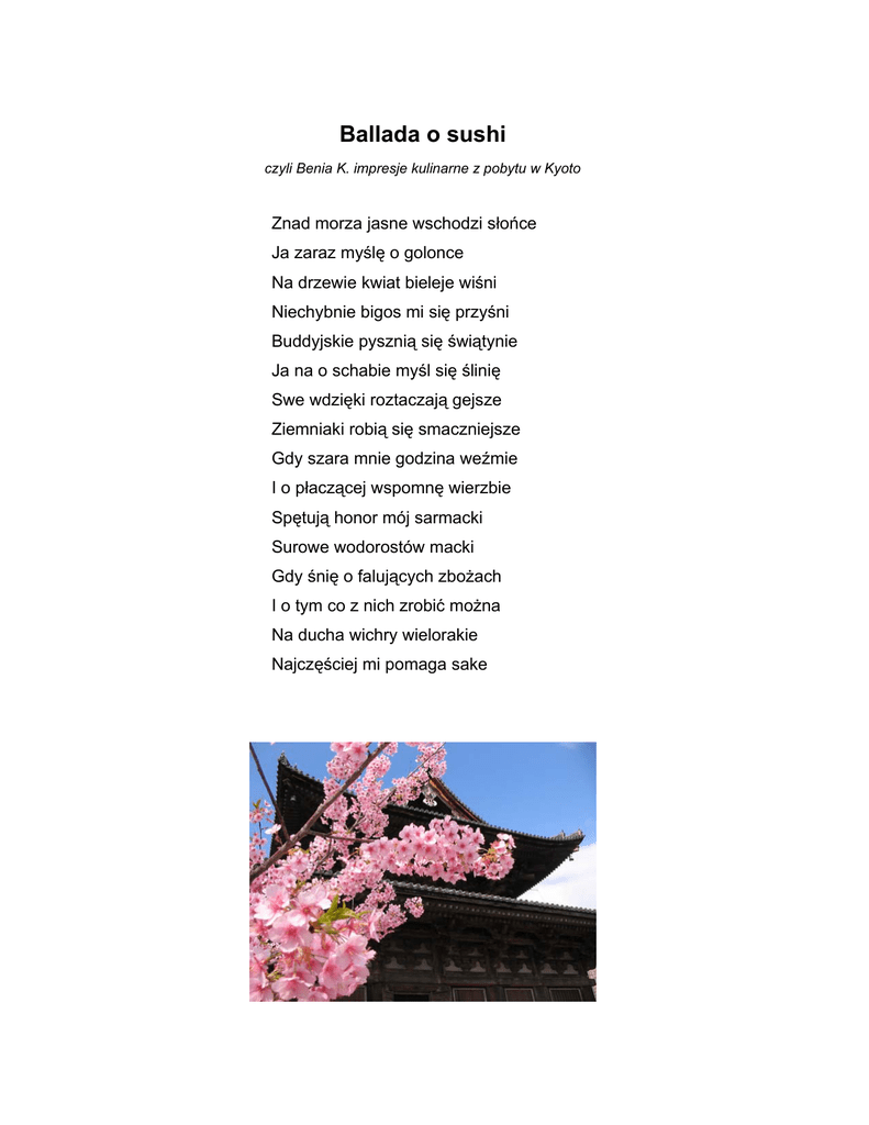 Ballada o sushi czyli Benia K. impresje kulinarne z pobytu w Kyoto Znad morza jasne wschodzi słońce Ja zaraz myślę o golonce Na drzewie kwiat bieleje wiśni Niechybnie bigos mi się przyśni Buddyjskie pysznią się świątynie Ja na o schabie myśl się ślinię Swe wdzięki roztaczają gejsze Ziemniaki robią się smaczniejsze Gdy szara mnie godzina weźmie I o płaczącej wspomnę wierzbie Spętują honor mój sarmacki Surowe wodorostów macki Gdy śnię o falujących zbożach I o tym co z nich zrobić można Na ducha wichry wielorakie Najczęściej mi pomaga sake