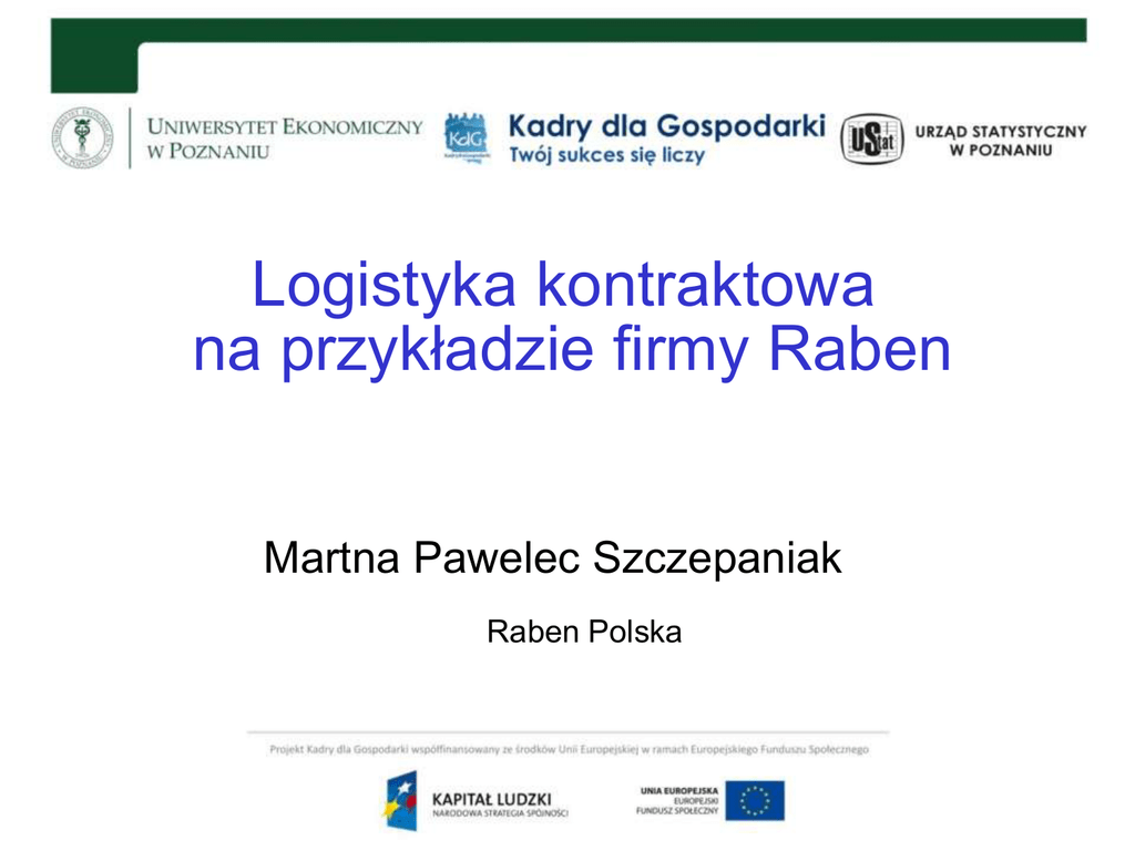 Logistyka kontraktowa na przykładzie firmy Raben Martna Pawelec Szczepaniak Raben Polska Poznań, 25.04. 2013 Omawiane aspekty podczas wykładu 1. Pochodzenie i historia 2. Rodzaje usług i obsługiwane branże 3. Dystrybucja Międzynarodowa 4. Logistyka Kontraktowa 5. Ćwiczenia 3 Obsługiwane branże • Automotive - części zamienne • Automotive - produkcja • chemia • art. spożywcze • kosmetyki • art.przemysłowe • retail 4 SPÓŁKI RABEN W EUROPIE • Grupa Raben w Niemczech • Grupa Raben w krajach Bałtyckich • Grupa Raben na Węgrzech • Grupa Raben w Czechach i na Słowacji • Grupa Raben w Holandii • Grupa Raben na Ukrainie • Grupa Raben w Polsce 5 SYSTEMY OPERACYJNE • Omówienie systemów operacyjnych • Projekt integrator • Projekt Track&Trace 6 Międzynarodowy transport drogowy • Sieć regularnych połączeń wahadłowych oraz współpraca z operatorami spedycyjnymi w Europie, umożliwia świadczenie usług eksportowo-importowych, dokonywanie odprawy celnej i dystrybucji towarów (z pominięciem magazynu Klienta). Inne usługi specjalne obejmują konsolidację ładunków przychodzących z różnych kierunków i od różnych konsygnantów, a następnie ich wysyłkę do kraju przeznaczenia. 7 Międzynarodowy transport drogowy • Grupa Raben specjalizuje się w międzynarodowym transporcie drogowym ładunków drobnicowych. Oferuje również przewóz ładunków całopojazdowych lub częściowych pojazdami o różnej zabudowie. • Grupa Raben posiada środki transportu przeznaczone do przewozu produktów żywnościowych i nieżywnościowych. Nowoczesna flota pojazdów spełnia wszelkie wymagania dotyczące warunków, w jakich powinny być przewożone poszczególne rodzaje towarów. 8 Połączenia Międzynarodowe • http://www.raben-group.com/europa-w-48h.html • Wyjazdy od i do partnerów czy spółek Raben codziennie, bądź kilka razy w tygodniu • Czas trwania transortu w Europie od 48 godzin (np.. Węgry, CZ, SK, DE) do 7 dni roboczych (np..Portugalia) • Turcja , Rosja, czy Ukraina w transporcie drobnicowym do 10 dni roboczych 9 Ostatnie osiągnięcia • CEO Grupy Raben - Ewald Raben Przedsiębiorcą Roku 2012 • Grupa Raben wybrana najlepszym europejskim dostawcą usług logistycznych dla sektora FMCG • Certyfikat SQAS dla Raben Transport Pod koniec sierpnia 2012 roku firma Raben Transport otrzymała prestiżowy certyfikat SQAS (Safety & Quality Assessment System). • Nowa inwestycja Grupy Raben w Pile W grudniu 2012 roku firma Raben Polska, która w Pile ma już swój oddział od kilkunastu lat, przeniosła swoją siedzibę na ulicę Wawelską. 10 PREZENTCACJA FILMÓW • PREZENTACJA FILMU NA TEMAT GRUPY RABEN • FILM TRANSPORT JEST POTRZEBNY • FILM OD PRODUCENTA DO KONSUMENTA. 11 Polska LOGISTYKA KONTRAKTOWA LOGISTYKA KONTRAKTOWA – CZYM JEST? • Administrowanie towarami żywnościowymi i nieżywnościowymi, jak również przygotowaniem transportów do dalszej dystrybucji • Dedykowane do obsługi Klientów indywidualne zespoły • Razem z usługami magazynowymi, Grupa Raben oferuje usługi międzynarodowego transportu drogowego (łącznie z odprawami celnymi i składami celnymi), dystrybucji krajowej, nowoczesne usługi przeładunkowe, transport morski i lotniczy • Grupa Raben ma w Europie ma do swojej dyspozycji ponad 1 000 000 m2 powierzchnii magazynowej klasy A, o zróżnicowanych warunkach składowania • Dzięki know-how i doświadczeniu na rynku lokalnym Grupa Raben dostarcza pełną gamę usług logistycznych 13 PRZYKŁADOWE CENTRUM DYSTRYBUCYJNE 14 Proces składania zamówienia… 15 PODSTAWOWE ZADANIA W MAGAZYNIE • Rozładunki dostaw • Przygotowywanie zleceń – kompletacja • Przesunięcia towaru w magazynie • Załadunki wysyłek 16 PRZYGOTOWANIE PALET FULL • pobranie palety z lokacji i skan etykiety paletowej • wybór drukarki, następnie skan etykiety na drukarce • odwiezienie palety na wskazane przez skaner miejsce odkładcze • potwierdzenie odłożenia palety na wskazane miejsce i skan lokacji 17 Załadunek towaru • przydział zadania • sprawdzenie zgodności naczepy • załadunek towaru • wypełnienie dokumentów i potwierdzenie ich podpisem i pieczątką 18 ROZŁADUNEK DOSTAW • podjazd do właściwej rampy • rozładowanie palet • sprawdzenie palet • ewentualne oklejenie palety CARRIEREM 19 JEŚLI …… • • • • • JESTEŚ OTWARTY NA LUDZI I NOWE WYZWANIA WŁADASZ JĘZYKIEM OBCYM INTERESUJE CIE PRACA W MIĘDZYNARODOWYM SRODOWISKU JESTEŚ ODPORNY NA STRES CHCESZ DOŁĄCZYĆ DO NASZYCH PRACOWNIKÓW I ZDOBYĆ BOGATE DOŚWIADCZENIE W DZIEDZINIE LOGISTYKI ZGŁOŚ SIĘ JUŻ TERAZ NA PRATKYKI 20 ĆWICZENIA 21 Dziękuję za uwagę! W razie pytań jesteśmy do Państwa dyspozycji. 22 Logistyka kontraktowa na przykładzie firmy Raben Martna Pawelec Szczepaniak Raben Polska 23