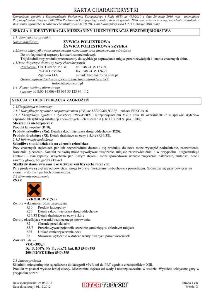 KARTA CHARAKTERYSTKI Sporządzono zgodnie z Rozporządzenie Parlamentu Europejskiego i Rady (WE) nr 453/2010 z dnia 20 maja 2010 roku zmieniający Rozporządzeniem (WE) nr 1907/2006 Parlamentu Europejskiego i rady z dnia 18 grudnia 2006 roku w sprawie oceny, udzielania zezwolenia i stosowania ograniczeń w zakresie chemikaliów (REACH) (DU Unii Europejskiej seria L 133 z 31maja 2010 roku) SEKCJA 1: IDENTYFIKACJA MIESZANINY I IDENTYFIKACJA PRZEDSIĘBIORSTWA 1.1 Identyfikator produktu Nazwa handlowa: ŻYWICA POLIESTROWA ŻYWICA POLIESTROWA SZYBKA 1.2Istotne zidentyfikowane zastosowania mieszaniny oraz zastosowania odradzane Do profesjonalnej naprawy karoserii samochodowej. Trójskładnikowy produkt przeznaczony do szybkiego naprawiania miejsc przerdzewiałych i łatania znacznych dziur. 1.3Dane dotyczące dostawcy karty charakterystyki Producent: TROTON Sp. z o. o. tel. +48 94 35 123 94 78-120 Gościno fax. +48 94 35 126 22 Ząbrowo 14A e-mail: [email protected] Osoba odpowiedzialna za sporządzenie karty charakterystyki: [email protected] 1.4 Numer telefonu alarmowego (czynny od 8:00-16:00)+48 094 35 123 94; 112 SEKCJA 2: IDENTYFIKACJA ZAGROŻEŃ 2.1Klasyfikacja mieszaniny 2.1.1 Klasyfikacja zgodnie z rozporządzeniem (WE) nr 1272/2008 [CLP] – zobacz SEKCJA16 2.1.2 Klasyfikacja zgodnie z dyrektywą 1999/45/WE i Rozporządzeniem MZ z dnia 10 września2012r w sprawie kryteriów i sposobu klasyfikacji substancji chemicznych i ich mieszanin (Dz. U. z 2012r. poz. 1018) Mieszanina niebezpieczna! Produkt łatwopalny (R10). Produkt szkodliwy (Xn). Działa szkodliwie przez drogi oddechowe (R20). Produkt drażniący (Xi). Działa drażniąco na oczy i skórę (R36/38). 2.1.3 Informacje dodatkowe Szkodliwe skutki działania na zdrowie człowieka: Przy znacznych stężeniach par lub bezpośrednim dostaniu się produktu do oczu może wystąpić podrażnienie, zaczernienie, łzawienie, pieczenie. Kontakt ze skórą może wywoływać swędzenie, miejsce zaczerwienienie, a w przypadku długotrwałego kontaktu – stan zapalny. Wdychanie par dużym stężeniu może spowodować uczucie zmęczenia, osłabienie, nudności, bóle i zawroty głowy, ból gardła i kaszel. Skutki działania związane z właściwościami fizykochemicznymi. Pary produktu są cięższe od powietrza, mogą tworzyć mieszaniny wybuchowe z powietrzem. Gromadzą się przy powierzchni ziemi i w dolnych partiach pomieszczeń. 2.2 Elementy oznakowania ZNAK SZKODLIWY (Xn) Zwroty wskazujące rodzaj zagrożenia: R10 Produkt łatwopalny R20 Działa szkodliwie przez drogi oddechowe R36/38 Działa drażniąco na oczy i skórę Zwroty określające warunki bezpiecznego stosowania: S2 Chronić przed dziećmi S3/7 Przechowywać pojemnik szczelnie zamknięty w chłodnym miejscu S25 Unikać zanieczyszczenia oczu S51 Stosować wyłącznie w dobrze wentylowanych pomieszczeniach Zawiera: styren VOC=395g/l Dz. U. 2007r. Nr 11, poz.72, kat. B/3 (540) 395 2004/42/WE IIB(c) (540) 395 2.3 Inne zagrożenia Składniki mieszaniny nie są zaliczone do kategorii vPvB ani do PBT zgodnie z załącznikiem XIII. Produkt w postaci wysoce-lepiej cieczy. Mieszanina cięższa od wody i nierozpuszczalna w wodzie. Wydziela toksyczne gazy w przypadku pożaru. Data sporządzenia: 26.06.2011 Data aktualizacji: 01.12.2012 Strona 1 z 8 Wersja: 2 SEKCJA 3: SKŁAD/INFORMACJE O SKŁADNIKACH 3.2Mieszaniny Skład/informacje o składnikach: Nazwa substancji: Styren Numer rejestracji REACH: brak danych nr indeksowy 601-026-00-0 nr CAS 100-42-5 nr WE 202-851-5 Ułamek masowy w% 25-40 Klasyfikacja zgodna z Dyrektywą 67/548/EWG Symbol Zwroty R Xn Xi R10 R20 R36/38 Klasyfikacja zgodna z Rozporządzeniem (WE)nr 1272/2008* Kody Klasy zwrotów zagrożenie i wskazujących kody kategorii rodzaj zagrożenia Flam. Liq. 3 Acute Tox. 4 Eye Irrit. 2 Skin Irrit. 2 H226 H332 H319 H315 Pełne brzmienie użytych zwrotów i symboli w sekcji 16 karty. *Rozporządzenie Parlamentu Europejskiego i Rady (WE) nr 1272/2008 z dnia 16 grudnia 2008r. w sprawie klasyfikacji, oznakowania i pakowania substancji i mieszanin, zmieniające i uchylające dyrektywy 67/548/EWG i 1999/45/WE oraz zmieniające rozporządzenie (WE) nr 1907/2006 (Dz. Urz. UE L 353 z 31 grudnia 2008r.z póz. zmianami). SEKCJA 4: ŚRODKI PIERWSZEJ POMOCY 4.1 Opis środków pierwszej pomocy Natychmiastowa pomoc lekarska nie jest konieczna. Wyprowadzić poszkodowanego na świeże powietrze. Zalecania ogólne: Powinny być przestrzegane środki ostrożności jak przy pracy z chemikaliami. Jeżeli wystąpią jakiekolwiek niepokojące objawy, wezwać pomoc medyczną. Symptomy zatrucia mogą wystąpić dopiero po kilku godzinach, dlatego kontrola lekarska jest niezbędna, co najmniej przez 48 godzin od wypadku. Po narażeniu inhalacyjnym: Wyprowadzić poszkodowanego na świeże powietrze, zapewnić spokój, okryć kocem. Jeżeli objawy nie ustępują, wezwać pomoc medyczną. W przypadku, gdy osoba poszkodowana jest nieprzytomna, ułożyć ją w pozycji bezpiecznej (np. pozycji bocznej ustalonej), niezwłocznie wezwać pomoc medyczną Po połknięciu: Wypłukać usta dużą ilością wody. Jeżeli nastąpi połknięcie, nie powodować wymiotów, ponieważ istnieje ryzyko zachłyśnięcia się i przedostania się substancji do płuc W przypadku połknięcia - zapewnić natychmiastową pomoc medyczną, pokazać kartę charakterystyki lub etykietę. W wyniku kontaktu z oczami: Wyjąć szkła kontaktowe, (jeśli są noszone). Przemyć oczy dużą ilością wody przez 10-15 minut, unikać silnego strumienia wody (ryzyko uszkodzenia rogówki). Nie używać żadnych płynów do przemywania oczu ani maści. Jeżeli utrzymują się podrażnienie, ból lub opuchlizna oczu lub światłowstręt osobę poszkodowaną należy skierować do lekarza okulisty. W wyniku kontaktu ze skórą: Natychmiast zdjąć zanieczyszczoną produktem odzież i buty. Miejsca narażone na kontakt lub tylko podejrzane o kontakt z produktem zmyć dużą ilością wody z mydłem. Nie 
