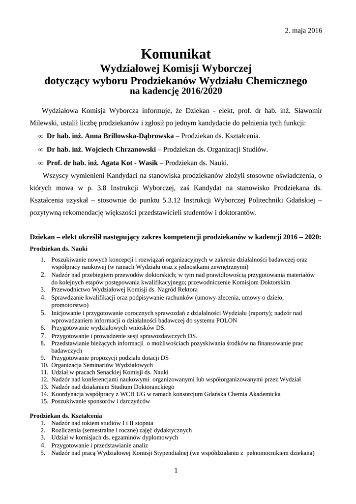 2. maja 2016 Komunikat Wydziałowej Komisji Wyborczej dotyczący wyboru Prodziekanów Wydziału Chemicznego na kadencję 2016/2020 Wydziałowa Komisja Wyborcza informuje, że Dziekan - elekt, prof. dr hab. inż. Sławomir Milewski, ustalił liczbę prodziekanów i zgłosił po jednym kandydacie do pełnienia tych funkcji: • Dr hab. inż. Anna Brillowska-Dąbrowska – Prodziekan ds. Kształcenia. • Dr hab. inż. Wojciech Chrzanowski – Prodziekan ds. Organizacji Studiów. • Prof. dr hab. inż. Agata Kot - Wasik – Prodziekan ds. Nauki. Wszyscy wymienieni Kandydaci na stanowiska prodziekanów złożyli stosowne oświadczenia, o których mowa w p. 3.8 Instrukcji Wyborczej, zaś Kandydat na stanowisko Prodziekana ds. Kształcenia uzyskał – stosownie do punktu 5.3.12 Instrukcji Wyborczej Politechniki Gdańskiej – pozytywną rekomendację większości przedstawicieli studentów i doktorantów. Dziekan – elekt określił następujący zakres kompetencji prodziekanów w kadencji 2016 – 2020: Prodziekan ds. Nauki 1. Poszukiwanie nowych koncepcji i rozwiązań organizacyjnych w zakresie działalności badawczej oraz współpracy naukowej (w ramach Wydziału oraz z jednostkami zewnętrznymi) 2. Nadzór nad przebiegiem przewodów doktorskich; w tym nad prawidłowością przygotowania materiałów do kolejnych etapów postępowania kwalifikacyjnego; przewodniczenie Komisjom Doktorskim 3. Przewodnictwo Wydziałowej Komisji ds. Nagród Rektora 4. Sprawdzanie kwalifikacji oraz podpisywanie rachunków (umowy-zlecenia, umowy o dzieło, promotorstwo) 5. Inicjowanie i przygotowanie corocznych sprawozdań z działalności Wydziału (raporty); nadzór nad wprowadzaniem informacji o działalności badawczej do systemu POLON 6. Przygotowanie wydziałowych wniosków DS. 7. Przygotowanie i prowadzenie sesji sprawozdawczych DS. 8. Przedstawianie bieżących informacji o możliwościach pozyskiwania środków na finansowanie prac badawczych 9. Przygotowanie propozycji podziału dotacji DS 10. Organizacja Seminariów Wydziałowych 11. Udział w pracach Senackiej Komisji ds. Nauki 12. Nadzór nad konferencjami naukowymi organizowanymi lub współorganizowanymi przez Wydział 13. Nadzór nad działaniem Studium Doktoranckiego 14. Koordynacja współpracy z WCH UG w ramach konsorcjum Gdańska Chemia Akademicka 15. Poszukiwanie sponsorów i darczyńców Prodziekan ds. Kształcenia 1. Nadzór nad tokiem studiów I i II stopnia 2. Rozliczenia (semestralne i roczne) zajęć dydaktycznych 3. Udział w komisjach ds. egzaminów dyplomowych 4. Przygotowanie i przedstawianie analiz 5. Nadzór nad pracą Wydziałowej Komisji Stypendialnej (we współdziałaniu z pełnomocnikiem dziekana) 1 6. Przygotowanie wniosków o stypendia dla najlepszych studentów finansowane ze źródeł zewnętrznych 7. Nadzór nad organizacją i funkcjonowaniem systemu studenckich praktyk zawodowych i badawczych – umowy z zakładami (we współpracy z pełnomocnikiem dziekana) 8. Współpraca z Samorządem Studenckim Prodziekan ds. Organizacji Studiów 1. Opracowywanie nowych koncepcji i rozwiązań organizacyjnych w zakresie dydaktyki 2. Kierowanie pracami Wydziałowej Komisji Programowej 3. Przygotowanie podziału na grupy i planów zajęć (przed rozpoczęciem kolejnego semestru); 4. Organizacja współpracy ze szkołami średnimi 5. Nadzór nad działaniem Wydziałowej Komisji Kwalifikacyjnej 6. Udział w pracach Senackiej Komisji ds. Kształcenia 7. Przygotowanie propozycji zasad przyjęcia na studia i limitów przyjęć 8. Przygotowanie uroczystych posiedzeń Rady Wydziału (inauguracja, wręczenie dyplomów) w tym propozycje wykładów inauguracyjnych oraz tzw. ostatnich wykładów 9. Nadzór nad programami oceny jakości kształcenia, w tym ankietyzacji i hospitacji 10. Współpraca z Samorządem Studenckim i Kołami Naukowymi działającymi przy Wydziale 11. Promocja działalności dydaktycznej Wydziału (w kraju i za granicą) 12. Nadzór nad przygotowaniem materiałów do postępowań akredytacyjnych 13. Opieka nad stroną domową Wydziału; opracowywanie materiałów promocyjnych; kontakty z publikatorami 14. Organizacja e-learningu (we współpracy z prodziekanem ds. Rozwoju) 15. Nadzór nad organizacją międzynarodowej i krajowej współpracy dydaktycznej, w tym w ramach programu ERASMUS 16. Poszukiwanie sponsorów i darczyńców Komisja Wyborcza przypomina, że wybory prodziekanów odbędą się we wtorek, 10. maja 2016 r., w Audytorium Chemicznym, w pierwszym terminie o godz. 12:15, w drugim terminie o godz. 13:30. Przewodniczący Wydziałowej Komisji Wyborczej Prof dr hab. inż. Jan Zielkiewicz 2