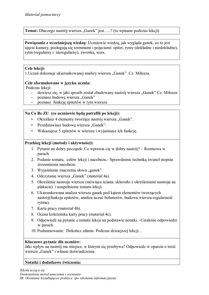 Materiał pomocniczy Temat: Dlaczego nastrój wiersza „Ganek” jest…..? (tu wpisane podczas lekcji) Powiązanie z wcześniejszą wiedzą: Uczniowie wiedzą, jak wygląda ganek, co to jest ujęcie kamery, posługują się terminami i pojęciami: epitet, rymy (dokładne i niedokładne), rytm (regularny i nieregularny), zwrotka, wers. Cele lekcji: 1.Uczeń dokonuje ukierunkowanej analizy wiersza „Ganek” Cz. Miłosza. Cele sformułowane w języku ucznia: Podczas lekcji: - dowiesz się, w jaki sposób został zbudowany nastrój wiersza „Ganek” Cz. Miłosza - poznasz budowę wiersza „Ganek” - poznasz funkcję epitetów w tym wierszu Na Co Be ZU (co uczniowie będą potrafili po lekcji): • Określasz 4 elementy tworzące nastrój wiersza „Ganek”. • Przedstawiasz budowę wiersza „Ganek”. • Wskazujesz 5 epitetów w wierszu i wyjaśniasz ich funkcję. Przebieg lekcji (metody i aktywności): 1. Pytanie na dobry początek: Co wprawia cię w dobry nastrój? – Rozmowa w parach. 2. Podanie tematu, celów lekcji i nacobezu.- Sprawdzenie techniką świateł stopnia zrozumienia nacobezu. 3. Wyjaśnienie znaczenia słowa „ganek”. 4. Odczytanie wiersza „Ganek” (materiał 4a). 5. Określenie nastroju wiersza (mówiąca ściana: sklerotki z określeniami nastroju na plakacie) i uzupełnienie tematu lekcji. 6. Ukierunkowana analiza wiersza ganek pod kątem elementów tworzących nastrój(funkcja epitetów, analiza uczuć bohaterów, budowa wiersza-regularność rytmu). 7. Karta pracy (materiał 4b). 8. Ocena koleżeńska karty pracy (materiał 4c). 9. Odpowiedź na pytanie z tematu lekcji na podstawie notatki. -Ustalenie odpowiedzi w parach. 10. Podsumowanie: Dokończ zdanie: Podczas dzisiejszej lekcji… Kluczowe pytanie dla uczniów: Jaki wpływ na nastrój ma miejsce, w którym się przebywa? Odpowiedz w oparciu o treść wiersza „Ganek” i własne doświadczenia. Notatki i dodatkowe ćwiczenia: Szkoła ucząca się Doskonalenie metod nauczania i oceniania IB: Ocenianie kształtującew praktyce (po szkoleniu informacyjnym) Materiał pomocniczy Notatka graficzna: Statyczne opisy Regularny rytm wiersza epitety Nastrój …………………. …………………. Zamknięta przestrzeń ganku, gdzie dzieci czuja się bezpieczne Beztroska zabawa dzieci Praca domowa: Jaki wpływ na nastrój ma miejsce, w którym się przebywa? Odpowiedz pisemnie w oparciu o treść wiersza „Ganek” i własne doświadczenia. Materiały i pomoce dydaktyczne: Tekst wiersza „Ganek” Cz. Miłosza, karta pracy, karta oceny koleżeńskiej. Szkoła ucząca się Doskonalenie metod nauczania i oceniania IB: Ocenianie kształtującew praktyce (po szkoleniu informacyjnym)