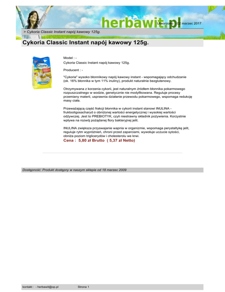 Utworzono : 02 marzec 2017 > Cykoria Classic Instant napój kawowy 125g. Cykoria Classic Instant napój kawowy 125g. Model : Cykoria Classic Instant napój kawowy 125g. Producent : "Cykoria" wysoko błonnikowy napój kawowy instant - wspomagający odchudzanie (ok. 16% błonnika w tym 11% inuliny), produkt naturalnie bezglutenowy. Otrzymywana z korzenia cykorii, jest naturalnym źródłem błonnika pokarmowego rozpuszczalnego w wodzie, genetycznie nie modyfikowana. Reguluje procesy przemiany materii, usprawnia działanie przewodu pokarmowego, wspomaga redukcję masy ciała. Przeważającą część frakcji błonnika w cykorii instant stanowi INULINA fruktooligosacharyd o obniżonej wartości energetycznej i wysokiej wartości odżywczej. Jest to PREBIOTYK, czyli niestrawny składnik pożywienia. Korzystnie wpływa na rozwój pożądanej flory bakteryjnej jelit. INULINA zwiększa przyswajanie wapnia w organizmie, wspomaga perystaltykę jelit, reguluje rytm wypróżnień, chroni przed zaparciami, wywołuje uczucie sytości, obniża poziom triglicerydów i cholesterolu we krwi. Cena : 5,80 zł Brutto ( 5,37 zł Netto) Dostępność: Produkt dostępny w naszym sklepie od 18 marzec 2009 kontakt : - [email protected] Strona 1