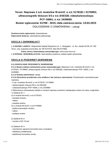file:///C:/Users/Szpital/AppData/Local/Microsoft/Windows/Tempo... Torun: Naprawa 2 szt. modulów M-miniC o n/s 5178181 i 5176993; ultrasonografu Voluson E6 o n/s D50328; videokolonoskopu PCF-160AL o n/s 2430660. Numer ogloszenia: 61788 - 2015; data zamieszczenia: 19.03.2015 OGLOSZENIE O ZAMÓWIENIU - uslugi Zamieszczanie ogloszenia: obowiazkowe. Ogloszenie dotyczy: zamówienia publicznego. SEKCJA I: ZAMAWIAJACY I. 1) NAZWA I ADRES: Wojewódzki Szpital Zespolony im. L. Rydygiera , ul. Sw. Józefa 53-59, 87-100 Torun, woj. kujawsko-pomorskie, tel. 56 6101510, faks 56 6101682. Adres strony internetowej zamawiajacego: www.wszz.torun.pl I. 2) RODZAJ ZAMAWIAJACEGO: Samodzielny publiczny zaklad opieki zdrowotnej. SEKCJA II: PRZEDMIOT ZAMÓWIENIA II.1) OKRESLENIE PRZEDMIOTU ZAMÓWIENIA II.1.1) Nazwa nadana zamówieniu pr zez zamawiajacego: Naprawa 2 szt. modulów M-miniC o n/s 5178181 i 5176993; ultrasonografu Voluson E6 o n/s D50328; videokolonoskopu PCF-160AL o n/s 2430660.. II.1.2) Rodzaj zamówienia: uslugi. II.1.4) Okreslenie przedm iotu oraz w ielkosci lub zak resu zam ówienia: Przedmiotem zamówienia jest naprawa: - 2 szt. modulów M-miniC o n/s 5178181 i 5176993 - ultrasonografu Voluson E6 o n/s D50328 - videokolonoskopu PCF-160AL o n/s 2430660 2.Wykonawca zobowiazany bedzie w ramach naprawy wymienic nastepujace czesci na nowe, oryginalne: 1) Zadanie Nr 1: a) w module M-miniC o n/s 5178181: - pompka modulu, - nafion, - pulapka wodna, b) w module M-miniC o n/s 5176993: - plytka pneumatyki modulu, - nafion, - pulapka wodna 2) Zadanie Nr 2: - monitor LCD 19 cali 3) Zadanie Nr 3: - mechanizm zginania koncówki wraz z kanalami, - obiektywy swiatlowodu, - plastikowa koncówka sondy, 1z5 2015-03-19 13:14 file:///C:/Users/Szpital/AppData/Local/Microsoft/Windows/Tempo... - linka regulacji sztywnosci. II.1.6) Wspólny Slownik Zamówien (CPV): 50.42.10.00-2. II.1.7) Czy dopuszcza sie zlozenie ofer ty czesciowej tak, liczba czesci: II.1.8) Czy dopuszcza sie zlozenie ofer ty wariantowej: nie. II.2) CZAS TRWANIA ZAMÓWIENIA LUB TERMIN WYK ONANIA: Okres w dniach: 20. SEKCJA III: INFORMACJE O CHARAKTERZE PRAWNYM, EKONOMICZNYM, FINANSOWYM I TECHNICZNYM III.1) WADIUM Informacja na tem at wadium : Zamawiajacy nie wymaga wnoszenia wadium. III.2) ZALICZKI III.3) WARUNKI UDZIALU W POSTEPOWANIU ORAZ OPIS SPOSOBU DOKONYWANIA OCENY SPELNIANIA TYCH WARUNKÓW III. 3.1) Uprawnienia do w yk ony wania okreslonej dzialalnosci lub czynnosci, jezeli przepisy prawa nak ladaja obowiazek ich posiadania Opis s posobu dokony wania oc eny spelniania tego warunku Zamawiajacy nie okresla szczególowego warunku udzialu. III.3.2) Wiedza i dos wiadc zenie Opis s posobu dokony wania oc eny spelniania tego warunku 1) W celu potwierdzenia warunku posiadania wiedzy i doswiadczenia Wykonawca zobowiazany jest zalaczyc w ofercie: a/ wykaz wykonanych min. 2 glównych uslug w zakresie napraw sprzetu medycznego o wartosci min. dla poszczególnych zadan: - Zadanie Nr 1 - 8.800,00 zl, - Zadanie Nr 2 - 10.400,00 zl, - Zadanie Nr 3 15.600,00 zl, brutto kazda usluga w okresie ostatnich trzech lat przed uplywem terminu skladania ofert, a jezeli okres prowadzenia dzialalnosci jest krótszy - w tym okresie, wraz z podaniem ich wartosci, przedmiotu, dat wykonania i podmiotów, na rzecz których uslugi zostaly wykonane oraz zalaczenia min. 2 dowodów, czy zostaly wykonane nalezycie; Wykonawca skladajacy oferte na kilka zadan musi wykazac sie zrealizowanymi min. 2 uslugami o wymaganej wartosci lacznej równej sumie tych zadan. Jezeli Wykonawca wykazujac spelnianie tego warunku polegac bedzie na zasobach innych podmiotów na zasadach okreslonych w art. 26 ust. 2 b ustawy, Zamawiajacy zada przedstawienia w odniesieniu do tych podmiotów dokumentów stwierdzajacych, ze do tych podmiotów nie zachodza okolicznosci wskazane w art. 24 ust. 1 pkt 2 ustawy - Pzp. Jezeli z uzasadnionej przyczyny o obiektywnym charakterze Wykonawca nie jest w stanie uzyskac poswiadczenia o nalezytym zrealizowaniu uslugi moze zlozyc oswiadczenie. W przypadku, gdy Zamawiajacy jest podmiotem, na rzecz którego uslugi wskazane w wykazie uslug zostaly wczesniej wykonane Wykonawca nie ma obowiazku przedkladania dowodów o ich nalezytym wykonaniu. III.3.3) Potencjal techniczny Opis s posobu dokony wania oc eny spelniania tego warunku Zamawiajacy nie okresla szczególowego warunku udzialu. III.3.4) Osoby zdolne do w ykonania zamówienia Opis s posobu dokony wania oc eny spelniania tego warunku a) oswiadczenie, ze osoba/osoby, które beda uczestniczyc w wykonywaniu zamówienia posiadaja wymagane uprawnienia do realizowania uslugi bedacej przedmiotem zamówienia - zgodnie z zalacznikiem Nr 8 do SIWZ. 2z5 2015-03-19 13:14 file:///C:/Users/Szpital/AppData/Local/Microsoft/Windows/Tempo... III.3.5) Sytuacja ekonomiczna i finansowa Opis s posobu dokony wania oc eny spelniania tego warunku Zamawiajacy nie okresla szczególowego warunku udzialu III.4) INFORMACJA O OSWIADCZENIACH LUB DOKUMENTACH, JA KIE MAJA DOSTARCZYC WYKONAWCY W CELU POTWIERDZENIA SPELNIANIA WARUNKÓW UDZIALU W POSTEPOWANIU ORAZ NIEPODLEGANIA WYKLUCZENIU NA PODSTAWIE ART. 24 UST. 1 USTAWY III.4.1) W zakres ie wy kazania spelniania przez w ykonawce warunków, o który ch m ow a w art. 22 ust. 1 ustawy, oprócz oswiadc zenia o spelnianiu warunk ów udzialu w postepowaniu nalezy przedlozy c: wykaz wykonanych, a w przypadku swiadczen okresowych lub ciaglych równiez wykonywanych, glównych dostaw lub uslug, w okresie ostatnich trzech lat przed uplywem terminu skladania ofert albo wniosków o dopuszczenie do udzialu w postepowaniu, a jezeli okres prowadzenia dzialalnosci jest krótszy - w tym okresie, wraz z podaniem ich wartosci, przedmiotu, dat wykonania i podmiotów, na rzecz których dostawy lub uslugi zostaly wykonane, oraz zalaczeniem dowodów, czy zostaly wykonane lub sa wykonywane nalezycie; oswiadczenie, ze osoby, które beda uczestniczyc w wykonywaniu zamówienia, posiadaja wymagane uprawnienia, jezeli ustawy nakladaja o
