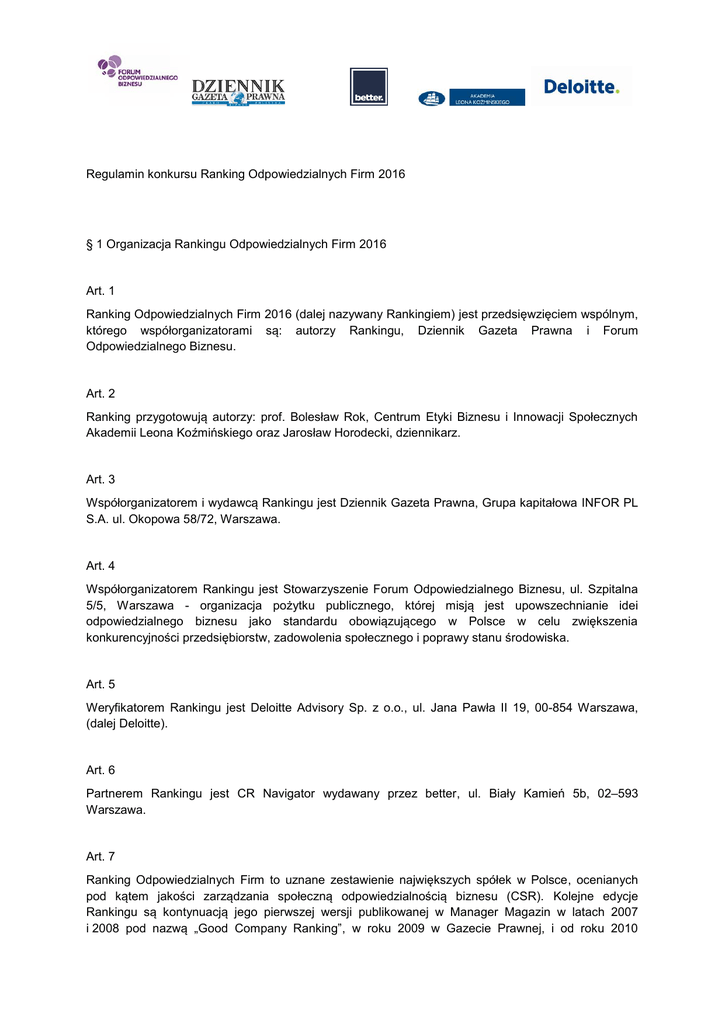 Regulamin konkursu Ranking Odpowiedzialnych Firm 2016 § 1 Organizacja Rankingu Odpowiedzialnych Firm 2016 Art. 1 Ranking Odpowiedzialnych Firm 2016 (dalej nazywany Rankingiem) jest przedsięwzięciem wspólnym, którego współorganizatorami są: autorzy Rankingu, Dziennik Gazeta Prawna i Forum Odpowiedzialnego Biznesu. Art. 2 Ranking przygotowują autorzy: prof. Bolesław Rok, Centrum Etyki Biznesu i Innowacji Społecznych Akademii Leona Koźmińskiego oraz Jarosław Horodecki, dziennikarz. Art. 3 Współorganizatorem i wydawcą Rankingu jest Dziennik Gazeta Prawna, Grupa kapitałowa INFOR PL S.A. ul. Okopowa 58/72, Warszawa. Art. 4 Współorganizatorem Rankingu jest Stowarzyszenie Forum Odpowiedzialnego Biznesu, ul. Szpitalna 5/5, Warszawa - organizacja pożytku publicznego, której misją jest upowszechnianie idei odpowiedzialnego biznesu jako standardu obowiązującego w Polsce w celu zwiększenia konkurencyjności przedsiębiorstw, zadowolenia społecznego i poprawy stanu środowiska. Art. 5 Weryfikatorem Rankingu jest Deloitte Advisory Sp. z o.o., ul. Jana Pawła II 19, 00-854 Warszawa, (dalej Deloitte). Art. 6 Partnerem Rankingu jest CR Navigator wydawany przez better, ul. Biały Kamień 5b, 02–593 Warszawa. Art. 7 Ranking Odpowiedzialnych Firm to uznane zestawienie największych spółek w Polsce, ocenianych pod kątem jakości zarządzania społeczną odpowiedzialnością biznesu (CSR). Kolejne edycje Rankingu są kontynuacją jego pierwszej wersji publikowanej w Manager Magazin w latach 2007 i 2008 pod nazwą „Good Company Ranking”, w roku 2009 w Gazecie Prawnej, i od roku 2010 w Dziennik Gazeta Prawna. Wszystkie edycje były przygotowywane przez autorów Rankingu: Bolesława Roka i Jarosława Horodeckiego. § 2 Warunki uczestnictwa w Rankingu Art. 1 Ranking jest przeprowadzany raz w roku, w pierwszym kwartale. Art. 2 Ankieta jest rozsyłana z inicjatywy podmiotów odpowiedzialnych za organizację Rankingu przede wszystkim do największych przedsiębiorstw ujętych w ostatnim rankingu Rzeczpospolitej „Lista 500”, a także do innych, wybranych spółek działających w Polsce. Art. 3 Uczestnictwo w Rankingu jest bezpłatne i dobrowolne. Wypełnianie ankiety przez upoważnionego przedstawiciela spółki odbywa się zgodnie z zasadami należytej staranności i etyki zawodowej. Na każde pytanie należy udzielić jednej odpowiedzi w wyznaczonym miejscu. Art. 4 Uczestnictwo w Rankingu jest równoznaczne z wyrażeniem zgody na przekazanie drogą elektroniczną Organizatorom i Deloitte informacji o spółce dotyczących systemu społecznej odpowiedzialności oraz dokumentów potrzebnych do weryfikacji wybranych odpowiedzi zawartych w ankiecie na przetwarzanie danych dla celów postępowania konkursowego i publikacji wyników zbiorczych. Uczestnik przystępując do Konkursu wyraża zgodę na umożliwienie przedstawicielom Organizatora oraz Deloitte kontaktu z odpowiednimi przedstawicielami Uczestnika. Indywidualne wyniki spółki nie będą ujawniane, zaś do publikacji oraz analiz benchmarkingowych prowadzonych przez autorów Rankingu dla celów naukowych, edukacyjnych i doradczych mogą być wykorzystywane wyłącznie wyniki zbiorcze (patrz też § 3 Art. 4). Art. 5 Zwrócenie organizatorom wypełnionej ankiety jest równoznaczne z wyrażeniem zgody na przeprowadzenie weryfikacji przedstawionych danych przez Deloitte. § 3 Metodologia Rankingu Art. 1 Ranking jest sporządzany na podstawie ankiety zawierającej pytania zamknięte. W tegorocznej ankiecie zawartych jest 60 pytań zamkniętych, jednokrotnego wyboru, z następujących pięciu obszarów CSR: odpowiedzialne przywództwo, zaangażowanie społeczne, komunikacja z interesariuszami, odpowiedzialna innowacyjność oraz odpowiedzialne zarządzanie. Art. 2 Ankieta jest modyfikowana corocznie, z uwzględnieniem zmian zachodzących na rynku, zwiększania się ilości firm z poszczególnych branż zaangażowanych w proces wdrażania rozwiązań z zakresu CSR, a także uwag i sugestii wyrażanych przez uczestników wcześniejszych edycji Rankingu oraz partnerów. Ankieta nie jest przeznaczona do użytku publicznego i nie powinna być rozpowszechniana. Art. 3 Poszczególnym odpowiedziom jest przypisana odpowiednia liczba punktów, w zależności od wagi pytania. Autorzy Rankingu i ankiety nie ujawniają ilości punktów, które można zdobyć udzielając odpowiedzi na dane pytanie. Punkty są przyznawane wyłącznie za jednoznacznie udzielone odpowiedzi. W każdej z kategorii: odpowiedzialne przywództwo, zaangażowanie społeczne, komunikacja z interesariuszami, odpowiedzialna innowacyjność można zdobyć maksymalnie 100 punktów, a w obszarze: odpowiedzialne zarządzanie można zdobyć maksymalnie 200 punktów. Łącznie w Rankingu można uzyskać maksymalnie 600 punktów. Regulamin Rankingu stanowi załącznik do ankiety z pytaniami. Art. 4 Ranking jest publikowany w ujęciu zbiorczym i w ujęciu branżowym (nie mniej niż 6 branż), przedstawiając łączną punktację każdej firmy w poszczególnych obszarach CSR oraz sumę uzyskanych punktów. Publikowana jest też pozycja danej firmy w poprzednich edycjach. Art. 5 Rankingowi towarzyszy zestawienie „Lista Firm Społecznie Odpowiedzialnych 2016”. „Lista” jest skierowana do firm mniej zaawansowanych we wdrażaniu poszczególnych instrumentów CSR, które nie brały wcześniej udziału w Rankingu, w żadnej ze wcześniejszych edycji, bądź biorąc udział nie uzyskały nigdy więcej niż 50% maksymalnej punktacji. „Lista” obejmuje te firmy, które wypełniły wyłącznie uproszczoną i skróconą wersję ankiety – ankieta ta składa się z 8 pytań ogólnych oraz 7 pytań szczegółowych w jednej z trzech, dowolnie przez firmę wybranej, grupy pytań. W ramach „Listy” można uzyskać maksymalnie 100 punktów. Lista publikowana jest wyłącznie w ujęciu zbiorczym. Wszystkie pozostałe warunki są identyczne jak dla uczestników Rankingu. Art. 6 Wypeł