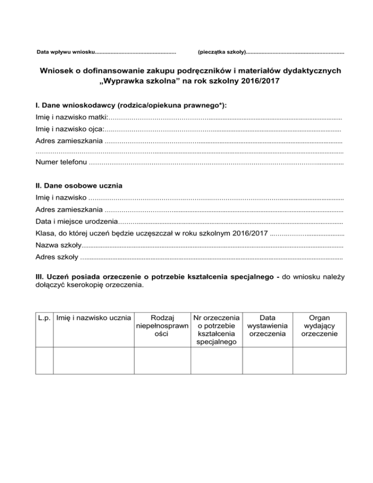 Data wpływu wniosku.................................................... (pieczątka szkoły)............................................................... Wniosek o dofinansowanie zakupu podręczników i materiałów dydaktycznych „Wyprawka szkolna” na rok szkolny 2016/2017 I. Dane wnioskodawcy (rodzica/opiekuna prawnego*): Imię i nazwisko matki:…………………………………………............................................................................. Imię i nazwisko ojca:….………………………………………….......................................................................... Adres zamieszkania ………………………………………................................................................................... …………………………………………………............................................................................................................. Numer telefonu ………………………………………………….……………………………………………................ II. Dane osobowe ucznia Imię i nazwisko ……………………………………….………….……………………………..................................... Adres zamieszkania …………………………….................................................................................................. Data i miejsce urodzenia………....................................................................................................................... Klasa, do której uczeń będzie uczęszczał w roku szkolnym 2016/2017 ..…….………...................... Nazwa szkoły....................................................................................................................................................... Adres szkoły ….................................................................................................................................................... III. Uczeń posiada orzeczenie o potrzebie kształcenia specjalnego - do wniosku należy dołączyć kserokopię orzeczenia. L.p. Imię i nazwisko ucznia Rodzaj Nr orzeczenia niepełnosprawn o potrzebie ości kształcenia specjalnego Data wystawienia orzeczenia Organ wydający orzeczenie Oświadczenia: Świadomy(a) odpowiedzialności karnej przewidzianej w art. 233 § 1 ustawy z dnia 6 czerwca 1997 r. Kodeks Karny (Dz. U. z 1997 r. Nr 88, poz. 553 z późn. zm.), potwierdzam własnoręcznym podpisem prawdziwość danych zamieszczonych we wniosku pod rygorem odpowiedzialności karnej. Oświadczam, iż wyrażam zgodę na przetwarzanie podanych danych osobowych zawartych we wniosku, na zasadach określonych w ustawie z dnia 29 sierpnia 1997 r. o ochronie danych osobowych (Dz. U. z 2014 r. poz. 1182 z późn. zm.) prowadzonych przez Szkołę oraz Urząd Miejski w Sokółce, w związku z ubieganiem się o przyznanie dofinansowania na zakup podręczników „Wyprawka szkolna 2016”. Po zakwalifikowaniu wniosku o „Wyprawkę szkolną 2016” i przedłożeniu odpowiednich rachunków (faktur) należność proszę przekazać na konto bankowe nr ................................................................................................................................................... którego właścicielem jest........................................................................................................... ____________________________________ (miejscowość, data) _______________________________________ (czytelny podpis Wnioskodawcy) Adnotacje Dyrektora szkoły: Wniosek wraz z załącznikami sprawdzono pod względem formalnym, merytorycznym i rachunkowym, prawidłowo opisano przedłożone faktury (rachunki) dotyczące zakupu podręczników i materiałów dydaktycznych: ------------------------------------------------(miejscowość, data) Przyznana kwota dofinansowania = -----------------------------------------(pieczęć Dyrektora szkoły) ________________________________PLN słownie:_______________________________________________________________ _____________________________________________________________________ -----------------------------------------(miejscowość, data) ------------------------------------------(pieczęć Dyrektora szkoły)