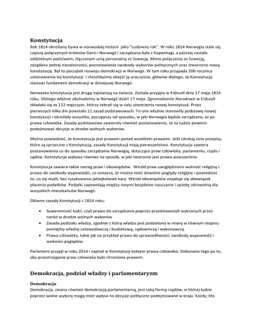 Konstytucja Rok 1814 określany bywa w norweskiej historii jako ”cudowny rok”. W roku 1814 Norwegia stała się częścią połączonych królestw Danii i Norwegii i zarządzana była z Kopenhagi, a później została oddzielnym państwem, złączonym unią personalną ze Szwecją. Mimo połączenia ze Szwecją, zażądano pełnej niezależności, pozostawienia swobody wyborów politycznych oraz stworzono nową konstytucję. Był to początek rozwoju demokracji w Norwegii. W tym roku przypada 200 rocznica ustanowienia tej konstytucji i chcielibyśmy obejść ją uroczyście, głównie dlatego, że Konstytucja stanowi fundament demokracji w dzisiejszej Norwegii. Norweska konstytucja jest drugą najstarszą na świecie. Została przyjęta w Eidsvoll dnia 17 maja 1814 roku. Dlatego właśnie obchodzimy w Norwegii dzień 17 maja. Zgromadzenie Narodowe w Eidsvoll składało się ze 112 mężczyzn, którzy zebrali się w celu utworzenia nowej konstytucji. Przez pierwszych kilka dni powstało 11 zasad podstawowych. To one właśnie stanowiły podstawę nowej konstytucji i określały wszystko, począwszy od sposobu, w jaki Norwegia będzie zarządzana, aż po prawa człowieka. Zasady podstawowe zawierały również postanowienie, że to ludzie powinni podejmować decyzje w drodze wolnych wyborów. Można powiedzieć, że Konstytucja jest prawem ponad wszelkimi prawami. Jeśli istnieją inne przepisy, które są sprzeczne z Konstytucją, zasady Konstytucji mają pierwszeństwo. Konstytucja zawiera postanowienia co do sposobu zarządzania Norwegią, dotyczące praw człowieka, parlamentu, rządu i sądów. Konstytucja wpływa również na sposób, w jaki tworzone jest prawo powszechne. Konstytucja zawiera także szereg praw i obowiązków. Wśród praw uwzględniono wolność religijną i prawo do swobody wypowiedzi, co oznacza, że można mieć dowolne poglądy religijne i powiedzieć to, co się myśli, bez ryzykowania jakiejkolwiek kary. Wśród obowiązków znajduje się obowiązek płacenia podatków. Podatki zapewniają między innymi bezpłatne nauczanie i opiekę zdrowotną dla wszystkich mieszkańców Norwegii. Główne zasady Konstytucji z 1814 roku: Suwerenność ludzi, czyli prawo do zarządzania poprzez przedstawicieli wybranych przez naród w drodze wolnych wyborów Zasada podziału władzy, zgodnie z którą władza jest podzielona w miarę w równym stopniu pomiędzy władzę ustawodawczą i budżetową, sądowniczą i wykonawczą Prawa człowieka, takie jak na przykład prawo do sprawiedliwości, swobody wypowiedzi i wolności poglądów Parlament przyjął w roku 2014 i zapisał w Konstytucji kolejne prawa człowieka. Dokonano tego po to, aby przestrzeganie praw człowieka było chronione prawem. Demokracja,podziałwładzyiparlamentaryzm Demokracja Demokracja, zwana również demokracją parlamentarną, jest taką formą rządów, w której ludzie poprzez wolne wybory mogą mieć wpływ na decyzje polityczne podejmowane w kraju. Każdy, kto skończył 18 lat w roku, w którym przypadają wybory, może głosować. Masz wówczas możliwość głosowania na partię, która ci odpowiada i nikt nie będzie wiedział, na kogo głosujesz. Każdy z uprawnionych do głosowania ma jeden głos. Jest to podstawową zasadą demokratycznych wyborów. Poprzez wybory ustanawia się władzę ustawodawczą – parlament (Storting). Zasadapodziałuwładzy We wszystkich społeczeństwach zawsze jedni mają większą władzę od innych. W nowoczesnej demokracji norweskiej władza jest podzielona zgodnie z regułą, którą nazywamy zasadą podziału władzy. Władza dzieli się pomiędzy trzy różne instytucje: ustawodawczą i budżetową, wykonawczą i sądowniczą. Władzę legislacyjną i budżetową sprawuje parlament, który może zmieniać istniejące prawa i wprowadzać nowe. Aby podjąć decyzję o wprowadzeniu w Norwegii nowej ustawy, należy uzyskać większość głosów za propozycją ustawy spośród 169 przedstawicieli partii w parlamencie. Zmiany w Konstytucji wymagają większości 2/3 głosów. Władzę wykonawczą sprawuje rząd. Rząd wprowadza w życie projekty, które zdobyły większość w parlamencie, na przykład zwiększenie nakładów na edukację, służbę zdrowia i drogi w Norwegii. W październiku każdego roku rząd przedstawia również budżet państwa, z którego wynika, ile pieniędzy i na jakie cele Norwegia może wydać w następnym roku. Władzę sądowniczą sprawują sądy. Na podstawie praw przyjętych przez parlament, sądy mogą skazywać ludzi za różnego rodzaju czyny karalne. Podział władzy jest ważny, więc parlament, rząd i sądy muszą być niezależne od siebie. Oznacza to, że żadna z tych trzech instytucji nie może mieszać się w to, co robią pozostałe. Na przykład, sądy nie mogą wywierać presji na parlament w celu zaostrzenia kar za czyny karalne. Maktfordelingsprinsippet. Kilde: Store Norske Leksikon Parlamentaryzm Parlamentaryzm stanowi formę rządów politycznych. To, że Norwegia jest krajem rządów parlamentarnych oznacza, że określony rząd sprawuje swoją funkcję tak długo, dopóki zezwala na to większość Zgromadzenia Narodowego. Zgromadzenie Narodowe jest demokratycznie wybranym organem państwowym, a w przypadku Norwegii jest to parlament (Stortinget). Znamy pojęcie parlamentaryzmu mniejszościowego i większościowego. W praktyce oznacza to rządy mniejszości i większości. Rządy mniejszości mamy wtedy, gdy rząd nie ma przewagi w parlamencie, a większości, kiedy rząd ma przewagę w parlamencie.