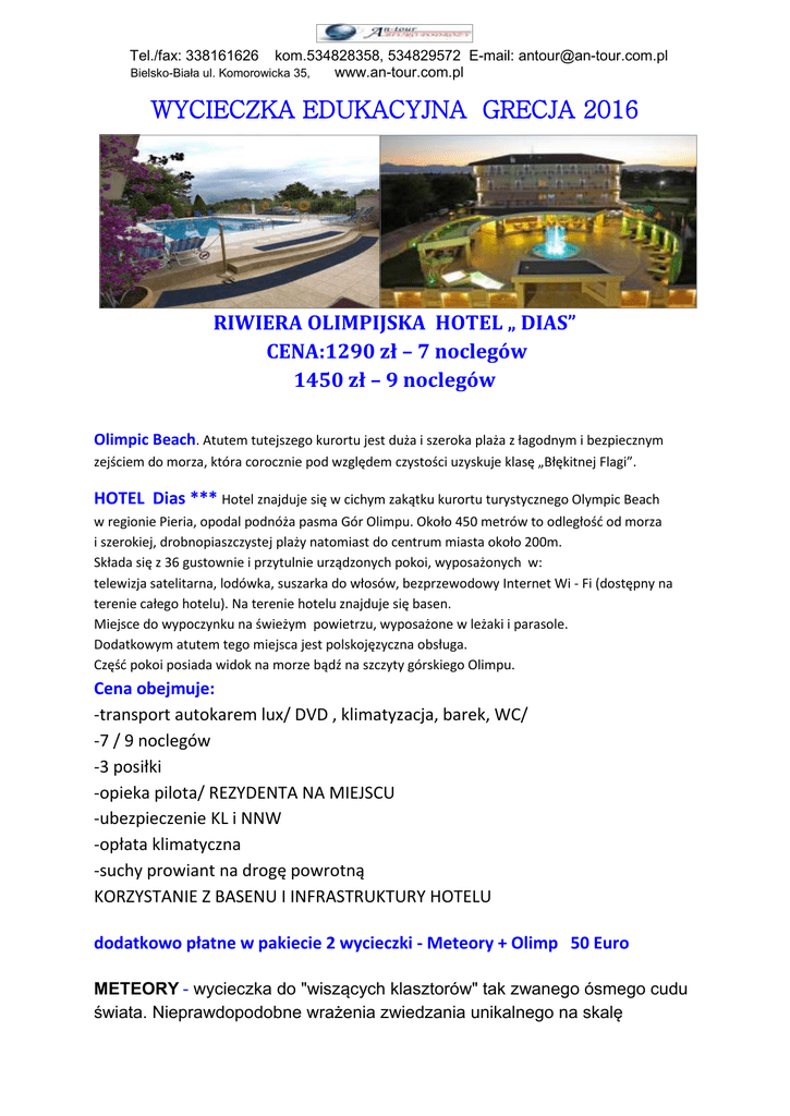 Tel./fax: 338161626 kom.534828358, 534829572 E-mail: [email protected] www.an-tour.com.pl Bielsko-Biała ul. Komorowicka 35, WYCIECZKA EDUKACYJNA GRECJA 2016 RIWIERA OLIMPIJSKA HOTEL „ DIAS” CENA:1290 zł – 7 noclegów 1450 zł – 9 noclegów Olimpic Beach. Atutem tutejszego kurortu jest duża i szeroka plaża z łagodnym i bezpiecznym zejściem do morza, która corocznie pod względem czystości uzyskuje klasę „Błękitnej Flagi”. HOTEL Dias *** Hotel znajduje się w cichym zakątku kurortu turystycznego Olympic Beach w regionie Pieria, opodal podnóża pasma Gór Olimpu. Około 450 metrów to odległość od morza i szerokiej, drobnopiaszczystej plaży natomiast do centrum miasta około 200m. Składa się z 36 gustownie i przytulnie urządzonych pokoi, wyposażonych w: telewizja satelitarna, lodówka, suszarka do włosów, bezprzewodowy Internet Wi - Fi (dostępny na terenie całego hotelu). Na terenie hotelu znajduje się basen. Miejsce do wypoczynku na świeżym powietrzu, wyposażone w leżaki i parasole. Dodatkowym atutem tego miejsca jest polskojęzyczna obsługa. Część pokoi posiada widok na morze bądź na szczyty górskiego Olimpu. Cena obejmuje: -transport autokarem lux/ DVD , klimatyzacja, barek, WC/ -7 / 9 noclegów -3 posiłki -opieka pilota/ REZYDENTA NA MIEJSCU -ubezpieczenie KL i NNW -opłata klimatyczna -suchy prowiant na drogę powrotną KORZYSTANIE Z BASENU I INFRASTRUKTURY HOTELU dodatkowo płatne w pakiecie 2 wycieczki - Meteory + Olimp 50 Euro METEORY - wycieczka do "wiszących klasztorów" tak zwanego ósmego cudu świata. Nieprawdopodobne wrażenia zwiedzania unikalnego na skalę Tel./fax: 338161626 kom.534828358, 534829572 E-mail: [email protected] www.an-tour.com.pl Bielsko-Biała ul. Komorowicka 35, światową masywu skalnego z "przylepionymi" do niego bizantyjskimi klasztorami. Ponadto wizyta w prawdziwej wytwórni bizantyjskich ikon, połączona z pokazem metod ich wytwarzania oraz możliwością zakupów. W klasztorach do Panstwa dyspozycji jest dodatkowy przewodnik. OLIMP Paleos Panteleimon. Mityczna siedziba dwunastu bogów, Park Narodowy uznany przez UNESCO zabytkiem międzynarodowej biosfery z unikatowymi ekosystemami. Spacer z Litochoro przepięknym wąwozem rzeki Enipeas, pozwoli Państwu poznać uroki przyrody. Po spacerze greckie danie oraz szklanka boskiego wina w tradycyjnej wiosce, skąd można podziwiać Zalew Thermajcki.