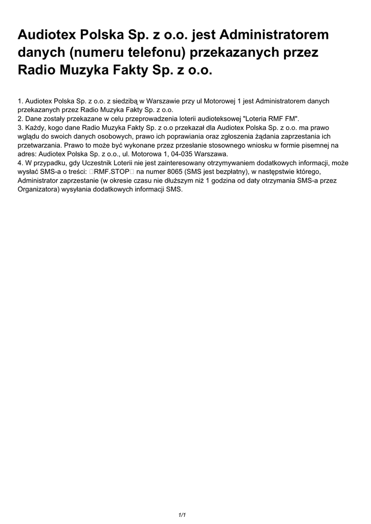 Audiotex Polska Sp. z o.o. jest Administratorem danych (numeru telefonu) przekazanych przez Radio Muzyka Fakty Sp. z o.o. 1. Audiotex Polska Sp. z o.o. z siedzibą w Warszawie przy ul Motorowej 1 jest Administratorem danych przekazanych przez Radio Muzyka Fakty Sp. z o.o. 2. Dane zostały przekazane w celu przeprowadzenia loterii audioteksowej "Loteria RMF FM". 3. Każdy, kogo dane Radio Muzyka Fakty Sp. z o.o przekazał dla Audiotex Polska Sp. z o.o. ma prawo wglądu do swoich danych osobowych, prawo ich poprawiania oraz zgłoszenia żądania zaprzestania ich przetwarzania. Prawo to może być wykonane przez przesłanie stosownego wniosku w formie pisemnej na adres: Audiotex Polska Sp. z o.o., ul. Motorowa 1, 04-035 Warszawa. 4. W przypadku, gdy Uczestnik Loterii nie jest zainteresowany otrzymywaniem dodatkowych informacji, może wysłać SMS-a o treści: RMF.STOP na numer 8065 (SMS jest bezpłatny), w następstwie którego, Administrator zaprzestanie (w okresie czasu nie dłuższym niż 1 godzina od daty otrzymania SMS-a przez Organizatora) wysyłania dodatkowych informacji SMS. 1/1