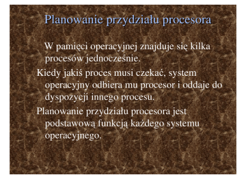 Planowanie przydziału procesora W pamięci operacyjnej znajduje się kilka procesów jednocześnie. Kiedy jakiś proces musi czekać, system operacyjny odbiera mu procesor i oddaje do dyspozycji innego procesu. Planowanie przydziału procesora jest podstawową funkcją każdego systemu operacyjnego. Fazy procesora i wejścia-wyjścia załaduj przechowaj dodaj przechowaj czytaj z pliku Czekaj na urządzenie wejścia-wyjścia przechowaj dodaj zwiększ indeks pisz do pliku Czekaj na urządzenie wejścia-wyjścia załaduj przechowaj dodaj przechowaj czytaj z pliku Czekaj na urządzenie wejścia-wyjścia Faza procesora Faza wejścia-wyjścia Faza procesora Faza wejścia-wyjścia Faza procesora Faza wejścia-wyjścia Czasy faz procesora 140 120 100 80 60 40 Czas trwania fazy 15 13 11 9 7 5 0 3 20 1 Cz ę s to ś ć wys tę po wania faz y 160 Planowanie przydziału procesora Proces ograniczony przez wejście-wyjście ma zazwyczaj dużo krótkich faz procesora. Proces ograniczony przez procesor może mieć mało, lecz bardzo długich faz procesora. Planowanie przydziału procesora Decyzje o zmianie przydziału procesora podejmowane są, gdy: 1. proces przeszedł od stanu aktywności do czekania, np. na zakończenie potomka, lub zamówił we-wy, 2. proces przeszedł od stanu aktywności do gotowości, np. wskutek wystąpienia przerwania, 3. proces przeszedł od stanu czekania do gotowości, np. po zakończeniu we-wy, 4. proces kończy działanie. Jeśli planowanie odbywa się tylko w przypadkach 1 i 4, to mamy do czynienia z planowaniem niewywłaszczeniowym, w przeciwnym wypadku planowanie jest wywłaszczeniowe. Planowanie przydziału procesora Bez wywłaszczeń - proces, który otrzymał procesor, odda go dopiero przy przejściu do stanu oczekiwania lub po zakończeniu. Nie wymaga zegara. Stosowane w systemach Windows. Planowanie wywłaszczające jest ryzykowne. Należy brać pod uwagę fakt, że proces w momencie wywłaszczenia może być w trakcie wykonywania funkcji systemowej. Zabezpieczenia: system czeka z przełączeniem kontekstu do zakończenia f.s. przerwania są blokowane przy przejściu do ryzykownych fragmentów kodu jądra, nie wywłaszcza procesu, gdy wewnętrzne struktury jądra są niespójne. Ekspedytor (dispatcher) Jest to moduł, który przekazuje procesor do dyspozycji procesu wybranego przez planistę krótkoterminowego. Do jego zadań należy: przełączanie kontekstu, przełączanie procesu do trybu użytkownika, wykonanie skoku do odpowiedniego adresu w programie w celu wznowienia działania programu Opóźnienie ekspedycji - czas, jaki ekspedytor zużywa na wstrzymanie jednego procesu i uaktywnienie innego. Czas ten powinien być możliwie najkrótszy - ekspedytor powinien więc być jak najszybszy. Kryteria planowania Wykorzystanie procesora - w realnych systemach od 40% (słabe) do 90% (intensywne), Przepustowość - mierzona ilością procesów kończonych w jednostce czasu (dla długich - kilka na godzinę, dla krótkich kilka na sekundę), czas cyklu przetwarzania - od nadejścia procesu do systemu, do jego zakończenia (suma czasów oczekiwania na wejście do pamięci, w kolejce procesów gotowych, okresów aktywności i operacji wejścia-wyjścia) Czas oczekiwania - suma czasów w których procesor czeka w kolejce p. gotowych, Czas odpowiedzi - w systemach interakcyjnych - czas od wysłania żądania do rozpoczęcia odpowiedzi. Planowanie optymalne Maksymalne wykorzystanie procesora, maksymalna przepustowość, minimalny czas cyklu przetwarzania, minimalny czas oczekiwania, minimalny czas odpowiedzi. Planowanie metodą FCFS (pierwszy zgłoszony - pierwszy obsłużony) Zgłaszają się trzy procesy: o czasie trwania fazy: 24 ms 1. P1 2. P2 o czasie trwania fazy: 3 ms o czasie trwania fazy: 3 ms 3. P3 Diagram Gantta dla planowania FCFS: 0 Czas oczekiwania Średni czas oczekiwania wynosi: (0+24+27)/3 = 17 ms 24 27 30 Planowanie metodą FCFS A gdyby procesy zgłosiły się w kolejności: 1. P2 2. P3 3. P1 Diagram Gantta dla planowania FCFS: 0 3 6 Czas oczekiwania Średni czas oczekiwania wyniósłby wtedy: (0+3 +6)/3 = 3 ms 30 Planowanie metodą FCFS Pierwszy przykład pokazuje, że planowanie metodą FCFS nie jest optymalne Średni czas oczekiwania bardzo zależy od kolejności zgłoszenia procesów Efekt konwoju - małe procesy czekają na zwolnienie procesora przez jeden wielki proces Algorytm FCFS jest niewywłaszczający Algorytm ten jest nieużyteczny w systemach z podziałem czasu, w których procesy powinny dostawać procesor w regularnych odstępach czasu Planowanie metodą SJF (najpierw najkrótsze zadanie) Zgłaszają się cztery procesy: o czasie trwania fazy: 1. P1 2. P2 o czasie trwania fazy: o czasie trwania fazy: 3. P3 4. P4 o czasie trwania fazy: 6 ms 8 ms 7 ms 3 ms Diagram Gantta dla planowania SJF: 0 3 9 16 Średni czas oczekiwania wynosi: (3+16+9+0)/4 = 7 ms Dla metody FCFS wynosiłby: (0+6+14+21)/4 =10,25 ms 24 Planowanie metodą SJF Można udowodnić, że planowanie tą metodą jest optymalne Umieszczenie krótkiego procesu przed długim w większym stopniu zmniejsza czas oczekiwania krótkiego procesu niż zwiększa czas oczekiwania procesu długiego Algorytm SJF jest często używany przy planowaniu długoterminowym Problem - nie można przewidzieć długości następnej fazy procesora, można ją tylko szacować, najczęściej za pomocą średniej wykładniczej z poprzednich faz procesora: Planowanie metodą SJF fn+1 = α tn + (1-α) fn gdzie: α − współczynnik wagi (0÷1) tn − długość n-tej fazy procesora, fn - informacje o poprzednich fazach gdy α =0 - bierzemy pod uwagę tylko dawniejszą historię, a gdy α =1 - bierzemy pod uwagę tylko ostatnie fazy. Najczęściej α =0,5 Planowanie metodą SJF Algorytm SJF może być wywłaszczający lub niewywłaszczający. Gdy do kolejki dochodzi nowy proces, który posiada fazę procesora krótszą niż pozostały czas w bieżącym procesie, algorytm wywłaszczający odbiera procesor bież