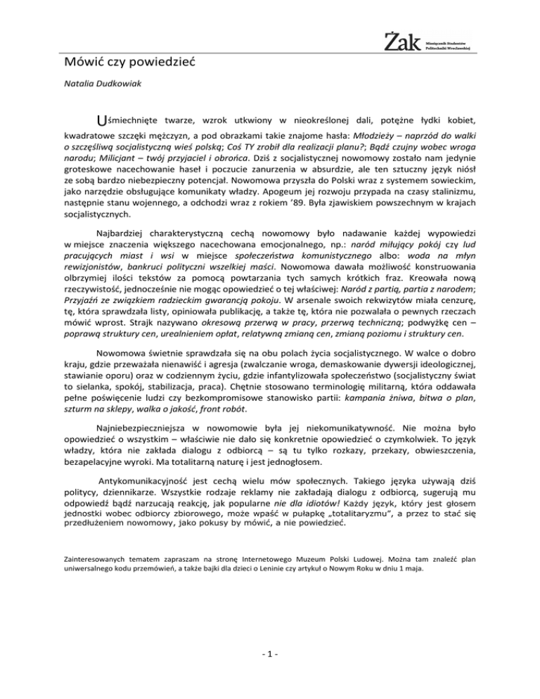 Mówić czy powiedzieć Natalia Dudkowiak Uśmiechnięte twarze, wzrok utkwiony w nieokreślonej dali, potężne łydki kobiet, kwadratowe szczęki mężczyzn, a pod obrazkami takie znajome hasła: Młodzieży – naprzód do walki o szczęśliwą socjalistyczną wieś polską; Coś TY zrobił dla realizacji planu?; Bądź czujny wobec wroga narodu; Milicjant – twój przyjaciel i obrońca. Dziś z socjalistycznej nowomowy zostało nam jedynie groteskowe nacechowanie haseł i poczucie zanurzenia w absurdzie, ale ten sztuczny język niósł ze sobą bardzo niebezpieczny potencjał. Nowomowa przyszła do Polski wraz z systemem sowieckim, jako narzędzie obsługujące komunikaty władzy. Apogeum jej rozwoju przypada na czasy stalinizmu, następnie stanu wojennego, a odchodzi wraz z rokiem ’89. Była zjawiskiem powszechnym w krajach socjalistycznych. Najbardziej charakterystyczną cechą nowomowy było nadawanie każdej wypowiedzi w miejsce znaczenia większego nacechowana emocjonalnego, np.: naród miłujący pokój czy lud pracujących miast i wsi w miejsce społeczeństwa komunistycznego albo: woda na młyn rewizjonistów, bankruci polityczni wszelkiej maści. Nowomowa dawała możliwość konstruowania olbrzymiej ilości tekstów za pomocą powtarzania tych samych krótkich fraz. Kreowała nową rzeczywistość, jednocześnie nie mogąc opowiedzieć o tej właściwej: Naród z partią, partia z narodem; Przyjaźń ze związkiem radzieckim gwarancją pokoju. W arsenale swoich rekwizytów miała cenzurę, tę, która sprawdzała listy, opiniowała publikację, a także tę, która nie pozwalała o pewnych rzeczach mówić wprost. Strajk nazywano okresową przerwą w pracy, przerwą techniczną; podwyżkę cen – poprawą struktury cen, urealnieniem opłat, relatywną zmianą cen, zmianą poziomu i struktury cen. Nowomowa świetnie sprawdzała się na obu polach życia socjalistycznego. W walce o dobro kraju, gdzie przeważała nienawiść i agresja (zwalczanie wroga, demaskowanie dywersji ideologicznej, stawianie oporu) oraz w codziennym życiu, gdzie infantylizowała społeczeństwo (socjalistyczny świat to sielanka, spokój, stabilizacja, praca). Chętnie stosowano terminologię militarną, która oddawała pełne poświęcenie ludzi czy bezkompromisowe stanowisko partii: kampania żniwa, bitwa o plan, szturm na sklepy, walka o jakość, front robót. Najniebezpieczniejsza w nowomowie była jej niekomunikatywność. Nie można było opowiedzieć o wszystkim – właściwie nie dało się konkretnie opowiedzieć o czymkolwiek. To język władzy, która nie zakłada dialogu z odbiorcą – są tu tylko rozkazy, przekazy, obwieszczenia, bezapelacyjne wyroki. Ma totalitarną naturę i jest jednogłosem. Antykomunikacyjność jest cechą wielu mów społecznych. Takiego języka używają dziś politycy, dziennikarze. Wszystkie rodzaje reklamy nie zakładają dialogu z odbiorcą, sugerują mu odpowiedź bądź narzucają reakcję, jak popularne nie dla idiotów! Każdy język, który jest głosem jednostki wobec odbiorcy zbiorowego, może wpaść w pułapkę „totalitaryzmu”, a przez to stać się przedłużeniem nowomowy, jako pokusy by mówić, a nie powiedzieć. Zainteresowanych tematem zapraszam na stronę Internetowego Muzeum Polski Ludowej. Można tam znaleźć plan uniwersalnego kodu przemówień, a także bajki dla dzieci o Leninie czy artykuł o Nowym Roku w dniu 1 maja. -1-