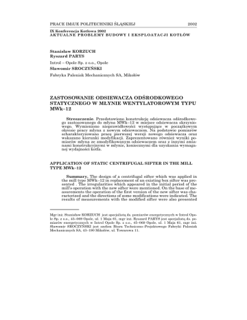 PRACE IMiUE POLITECHNIKI ŒL¥SKIEJ 2002 IX Konferencja Kot³owa 2002 A KTU A LN E P RO B LE M Y B U D O W Y I E K S P L O A T A C J I K O T £ Ó W Stanis³aw KORZUCH Ryszard PARYS Introl – Opole Sp. z o.o., Opole S³awomir SROCZYÑSKI Fabryka Palenisk Mechanicznych SA, Miko³ów ZASTOSOWANIE ODSIEWACZA ODŒRODKOWEGO STATYCZNEGO W M£YNIE WENTYLATOROWYM TYPU MWk–12 Streszczenie. Przedstawiono konstrukcjê odsiewacza odœrodkowego zastosowanego do m³yna MWk–12 w miejsce odsiewacza skrzyniowego. Wymieniono nieprawid³owoœci wystêpuj¹ce w pocz¹tkowym okresie pracy m³yna z nowym odsiewaczem. Na podstawie pomiarów scharakteryzowano pracê pierwszej wersji nowego odsiewacza oraz wskazano kierunki modyfikacji. Zaprezentowano równie¿ wyniki pomiarów m³yna ze zmodyfikowanym odsiewaczem oraz z innymi zmianami konstrukcyjnymi w m³ynie, koniecznymi dla uzyskania wymaganej wydajnoœci kot³a. APPLICATION OF STATIC CENTRIFUGAL SIFTER IN THE MILL TYPE MWk–12 Summary. The design of a centrifugal sifter which was applied in the mill type MWk–12 in replacement of an existing box sifter was presented . The irregularities which appeared in the initial period of the mill’s operation with the new sifter were mentioned. On the base of measurements the operation of the first version of the new sifter was characterized and the directions of some modifications were indicated. The results of measurements with the modified sifter were also presented Mgr in¿. Stanis³aw KORZUCH jest specjalist¹ ds. pomiarów energetycznych w Introl Opole Sp. z o.o., 45–069 Opole, ul. 1 Maja 61, mgr in¿. Ryszard PARYS jest specjalist¹ ds. pomiarów energetycznych w Introl Opole Sp. z o.o., 45–069 Opole, ul. 1 Maja 61, mgr in¿. S³awomir SROCZYÑSKI jest szefem Biura Techniczno–Projektowego Fabryki Palenisk Mechanicznych SA, 43–190 Miko³ów, ul. Towarowa 11. 136 Stanis³aw Korzuch, Ryszard Parys, S³awomir Sroczyñski with other design changes in the mill, necessary to obtain the required boiler output. STATISCHER ZENTRIFUGALSICHTER FÜR DIE VENTILATORMÜHLE MWK–12 Zusammenfassung. Die Arbeit enthält die Beschreibung der Konstruktion eines Zentrifugalsichters, der anstatt des typischen Kastensichters für die Ventilatormühle MWk–12 entworfen wurde. Die Nachteile, die in der Anfangsphase der Arbeit des neuen Sichters vorkamen, wurden analisiert. Auf Grund der Messungen sind die Betriebsresultate erster Version des Sichters charakterisiert. Weitere Messungen der Mühle, mit modifiziertem Sichter und Konstruktionsänderungen in der Mühle selbst, wurden gezeigt. 1. Wprowadzenie Wyprodukowane przez Fabrykê Palenisk Mechanicznych SA w latach 70. i 80. ubieg³ego stulecia, m³yny wentylatorowe typu MWk, przeznaczone do mielenia wêgla kamiennego, s¹ wyposa¿one w odsiewacze skrzyniowe grawitacyjne. Odsiewacze te by³y zaprojektowane tak, aby opuszczaj¹cy je py³ wêglowy cechowa³ siê jakoœci¹ przemia³u okreœlon¹ pozosta³oœci¹ na sitach 90 i 200 mm wynosz¹c¹ odpowiednio R0,09 £ 30% i R0,20 £ 5%.W rzeczywistoœci uzyskiwany przemia³ jest gorszy, a liczba polidyspersji py³u n < 0,9. Równolegle z produkcj¹ m³ynów wentylatorowych Fabryka Palenisk Mechanicznych SA by³a równie¿ projektantem i dostawc¹ m³ynów pierœcieniowo–kulowych wyposa¿onych w odsiewacze odœrodkowe statyczne. Odsiewacze te by³y przez Fabrykê w ostatnich latach czêsto modernizowane i dzisiaj mo¿emy œmia³o powiedzieæ, ¿e dopracowano siê konstrukcji sprawdzonych wysokosprawnych odsiewaczy statycznych dla ca³ego typoszeregu m³ynów pierœcieniowo–kulowych. Mo¿na zagwarantowaæ, ¿e uzyskany z nich py³ wêglowy charakteryzuje siê jakoœci¹ przemia³u na poziomie R0,09 £ 20 % i R0,20 £ 2% przy liczbie polidyspersji n > 1,2. Te pomyœlne doœwiadczenia, zwi¹zane z eksploatacj¹ odsiewaczy odœrodkowych statycznych stosowanych w m³ynach mia¿d¿¹cych sta³y siê podstaw¹ do podjêcia decyzji o realizacji projektu maj¹cego na celu zastosowanie tego typu odsiewacza w m³ynie wentylatorowym, w miejsce dot¹d pracuj¹cego odsiewacza skrzyniowego. W roku 1998 firma Frantschach Œwiecie SA, która próbowa³a w przesz³oœci bez wiêkszego efektu ingerowaæ w konstrukcjê odsiewaczy m³ynów wentyla- Zastosowanie odsiewacza odœrodkowego statycznego w m³ynie... 137 torowych w celu poprawy jakoœci przemia³u, odpowiedzia³a pozytywnie na ofertê FPM SA i zamówi³a dostawê 3 szt. odsiewaczy odœrodkowych statycznych do m³ynów typu MWk–12 pracuj¹cych przy kotle nr 5 w tamtejszej elektrociep³owni. To w³aœnie realizacja tego projektu Fabryki Palenisk Mechanicznych SA, przeprowadzona przy znacz¹cym wspó³udziale firmy pomiarowej Introl Opole Sp. z o.o., jest przedmiotem niniejszego opracowania. 2. Konstrukcja odsiewacza 2.1. Odsiewacz skrzyniowy Typowy odsiewacz m³yna wentylatorowego MWk–12, pokazany na rys. 1, ma budowê skrzyniow¹ i swoj¹ funkcjê pe³ni poprzez zmianê kierunku przep³ywu strugi zmielonego wêgla i zmianê jej prêdkoœci. Pierwsze, zrealizo- Rys. 1. Odsiewacz skrzyniowy m³yna MWk–12 138 Stanis³aw Korzuch, Ryszard Parys, S³awomir Sroczyñski wane jest przez elementy regulacyjne jakimi s¹ ³opatki odsiewacza, drugie nastêpuje w wyniku gwa³townego wzrostu objêtoœci odsiewacza, a co za tym idzie spadku prêdkoœci przep³ywu, w przestrzeni za ³opatkami. Dziêki grawitacji grube frakcje powinny byæ nawracane do powtórnego przemia³u, a drobne unoszone przez czynnik transportuj¹cy do wylotu z odsiewacza i dalej do palników. Rzeczywistoœæ jest taka, ¿e znaczna czêœæ drobnych cz¹stek porywana jest wraz z grubymi z powrotem na wlot do ko³a bijakowego, a do wylotu z odsiewacza dostaj¹ siê równie¿ stosunkowo grube frakcje niedostatecznie zmielonego py³u wêglowego. W wyniku tego, jakoœæ przemia³u jest niezadowalaj¹ca, a sprawnoœæ odsiewania niska, wystêpuje te¿ niepotrzebna recyrkulacja dobrego jakoœciowo py³u. Tych negatywnych cec