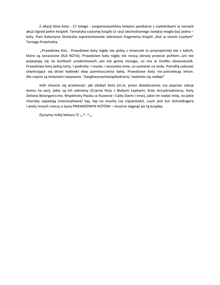 Z okazji Dnia kota - 17 lutego - zorganizowaliśmy kolejne spotkanie z czytelnikami w ramach akcji Ogród pełen książek. Tematyka czytanej książki (z racji obchodzonego święta) mogła być jedna – koty. Pani Katarzyna Stolarska zaprezentowała zebranym fragmenty książki „Kot w stanie czystym” Terrego Pratchetta. „Prawdziwy Kot… Prawdziwe koty nigdy nie jedzą z miseczek (a przynajmniej nie z takich, które są oznaczone DLA KOTA). Prawdziwe koty nigdy nie noszą obroży przeciw pchłom…ani nie pojawiają się na kartkach urodzinowych…ani nie gonią niczego, co ma w środku dzwoneczek. Prawdziwe koty jedzą tarty. I podroby. I masło. I wszystko inne, co zostanie na stole. Potrafią usłyszeć otwierające się drzwi lodówki dwa pomieszczenia dalej. Prawdziwe koty nie potrzebują imion. Ale często są imionami nazywane. ‘Aarghwynochastądtydraniu’ świetnie się nadaje” Jeśli chcecie się przekonać: jak zdobyć kota (m.in. przez dziedziczenie czy poprzez zakup domu na wsi), jakie są ich odmiany (Czarne Koty z Białymi Łapkami, Koty Arcyzbrodniarzy, Koty Zielona Bioorganiczne, Wspólnoty Piasku w Kuwecie i Całej Ziemi i inne), jakie im nadać imię, na jakie choroby zapadają (niecierpliwość łap, lep na muchy czy ciężarówki), czym jest kot Schrödingera i wielu innych rzeczy o życiu PRAWDZIWYK KOTÓW – musicie sięgnąć po tą książkę. Życzymy miłej lektury  ,,,^..^,,,