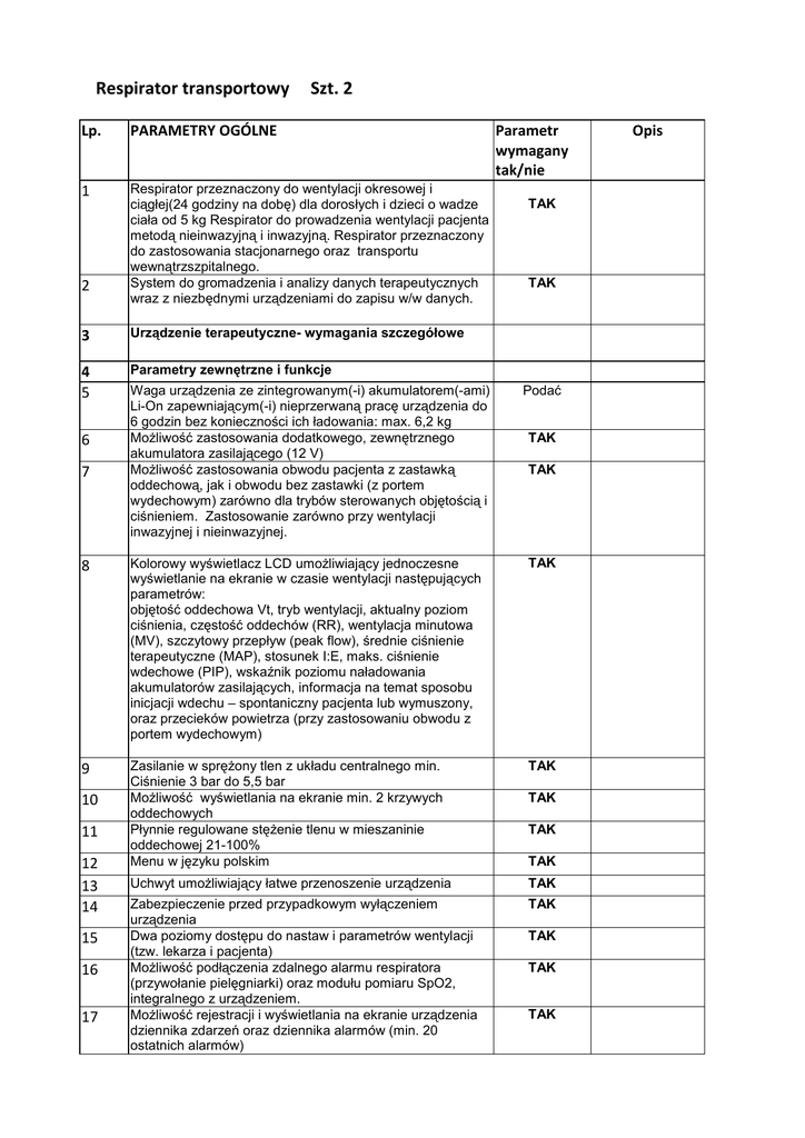 Respirator transportowy Szt. 2 Lp. PARAMETRY OGÓLNE 1 Respirator przeznaczony do wentylacji okresowej i ciągłej(24 godziny na dobę) dla dorosłych i dzieci o wadze ciała od 5 kg Respirator do prowadzenia wentylacji pacjenta metodą nieinwazyjną i inwazyjną. Respirator przeznaczony do zastosowania stacjonarnego oraz transportu wewnątrzszpitalnego. System do gromadzenia i analizy danych terapeutycznych wraz z niezbędnymi urządzeniami do zapisu w/w danych. 2 3 Urządzenie terapeutyczne- wymagania szczegółowe 4 5 Parametry zewnętrzne i funkcje 6 7 Waga urządzenia ze zintegrowanym(-i) akumulatorem(-ami) Li-On zapewniającym(-i) nieprzerwaną pracę urządzenia do 6 godzin bez konieczności ich ładowania: max. 6,2 kg Możliwość zastosowania dodatkowego, zewnętrznego akumulatora zasilającego (12 V) Możliwość zastosowania obwodu pacjenta z zastawką oddechową, jak i obwodu bez zastawki (z portem wydechowym) zarówno dla trybów sterowanych objętością i ciśnieniem. Zastosowanie zarówno przy wentylacji inwazyjnej i nieinwazyjnej. Parametr wymagany tak/nie TAK TAK Podać TAK TAK 8 Kolorowy wyświetlacz LCD umożliwiający jednoczesne wyświetlanie na ekranie w czasie wentylacji następujących parametrów: objętość oddechowa Vt, tryb wentylacji, aktualny poziom ciśnienia, częstość oddechów (RR), wentylacja minutowa (MV), szczytowy przepływ (peak flow), średnie ciśnienie terapeutyczne (MAP), stosunek I:E, maks. ciśnienie wdechowe (PIP), wskaźnik poziomu naładowania akumulatorów zasilających, informacja na temat sposobu inicjacji wdechu – spontaniczny pacjenta lub wymuszony, oraz przecieków powietrza (przy zastosowaniu obwodu z portem wydechowym) TAK 9 Zasilanie w sprężony tlen z układu centralnego min. Ciśnienie 3 bar do 5,5 bar Możliwość wyświetlania na ekranie min. 2 krzywych oddechowych Płynnie regulowane stężenie tlenu w mieszaninie oddechowej 21-100% Menu w języku polskim TAK Uchwyt umożliwiający łatwe przenoszenie urządzenia TAK Zabezpieczenie przed przypadkowym wyłączeniem urządzenia Dwa poziomy dostępu do nastaw i parametrów wentylacji (tzw. lekarza i pacjenta) Możliwość podłączenia zdalnego alarmu respiratora (przywołanie pielęgniarki) oraz modułu pomiaru SpO2, integralnego z urządzeniem. Możliwość rejestracji i wyświetlania na ekranie urządzenia dziennika zdarzeń oraz dziennika alarmów (min. 20 ostatnich alarmów) TAK 10 11 12 13 14 15 16 17 TAK TAK TAK TAK TAK TAK Opis 18 19 TRYBY WENTYLACJI I NASTAWY Urządzenie przeznaczone do wentylacji inwazyjnej i nieinwazyjnej TAK 20 Dwa profile nastaw z możliwością zaprogramowania i zapamiętania różnych parametrów wentylacji w każdym; możliwość przełączania profili nastaw przez pacjenta Możliwość zmieniania trybu wentylacji w trakcie wentylacji TAK Tryby wentylacji sterowane ciśnieniem TAK 23 Wentylacja wspomagana ciśnieniem spontaniczna (PSV S) TAK 24 Wentylacja wspomagana ciśnieniem spontaniczno-czasowa (PSV S/T) Wentylacja wspomagana ciśnieniem czasowa (PSV T) TAK Wentylacja kontrolowana ciśnieniem (PC) TAK Hybrydowy tryb wentylacji z jednoczesnym automatycznym dostosowaniem ciśnień wdechowych (PS) i automatycznym doborem ciśnień wydechowych w celu eliminacji zaburzeń oddychania o charakterze obturacyjnym TYPU BEZDECH, SPŁYCENIE, CHRAPANIE ( auto – PEEP) Synchronizowana przerywana wentylacja wymuszona z wentylacją PC (PC-SIMV) Dla trybów wentylacji sterowanej ciśnieniem (tryby: PS, PS S/T, PS T, PC) możliwość zaprogramowania określonej objętości oddechowej wydechowej (TVexh.) w zakresie 502000ml przy zastosowaniu obwodu z portem wydechowym; TAK TAK 30 Tryby wentylacji sterowane objętością TAK 31 Wspomagana/kontrolowana wentylacja mechaniczna (AC) TAK 32 Synchronizowana przerywana wentylacja wymuszona (SIMV) TAK 33 Kontrolowana wentylacja mechaniczna (CV) TAK 34 35 Parametry wentylacji sterowanej ciśnieniem 21 22 25 26 27 28 29 36 37 38 39 40 41 42 43 44 Zakres ciśnienia wdechowego IPAP: 4-50 cmH20 Zakres ciśnienia wydechowego EPAP: 4-25 cmH20 Min. częstość oddychania (back-up rate): 5- 60 oddech/min Czas trwania wdechu: 0.3 – 5.0 sekund Regulacja szybkości narastania ciśnienia przy przejściu z fazy wydechu na wdech - min. 6 nastaw Możliwość nastawy czasu liniowego narastania ciśnienia ( funkcja typu RAMP) w zakresie 5 - 45 min ułatwiającego zaśnięcie pacjenta Możliwość zastosowania automatycznego triggera wyzwalającego zmiany ciśnienia pomiędzy fazami oddechowymi (wdech-wydech oraz wydech-wdech), reagującego na spontaniczny wysiłek oddechowy pacjenta bez konieczności manualnego dostosowania Możliwość zastosowania triggera wdechowego przepływowego, min. 8 poziomów Możliwość zastosowania triggera wydechowego w zakresie 10% - 90% przepływu szczytowego Parametry wentylacji sterowanej objętościowo TAK TAK TAK TAK TAK TAK TAK TAK TAK TAK TAK TAK 45 46 Objętość oddechowa (Vt) – minimalny zakres 50-2000 ml TAK Możliwość nastawy PEEP w zakresie 0-25 cmH20 dla obwodu z zastawką wydechową TAK 47 48 49 Czas trwania wdechu: TAK 50 51 52 53 54 55 56 57 58 59 60 61 62 63 64 65 66 67 69 70 71 71 72 73 74 75 76 77 0.3 – 5.0 sekund Min. częstość oddychania (backup rate): 5-60 oddech/min Krzywe przepływu: - prostokątna - opadająca Możliwość włączenia funkcji westchnienia TAK TAK TAK System alarmów wizualno- akustycznych Alarmy wentylacji i pracy respiratora TAK Stopniowanie alarmów ze względu na ważność, różniące się sygnałami dźwiękowymi i optycznymi Alarm odłączenia obwodu pacjenta TAK Alarm braku zasilania TAK Alarm bezdechu TAK Alarm niskiej wentylacji minutowej TAK Alarm wysokiej wentylacji minutowej TAK Alarm wysokiej częstości oddechów TAK Alarm niskiej częstości oddechów TAK Alarm niskiej objętości oddechu (TV) TAK Alarm wysokiej objętości oddechu (TV) TAK Alarm niskiego ciśnienia wdechowego (IPAP) przy wentylacji sterowanej objętościowo Alarm w