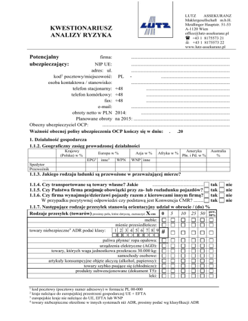 LUTZ ASSEKURANZ Maklergesellschaft m.b.H. Meidlinger Hauptstr. 51-53 A-1120 Wien [email protected] +43 1 8175573 21 +43 1 8175573 22 www.lutz-assekuranz.pl KWESTIONARIUSZ ANALIZY RYZYKA Potencjalny ubezpieczający: firma: ............................................................................... NIP UE: ............................................................................... adres: ul. ............................................................................... 1 kod pocztowy/miejscowość: PL ....................................................... osoba kontaktowa / stanowisko: ............................................................................... telefon stacjonarny: +48 ................................................................... telefon komórkowy: +48 ................................................................... fax: +48 ................................................................... e-mail: ............................................................................... obroty netto w PLN 2014: ....................................................................... Planowane obroty na 2015: ............................................................................. Obecny ubezpieczyciel OCP: ...................................................................................................... Ważność obecnej polisy ubezpieczenia OCP kończy się w dniu: . .20 1. Działalność gospodarcza 1.1.2. Geograficzny zasięg prowadzonej działalności Krajowy (Polska) w % Europa w % EPG2 inne3 Azja w % WPN Afryka w % Ameryka Płn. i Pd. w % Australia % WNP inne Spedytor Przewoźnik 1.1.3. Jakiego rodzaju ładunki są przewożone w przeważającej mierze? ...................................................................................................................................................... 1.1.4. Czy transportowane są towary własne? Jakie ......................................... tak nie 1.1.5. Czy Państwa firma przejmuje obowiązki przy za- lub rozładunku pojazdów? tak nie 1.1.6. Czy firma wynajmuje/dzierżawi pojazdy razem z kierowcami innym firmą? tak nie W przypadku pozytywnej odpowiedzi czy podstawą jest Konwencja CMR? ........ tak nie 1.1.7. Następujące rodzaje przesyłek stanowią orientacyjny udział w obrocie / (do) % Rodzaje przesyłek (towarów) prosimy pola, które dotyczą, zaznaczyć X-em 0 5 10 25 50 pow. 50% towary niebezpieczne4 ADR podać klasy: meble: mienie przesiedleńcze: 1 2 3 4 5 6 7 8 9 1 1 # paliwa płynne/ ropa opałowa: urządzenia elektryczne (AGD): towary, których waga jednostkowa przekracza 30.000 kg: samochody osobowe: artykuły konsumpcyjne objęte akcyzą (alkohol, papierosy): towary szybko psujące się (chłodnicze): produkty subwencjonowane (dokument T5): leki: 1 kod pocztowy (pocztowy numer adresowy) w formacie PL 00-000 kraje należące do europejskiej przestrzeni gospodarczej UE + EFTA 3 europejskie kraje nie należące do UE, EFTA lub WNP 4 towary niebezpieczne określone w innych systemach niż ADR, prosimy podać wg klasyfikacji ADR 2 KWESTIONARIUSZ ANALIZY RYZYKA PRZEWOŹNIKA Rodzaje przesyłek (towarów) prosimy pola, które dotyczą, zaznaczyć X-em 0 5 10 25 50 pow. 50% zwierzęta: części samochodowe: opony: maszyny rolnicze lub budowlane: środki transportu poruszane na własnej osi (np. naczepy, maszyny budowlane): inne – proszę wymienić: # oznacza = nie zajmujemy się w ogóle towarami niebezpiecznymi 1.2. Czy firma korzysta z podwykonawców w zakresie transportu drogowego? tak Jeżeli tak, to jaki % w obrocie działalności transportowej przypada na tego rodzaju usługi? 1.3. Czy firma korzysta z przepraw promowych? tak nie % nie 2. TABOR POJAZDÓW 2.1. Pojazdy drogowe Proszę podać rodzaj nadbudowy i ilość pojazdów (własnych i leasingowanych): plandeki: cysterny: furgon: skrzynia: ........ chłodnie: ........ silosy: ........ wywrotki: ........ platforma: ........ izotermy: ........ kontenery: ........ lohra: ........ inna jaka?: sztuk. ...... ponadgabaryty: ...... niskopodwoziowa: ...... autotransporter: ...... ....................... ile?: ......... ......... ......... ......... Szkodowość w zakresie OCP w ostatnich trzech latach (proszę podać rodzaj szkody oraz kwoty jednostkowe wraz z rezerwami: 2012 ............................................................................................................................................. ...................................................................................................................................................... 2013 ............................................................................................................................................. ...................................................................................................................................................... 2014 ............................................................................................................................................. ...................................................................................................................................................... 2015 .................................................................................................................................................. ........................................................................................................................................................... Uwagi i uzupełnienia osoby wypełniającej kwestionariusz: ...................................................................................................................................................... Pola pozostawione bez odpowiedzi traktuje się jako odpowiedź: „nie dotyczy”, „nie posiada” lub „brak”. Podanie błędnych lub niezgodnych z prawdą danych lub okoliczności, do wiadomości zakładu ubezpieczeń, może być potraktowane jako naruszenie obowiązku u