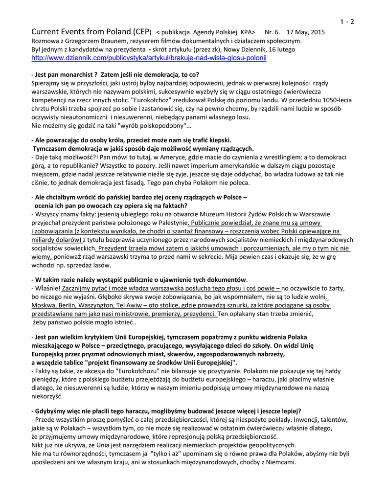 1-2 Current Events from Poland (CEP) < publikacja Agendy Polskiej KPA> Nr. 6. 17 May, 2015 Rozmowa z Grzegorzem Braunem, reżyserem filmów dokumentalnych i działaczem społecznym. Był jednym z kandydatów na prezydenta - skrót artykułu (przez zk), Nowy Dziennik, 16 lutego http://www.dziennik.com/publicystyka/artykul/brakuje-nad-wisla-glosu-polonii - Jest pan monarchist ? Zatem jeśli nie demokracja, to co? Spierajmy się w przyszłości, jaki ustrój byłby najbardziej odpowiedni, jednak w pierwszej kolejności rządy warszawskie, których nie nazywam polskimi, sukcesywnie wyzbyły się w ciągu ostatniego ćwierćwiecza kompetencji na rzecz innych stolic. "Eurokołchoz" zredukował Polskę do poziomu landu. W przededniu 1050-lecia chrztu Polski trzeba spojrzeć po sobie i zastanowić się, czy na pewno chcemy, by rządzili nami ludzie w sposób oczywisty nieautonomiczni i niesuwerenni, niebędący panami własnego losu. Nie możemy się godzić na taki "wyrób polskopodobny"... - Ale powracając do osoby króla, przecież może nam się trafić kiepski. Tymczasem demokracja w jakiś sposób daje możliwość wymiany rządzących. - Daje taką możliwość?! Pan mówi to tutaj, w Ameryce, gdzie macie do czynienia z wrestlingiem: a to demokraci górą, a to republikanie? Wszystko to pozory. Jeśli nawet imperium amerykańskie w dalszym ciągu pozostaje miejscem, gdzie nadal jeszcze relatywnie nieźle się żyje, jeszcze się daje oddychać, bo władza ludowa aż tak nie ciśnie, to jednak demokracja jest fasadą. Tego pan chyba Polakom nie poleca. - Ale chciałbym wrócić do pańskiej bardzo złej oceny rządzących w Polsce – ocenia ich pan po owocach czy opiera się na faktach? - Wszyscy znamy fakty: jesienią ubiegłego roku na otwarcie Muzeum Historii Żydów Polskich w Warszawie przyjechał prezydent państwa położonego w Palestynie. Publicznie powiedział, że znane mu są umowy i zobowiązania (z kontekstu wynikało, że chodzi o szantaż finansowy – roszczenia wobec Polski opiewające na miliardy dolarów) z tytułu bezprawia uczynionego przez narodowych socjalistów niemieckich i międzynarodowych socjalistów sowieckich. Prezydent Izraela mówi zatem o jakichś umowach i porozumieniach, ale my o tym nic nie wiemy, ponieważ rząd warszawski trzyma to przed nami w sekrecie. Mija pewien czas i okazuje się, że w grę wchodzi np. sprzedaż lasów. - W takim razie należy wystąpić publicznie o ujawnienie tych dokumentów. - Właśnie! Zacznijmy pytać i może władza warszawska posłucha tego głosu i coś powie – no oczywiście to żarty, bo niczego nie wyjaśni. Głęboko skrywa swoje zobowiązania, bo jak wspomniałem, nie są to ludzie wolni. Moskwa, Berlin, Waszyngton, Tel Awiw – oto stolice, gdzie prowadzą sznurki, za które pociągane są osoby przedstawiane nam jako nasi ministrowie, premierzy, prezydenci. Ten opłakany stan trzeba zmienić, żeby państwo polskie mogło istnieć.. - Jest pan wielkim krytykiem Unii Europejskiej, tymczasem popatrzmy z punktu widzenia Polaka mieszkającego w Polsce – przeciętnego, pracującego, wysyłającego dzieci do szkoły. On widzi Unię Europejską przez pryzmat odnowionych miast, skwerów, zagospodarowanych nabrzeży, a wszędzie tablice "projekt finansowany ze środków Unii Europejskiej". - Fakty są takie, że akcesja do "Eurokołchozu" nie bilansuje się pozytywnie. Polakom nie pokazuje się tej hałdy pieniędzy, które z polskiego budżetu przejeżdżają do budżetu europejskiego – haraczu, jaki płacimy właśnie dlatego, że niesuwerenni są ludzie, którzy w naszym imieniu podpisują umowy międzynarodowe na naszą niekorzyść. - Gdybyśmy więc nie płacili tego haraczu, moglibyśmy budować jeszcze więcej i jeszcze lepiej? - Przede wszystkim proszę pomyśleć o całej przedsiębiorczości, której są niespożyte pokłady. Inwencji, talentów, jakie są w Polakach – wszystkim tym, co nie może się realizować w ostatnim ćwierćwieczu właśnie dlatego, że przyjmujemy umowy międzynarodowe, które represjonują polską przedsiębiorczość. Nikt już nie ukrywa, że Unia jest narzędziem realizacji niemieckich projektów geopolitycznych. Nie ma tu równorzędności, tymczasem ja "tylko i aż" upominam się o równe prawa dla Polaków, abyśmy nie byli upośledzeni ani we własnym kraju, ani w stosunkach międzynarodowych, choćby z Niemcami. 2-2 Niemiecki parlament uchwalił, że każde prawo "Eurokołchozu" będzie wymagało kontrasygnaty wewnętrznej, innymi słowy – żadne prawo europejskie nie zostanie narzucone Niemcom bez ich zgody. My takiego prawa nie uchwaliliśmy, dlatego paradoks jest następujący: Niemcy majstrując w Unii mogą narzucać nam przepisy, ale w przeciwnym kierunku takiej możliwości nie ma. To jest po prostu skandaliczne. - Mówi pan, że w Polsce jest za mało Polaków. - Pozwolę sobie przytoczyć fragment „Konopielki” Redlińskiego: "A wy kto, nie Polak? – Nie. – To kto? Niemiec? – Nie. – To może Francuz? – Nie Francuz. – To kto wy? – Ja tutejszy. – Jaki tutejszy? – A tutejszy, z Bagna. – A Bagno gdzie? Nie w Polsce? – Bagno tutaj i my tutejsze...". Tacy właśnie bywają ludzie i wśród tych, którzy zamieszkują Polskę, którzy się legitymują polskim obywatelstwem nie wszyscy są świadomymi Polakami i nie wszyscy należą do naszego narodu politycznego. Nie wszyscy zresztą chcą należeć. Odnoszę się z szacunkiem do takich ludzi, bo uważam, że nikogo nie należy zmuszać. Polska jest zbyt piękna, żeby kijem do niej kogoś zaganiać. Pół tysiąca lat temu ludzie pchali się drzwiami i oknami, żeby w Polsce zamieszkać, żeby być dopuszczonymi do polskich praw. Było relatywnie najfajniej na całym globie być polskim poddanym (no właśnie, a nie obywatelem). I do tych tradycji trzeba się odwoływać – do wolności, a nie jakiegoś pruskiego czy ruskiego zamordyzmu jako metody postępowania. - Jesteśmy w Stanach,