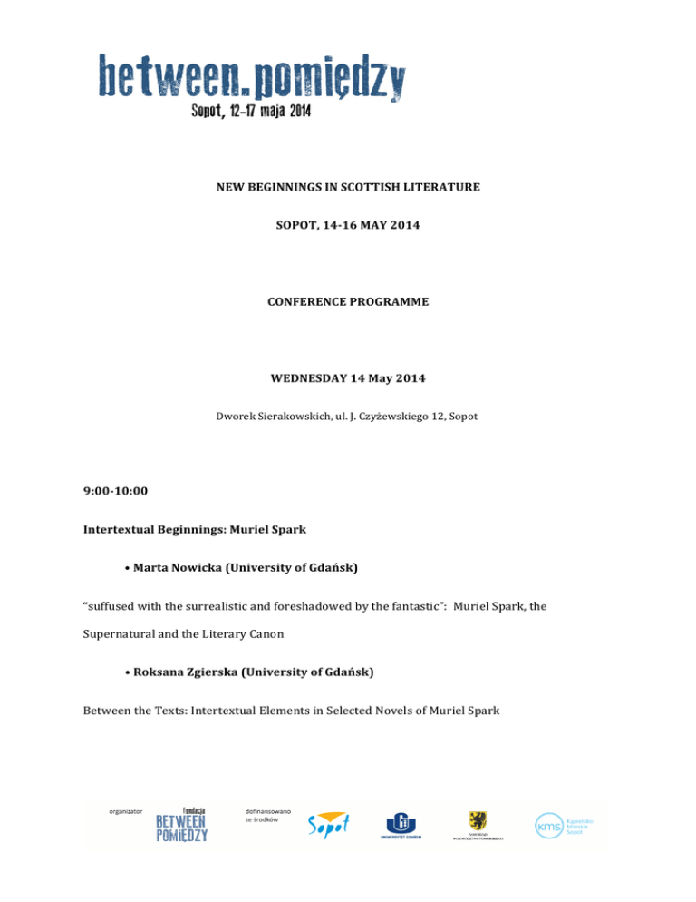 NEW BEGINNINGS IN SCOTTISH LITERATURE SOPOT, 14-‐16 MAY 2014 CONFERENCE PROGRAMME WEDNESDAY 14 May 2014 Dworek Sierakowskich, ul. J. Czyżewskiego 12, Sopot 9:00-‐10:00 Intertextual Beginnings: Muriel Spark • Marta Nowicka (University of Gdańsk) “suffused with the surrealistic and foreshadowed by the fantastic”: Muriel Spark, the Supernatural and the Literary Canon • Roksana Zgierska (University of Gdańsk) Between the Texts: Intertextual Elements in Selected Novels of Muriel Spark 10:15-‐12:15 Other Beginnings: The Fantastic, the Speculative, and the Dystopian • Robin MacKenzie (University of St Andrews) Persuasions of the Warlock’s Craft: Intertextuality and Innovation in The Warlock of Strathearn by Christopher Whyte • Jadwiga Węgrodzka (University of Gdańsk) George MacDonald and the Metaphysical Functions of the Fantastic in Children’s Fiction • Karol Jaroszewski (University of Gdańsk) New Beginnings in Speculative Fiction -‐ The Scottish Contribution 13:00-‐14:30 Seminar one • Alan Riach (University of Glasgow) Hugh MacDiarmid, “English Ascendancy in British Literature” 14:45-‐16:45 Keynote addresses • Neal Ascherson (University College London) “Fredome is a noble thing”: The Idea of Independence in the Scottish Literary Tradition • Alan Spence (University of Aberdeen) Zen in Scottish Literature THURSDAY 15 May 2014 Dworek Sierakowskich, ul. J. Czyżewskiego 12, Sopot 9:00-‐10:00 Beginnings in the Mearns: Lewis Grassic Gibbon • Uwe Zagratzki (University of Szczecin) Demotic Speech – Innovative Narrative Strategies in Lewis Grassic Gibbon´s Prose • Piotr Andrzejewski (University of Gdańsk) The Language of Lewis Grassic Gibbon's A Scots Quair – Through Scots Towards Universalism and Back 10:15-‐12:15 Genre Beginnings?: Crime, Academe, and Story Telling • Agnieszka Sienkiewicz-‐Charlish (University of Gdańsk) The Rise of Tartan Noir • Sabina Laskowska-‐Hinz (University of Gdańsk) Is the Rebirth of a Scottish Academic Novel Still Possible? -‐ The Study of The Missing Shade of Blue by Jennie Erdal • Halszka Leleń (University of Warmia and Mazury in Olsztyn) “The Word Transfigures All”. Storytelling Through Space and Time in The Masked Fisherman and Other Stories by George Mackay Brown. 13:00-‐14:30 Seminar two • Neal Ascherson (University College London) Sorley MacLean, “Hallaig” 14:45-‐15:45 Keynote address • Christoph Heyl (Universität Duisburg-‐Essen) “O’er Scotia’s parched lands the Naiads flew”: Beginnings in Robert Fergusson’s “The Rivers of Scotland” (1773) FRIDAY 16 May 2014 Dworek Sierakowskich, ul. J. Czyżewskiego 12, Sopot 9:00-‐9:45 The University of Gdańsk Samuel Beckett Seminar • SE Gontarski (Florida State University) Other Becketts: Samuel Beckett’s Edinburgh Connection 10:00-‐11:00 Novel Beginnings?: Irvine Welsh, James Robertson, and Kevin Macdonald • Maria Fengler (University of Gdańsk) James Robertson: The Fanatic • Sarah Bisson (ESPE Paris – Université Paris 4) New Beginnings or Eternal Return? A study of Irvine Welsh’s Glue • Ludmiła Gruszewska-‐Blaim (University of Gdańsk) How One Lives in Dystopia: Kevin Macdonald’s Film Adaptation 11:15-‐13:15 New Beginnings in Scottish Poetry: Robert Burns, the Gaelic, and Jackie Kay • Mirosława Modrzewska (University of Gdańsk) Old and New Translations of Robert Burns • Patrycja Lewkow (University of Szczecin) Why Write Poetry in a “dead tounge”? Bilingual Identities in Contemporary Irish and Scottish Gaelic Poetry • Aniela Korzeniowska (University of Warsaw) “Between the Dee and the Don” – Jackie Kay’s Betweenness as a New Beginning 14:00-‐15:30 Seminar three • Helen Lynch and Alan Spence (University of Aberdeen) Ali Smith, “A Story of Love” 15:45-‐16:30 Always a New Beginning: Edwin Morgan • Monika Kocot (University of Lódź) The Play of the Ancient and the (Post)Modern: “He Who Saw the Deep” in Edwin Morgan’s The Play of Gilgamesh • Wolfgang Görtschacher (University of Salzburg) Edwin Morgan: The Poet-‐Translator 16:30-‐17:30 Keynote address Alan Riach (University of Glasgow) Poetry, the Arts and National Regeneration: Seeing Scotland New