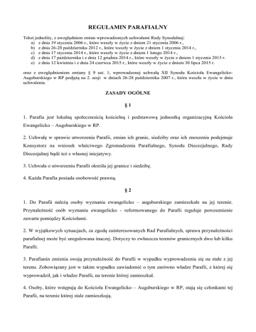 REGULAMIN PARAFIALNY Tekst jednolity, z uwzględniem zmian wprowadzonych uchwałami Rady Synodalnej: a) z dnia 19 stycznia 2006 r., które weszły w życie z dniem 21 stycznia 2006 r., b) z dnia 26-28 października 2012 r., które weszły w życie z dniem 1 stycznia 2014 r., c) z dnia 17 stycznia 2014 r., które weszły w życie z dniem 1 lutego 2014 r., d) z dnia 17 października i z dnia 12 grudnia 2014 r., które weszły w życie z dniem 1 stycznia 2015 r. e) z dnia 12 kwietnia i z dnia 24 czerwca 2015 r., które weszły w życie z dniem 30 lipca 2015 r. oraz z uwzględnieniem zmiany § 9 ust. 1, wprowadzonej uchwałą XII Synodu Kościoła EwangelickoAugsburskiego w RP podjętą na 2. sesji w dniach 26-28 października 2007 r., która weszła w życie w dniu uchwalenia. ZASADY OGÓLNE §1 1. Parafia jest lokalną społecznością kościelną i podstawową jednostką organizacyjną Kościoła Ewangelicko – Augsburskiego w RP. 2. Uchwałę w sprawie utworzenia Parafii, zmian ich granic, siedziby oraz ich znoszenia podejmuje Konsystorz na wniosek właściwego Zgromadzenia Parafialnego, Synodu Diecezjalnego, Rady Diecezjalnej bądź też z własnej inicjatywy. 3. Uchwała o utworzeniu Parafii określa jej granice i siedzibę. 4. Każda Parafia posiada osobowość prawną. §2 1. Do Parafii należą osoby wyznania ewangelicko – augsburskiego zamieszkałe na jej terenie. Przynależność osób wyznania ewangelicko - reformowanego do Parafii reguluje porozumienie zawarte pomiędzy Kościołami. 2. W wyjątkowych sytuacjach, za zgodą zainteresowanych Rad Parafialnych, sprawa przynależności parafialnej może być uregulowana inaczej. Dotyczy to zwłaszcza terenów granicznych dwu lub kilku Parafii. 3. Parafianin zmienia swoją przynależność do Parafii w wypadku wyprowadzenia się na stałe z jej terenu. Zobowiązany jest w takim wypadku zawiadomić o tym zarówno władze Parafii, z której się wyprowadził, jak i władze Parafii, na terenie której zamieszkał. 4. Osoby, które wstępują do Kościoła Ewangelicko – Augsburskiego w RP, stają się członkami tej Parafii, na terenie której stale zamieszkują. 5. Rada Parafialna prowadzi listę członków Parafii. Aktualizacja listy członków Parafii jest dokonywana w formie uchwały Rady Parafialnej nie rzadziej niż raz do roku. Uchwała ta podlega ogłoszeniu w sposób wskazany w §21a. §3 1. Wspólnym zadaniem wszystkich parafian jest zapewnienie istnienia Parafii oraz jej duchowego jak i materialnego rozwoju. 2. Naczelnym prawem i obowiązkiem parafian jest korzystanie z głoszonego Słowa Bożego oraz sprawowanych sakramentów poprzez udział w nabożeństwach i innych czynnościach kościelnych, a także poprzez aktywny udział w życiu wspólnoty. §4 1. Dla zaspokojenia swoich potrzeb religijnych Parafie wznoszą i utrzymują kościoły, kaplice, domy parafialne, plebanie i inne niezbędne dla tych potrzeb obiekty oraz zakładają i utrzymują cmentarze parafialne. 2. Dla usprawnienia opieki duszpasterskiej i funkcjonowania Parafii mogą być tworzone Filiały parafialne, które przejmują zadania Parafii w stosunku do osób zamieszkałych na terenie Filiału, w tym przede wszystkim odprawianie nabożeństw, prowadzenie nauczania kościelnego, opiekę duszpasterską i dbałość o majątek kościelny, w tym zwłaszcza o ten znajdujący się na terenie Filiału. 3. Filiał jest tworzony i znoszony przez Radę Diecezjalną z własnej inicjatywy lub na wniosek Rady Parafialnej. Rada Diecezjalna określa i zmienia granice filiału oraz jego siedzibę. Rada Diecezjalna określa również, czy filiał ma być zarządzany przez Radę Filiału. Odwołanie od uchwały Rady Diecezjalnej wnosi się za jej pośrednictwem do Konsystorza, którego uchwała jest w tym zakresie ostateczna. §5 1. Parafia prowadzi działalność diakonijną, otaczając opieką i udzielając pomocy i wsparcia osobom niepełnosprawnym, chorym, biednym, starym i samotnym. 2. Parafia może prowadzić działalność oświatową, kulturalną, charytatywną, opiekuńczą, pożytku publicznego, w zakresie opieki nad zabytkami i inną, zgodną z zasadami i potrzebami Kościoła. §6 1. Parafia zaspokaja swoje potrzeby materialne z dochodów uzyskanych: a) ze składek, kolekt i ofiar, b) z własnego majątku, c) z otrzymanych darowizn, d) z opłat za czynności, e) z działalności gospodarczej, f) z fundacji, g) z innych źródeł. 2. Parafia przekazuje część swych dochodów na cele diecezjalne i ogólnokościelne, zgodnie z uchwałami Synodu Diecezjalnego i Synodu Kościoła. 3. W Parafii zbiera się też ofiary na cele pozaparafialne zarządzone przez kościelne władze przełożone. 4. Rada Parafialna może także w drodze uchwały zarządzić dodatkowe zbiórki ofiar na cele parafialne i pozaparafialne. 5 W wypadku niesamodzielności finansowej Parafii, może ona otrzymać pomoc innych osób prawnych Kościoła na potrzeby funkcjonowania Parafii. §7 1. Każdy członek Parafii, który został konfirmowany albo wstąpił do Kościoła i ukończył 18 lat, zobowiązany jest do płacenia składek parafialnych. Składki te powinny wynosić nie mniej niż 1% jego dochodu. 2. W uzasadnionych przypadkach Rada Parafialna może obniżyć wysokość składki parafialnej lub zwolnić od tego obowiązku pojedynczych parafian bądź też określone grupy społeczne np. uczniów, studentów, bezrobotnych, czy też rodziny przeżywające okresowe trudności finansowe. W uchwale dotyczącej zwolnienia powinien być określony czas trwania tego zwolnienia. §8 1. Prawo głosu i czynne prawo wyborcze w Parafii przysługuje tym członkom Parafii, którzy, zostali konfirmowani albo wstąpili do Kościoła , ukończyli 18 lat, uczęszczają na nabożeństwa i opłacili w przepisanym terminie przypadającą na nich składkę za rok ubiegły lub zostali z niej zwolnieni przez Radę Parafialną. 2. Bierne prawo wyborcze w Parafii przysługuje jej członkom, którzy przez okres t