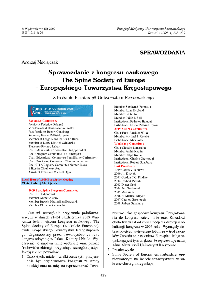 Przegląd Medyczny Uniwersytetu Rzeszowskiego Rzeszów 2009, 4, 428–430 © Wydawnictwo UR 2009 ISSN 1730-3524 SPRAWOZDANIA Andrzej Maciejczak Sprawozdanie z kongresu naukowego The Spine Society of Europe – Europejskiego Towarzystwa Kręgosłupowego Z Instytutu Fizjoterapii Uniwersytetu Rzeszowskiego Member Stephen J. Ferguson Member Rune Hedlund Member Keita Ito Member Philip J. Sell Institutional Federico Balagué Institutional Ferran Pellisé Urquiza 2009 Awards Committee Chair Hans-Joachim Wilke Member Michael P. Grevitt Institutional Max Aebi Workshop Committee Chair Claudio Lamartina Member André Kaelin Member Ralph Kothe Institutional Charles Greenough Institutional Robert Gunzburg Past Presidents 1999 Carlos Villanueva 2000 Jiri Dvorak 2001 Gordon F.G. Findlay 2002 Norbert Passuti 2003 Dieter Grob 2004 Petr Suchomel 2005 Max Aebi 2006 H. Michael Mayer 2007 Charles Greenough 2008 Robert Gunzburg Executive Committee President Federico Balagué Vice President Hans-Joachim Wilke Past President Robert Gunzburg Secretary Ferran Pellisé Urquiza Member at Large Jean Charles Le Huec Member at Large Dietrich Schlenzka Treasurer Richard Lukas Chair Membership Committee Philippe Gillet Chair Program Committee Ulf Liljenqvist Chair Educational Committee Finn Bjarke Christensen Chair Workshop Committee Claudio Lamartina Chair HTA/Registry Committee Norbert Boos Editor-in-Chief Max Aebi Assistant Treasurer Michael Ogon Local Host of 2009 EuroSpine Meeting Chair Andrzej Maciejczak 2009 EuroSpine Program Committee Chair Ulf Liljenqvist Member Ahmet Alanay Member Bronek Maximilian Boszczyk Member Christine Cedraschi Jest mi szczególnie przyjemnie poinformować, że w dniach 21–24 października 2009 Warszawa była miejscem kongresu naukowego The Spine Society of Europe (w skrócie Eurospine), czyli Europejskiego Towarzystwa Kręgosłupowego. Organizowany przez Towarzystwo co roku kongres odbył się w Pałacu Kultury i Nauki. Wydarzenie to napawa mnie osobiście oraz polskie środowiska chirurgii kręgosłupa szczególną satysfakcją z kilku powodów: 1. Osobistych: miałem wielki zaszczyt i przyjemność być organizatorem kongresu ze strony polskiej oraz na miejscu reprezentować Towa- rzystwo jako gospodarz kongresu. Przygotowania do kongresu zajęły mnie oraz Zarządowi około trzech lat od chwili podjęcia decyzji o lokalizacji kongresu w 2006 roku. Wymagały dobrze pojętego wytrwałego lobbingu wśród członków Zarządu oraz członków Eurospine. Moja satysfakcja jest tym większa, że reprezentuję naszą Alma Mater, czyli Uniwersytet Rzeszowski. 2. Prestiżowych: • Spine Society of Europe jest najbardziej opiniotwórczym na świecie towarzystwem w zakresie chirurgii kręgosłupa; 428 • Kongresy Towarzystwa są największymi na świecie spotkaniami naukowymi chirurgów kręgosłupa i ściągają uczestników z całego świata, nie tylko z krajów wysoko rozwiniętej medycyny (Europa Zachodnia, USA, Japonia, Korea, Australia, Meksyk, Brazylia, RPA), ale także z bardziej egzotycznych zakątków, jak Afryka, antypody (Nowa Zelandia) czy Chiny; • Lokalizacja kongresu odbywa się w drodze konkursu i głosowania. W 2006 roku miałem przyjemność przedstawiać na kongresie w Barcelonie kandydaturę Polski. W głosowaniu Zarządu Towarzystwa oraz na Walnym Zgromadzeniu Polska zwyciężyła kandydaturę Austrii i Wiednia. Członkowie Eurospine uznali Polskę za miejsce godne kongresu i ciekawe turystycznie; • Rzadko kiedy Polska gości spotkania naukowe tej rangi i o tak globalnym zasięgu. 3. Organizacyjnych: • Pałac Kultury jest bardzo trudnym miejscem do organizacji dużych spotkań naukowych, w tle których odbywają się rozległe wystawy firm medycznych oraz równoległe sesje naukowe. Zorganizowanie wystaw firm medycznych było majstersztykiem logistycznym kosztującym kilka trudnych spotkań „biznesowoorganizacyjnych” z firmami zajmującymi się logistyką kongresu (belgijską MediCongress oraz polską MazurkasTravel). Spotkania te odbywały tak na miejscu w Warszawie, jak i posiedzeniach Zarządu w Szwajcarii, Hiszpanii i Belgii; • W czasie kongresu nie było żadnych „wpadek” (technicznych: nagłośnienie, rzutniki, kilkadziesiąt punktów dostępu do Internetu) ani nie ujawniły się niektóre nasze „polskie” bolączki (stan toalet, których czystość była nienagannie utrzymana przez wszystkie sesje), bezkolizyjny ruch w Pałacu Kultury (który pomimo armii 3000 uczestników funkcjonował normalnie w zakresie innych swoich funkcji – biur, kin, teatrów, domu kultury itd.). 4. Rekordowych wyników: ze wszystkich dotychczasowych kongresów, ten polski przyciągnął rekordową liczbę osób, 1800 uczestników + 1000 osób z firm obsługujących wystawy medyczne. Również wynik ekonomiczny świetny, jako że wyprzedano firmom medycznym całą powierzchnię dostępną na wystawy medyczne. Jest zatem nadzieja, że tegoroczny przychód dla Towarzystwa będzie także rekor- dowy (w zeszłym roku wyniósł on 1 mln Euro a po odliczeniu kosztów 700 000 Euro). Kongresy naukowe Towarzystwa są platformą wymiany naukowej na temat nowoczesnych metod leczenia chirurgicznego kręgosłupa oraz ekonomicznych i społecznych skutków jego chorób. Mają one olbrzymi wymiar społeczny i ekonomiczny, dający zmierzyć się w konkretny sposób: a) bóle kręgosłupa są chorobą cywilizacyjną numer 1 i już dawno wyprzedziły choroby serca (są spadkiem po naszych przodkach, którzy przybrali postawę pionową) b) powszechny zasięg: • 90% z nas już zaznało, ma, albo zazna co najmniej jednego incydentu bólów kręgosłupa w swoim życiu (część z nas dotrze do leczenia operacyjnego kręgosłupa !!!) • najczęstszą grupą pacjentów u lekarzy pierwszego kontaktu są ci z bólami kręgosłupa (a nie z chorobami serca, nadciśnieniem tętniczym, chorobą wrzodową, cukrzycą itd.) c) koszty leczenia i świadczeń rentowoubezpieczeniowych bólów kręgosłup