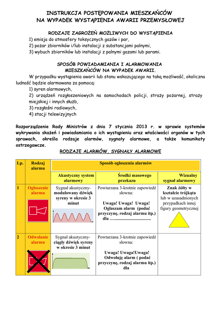 INSTRUKCJA POSTĘPOWANIA MIESZKAŃCÓW NA WYPADEK WYSTĄPIENIA AWARII PRZEMYSŁOWEJ RODZAJE ZAGROŻEŃ MOŻLIWYCH DO WYSTĄPIENIA 1) emisja do atmosfery toksycznych gazów i par, 2) pożar zbiorników i/lub instalacji z substancjami palnymi, 3) wybuch zbiorników lub instalacji z palnymi gazami lub parami. SPOSÓB POWIADAMIANIA I ALARMOWANIA MIESZKAŃCÓW NA WYPADEK AWARII. W przypadku wystąpienia awarii lub stanu wskazującego na taką możliwość, okoliczna ludność będzie alarmowana za pomocą: 1) syren alarmowych, 2) urządzeń rozgłoszeniowych na samochodach policji, straży pożarnej, straży miejskiej i innych służb, 3) rozgłośni radiowych, 4) stacji telewizyjnych Rozporządzenie Rady Ministrów z dnia 7 stycznia 2013 r. w sprawie systemów wykrywania skażeń i powiadamiania o ich wystąpieniu oraz właściwości organów w tych sprawach, określa rodzaje alarmów, sygnały alarmowe, a także komunikaty ostrzegawcze. RODZAJE ALARMÓW, SYGNAŁY ALARMOWE Lp. Rodzaj alarmu Sposób ogłoszenia alarmów Akustyczny system alarmowy 1 2 Ogłoszenie alarmu Odwołanie alarmu Środki masowego przekazu Sygnał akustycznymodulowany dźwięk syreny w okresie 3 minut Powtarzana 3-krotnie zapowiedź słowna: Sygnał akustycznyciągły dźwięk syreny w okresie 3 minut Powtarzana 3-krotnie zapowiedź słowna: Uwaga! Uwaga! Uwaga! Ogłaszam alarm (podać przyczynę, rodzaj alarmu itp.) dla …................................. Uwaga! Uwaga!Uwaga! Odwołuję alarm ( podać przyczynę, rodzaj alarmu itp.) dla Wizualny sygnał alarmowy Znak żółty w kształcie trójkąta lub w uzasadnionych przypadkach innej figury geometrycznej KOMUNIKATY OSTRZEGAWCZE Lp. Rodzaj komunikatu Sposób ogłoszenia komunikatu Akustycz ny system alarmowy Środki masowego przekazu Sposób odwołania komunikatu Akustycz Środki masowego przekazu ny system alarmowy 1 Uprzedzenie o zagrożeniu skażeniami Powtarzana 3-krotnie zapowiedź słowna: Uwaga! Uwaga! Uwaga! Osoby znajdujące się na terenie ...około godziny … min … może nastąpić skażenie ….. ( podać rodzaj skażenia) w kierunku ( podać kierunek) Powtarzana 3-krotnie zapowiedź słowna: Uwaga! Uwaga!Uwaga! Odwołuję uprzedzenie o zagrożeniu ( podać rodzaj skażenia) dla …......................... 2 Uprzedzenie o zagrożeniu zakażeniami Formę i treść komunikatu uprzedzenie o zagrożeniu zakażeniami ustalają organy Państwowej Inspekcji Sanitarnej Powtarzana 3-krotnie zapowiedź słowna: Uwaga! Uwaga!Uwaga! Odwołuję uprzedzenie o zagrożeniu (podać rodzaj zakażenia) dla ….................. 3 Uprzedzenie o klęskach żywiołowych i zagrożeniu środowiska Powtarzana 3-krotnie zapowiedź słowna: Informacja o zagrożeniu i sposobie postępowania mieszkańców …................. ( podać rodzaj zagrożenia, spodziewany czas wystąpienia i wytyczne dla mieszkańców). Powtarzana 3-krotnie zapowiedź słowna: Uwaga! Uwaga!Uwaga!Odwołuję uprzedzenie o zagrożeniu (podać rodzaj klęski) dla ….................. WYKAZ TELEFONÓW SŁUŻB ODPOWIEDZIALNYCH ZA PODJĘCIE DZIAŁAŃ RATOWNICZYCH Lp. Podmiot Nr telefonu 1. Policja 997 2. Straż Pożarna 998 3. Pogotowie Ratunkowe 999 4. Ogólny nr alarmowy 112 SPOSÓB POSTĘPOWANIA W SYTUACJACH WYSTĄPIENIA ZAGROŻENIA. A. W przypadku wystąpienia awarii chemicznej w postaci emisji do atmosfery toksycznych gazów i par należy: 1. Przebywając w terenie otwartym: – opuścić jak najszybciej zagrożony teren prostopadle do kierunku wiatru. 2. Przebywając w pomieszczeniach: − pozamykać i uszczelnić drzwi, okna i otwory wentylacyjne (używaj taśmy klejącej, mokrych ręczników lub prześcieradeł), − wyłączyć urządzenia wentylacyjne, − oddychać przez maseczkę wykonaną ze zwilżonej gazy, waty, ręcznika itp., − włączyć radio lub telewizor na pasmo stacji lokalnej i stosować się ściśle do przekazywanych poleceń i instrukcji, − słuchać ogłoszeń przekazywanych przez głośniki samochodowe służb ratowniczych, − nie palić papierosów, wygasić wszystkie źródła ognia, − nie jeść żywności i nie pić płynów, które mogły ulec skażeniu, − czekać na odwołanie alarmu o zagrożeniu. 3. Stosować się do poleceń wydawanych przez podmioty prowadzące działania ratownicze. B. W przypadku wystąpienia pożaru palnych cieczy lub gazów należy: 1. Opuścić strefę znajdującą się na kierunku rozprzestrzeniania się chmury produktów spalania. 2. Ze względu na promieniowanie cieplne i możliwość wybuchu palnych gazów lub par cieczy, zachować od miejsca pożaru bezpieczną odległość. 3. Stosować się do wskazówek dotyczących emisji toksycznych par i gazów. C. W przypadku wystąpienia wybuchu par cieczy lub gazów należy: 1. Po usłyszeniu wybuchu schronić się przed spadającymi odłamkami lub częściami urządzeń i instalacji. 2. Zachować środki bezpieczeństwa dotycząceemisji lub pożaru gazów i cieczy palnych. JW/DS/SK OKW PSP/
