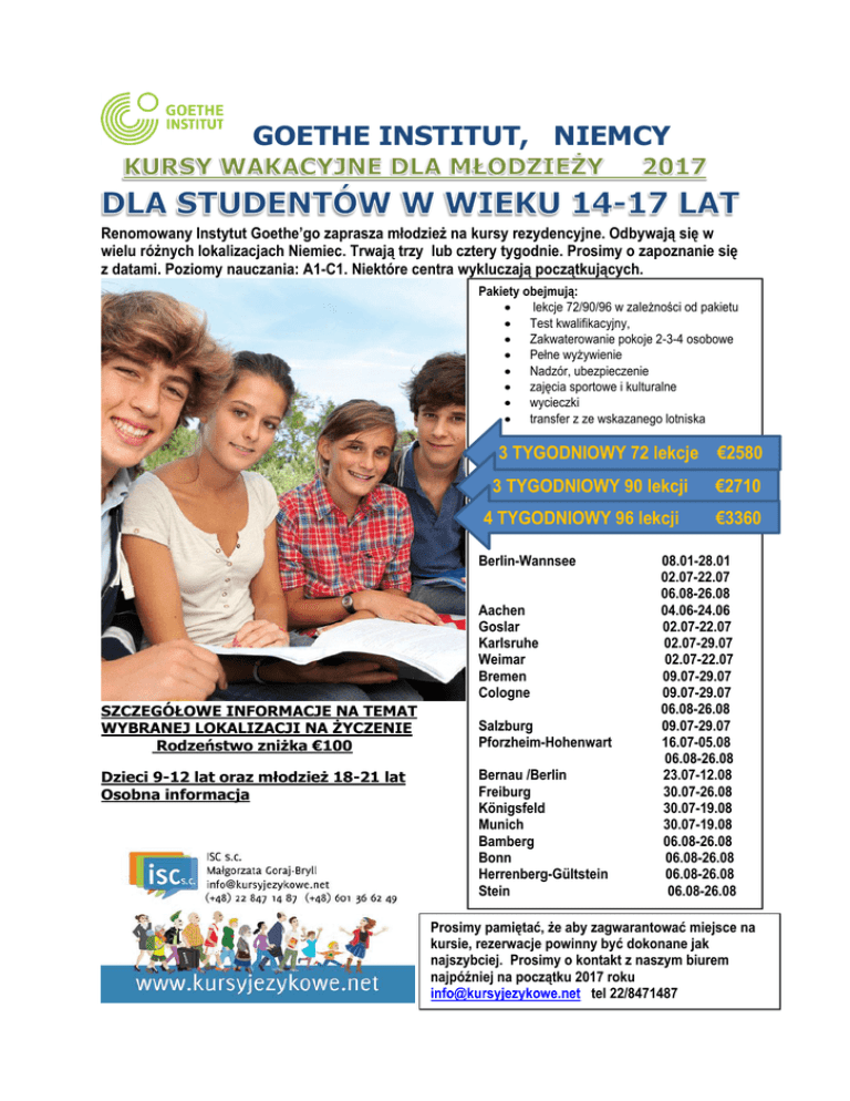 GOETHE INSTITUT, NIEMCY Renomowany Instytut Goethe’go zaprasza młodzież na kursy rezydencyjne. Odbywają się w wielu różnych lokalizacjach Niemiec. Trwają trzy lub cztery tygodnie. Prosimy o zapoznanie się z datami. Poziomy nauczania: A1-C1. Niektóre centra wykluczają początkujących. Pakiety obejmują: lekcje 72/90/96 w zależności od pakietu Test kwalifikacyjny, Zakwaterowanie pokoje 2-3-4 osobowe Pełne wyżywienie Nadzór, ubezpieczenie zajęcia sportowe i kulturalne wycieczki transfer z ze wskazanego lotniska 3 TYGODNIOWY 72 lekcje €2580 3 TYGODNIOWY 72 lekcje €2440 3 TYGODNIOWY 90 lekcji 4 TYGODNIOWY 96 lekcji Berlin-Wannsee Aachen Goslar Karlsruhe Weimar Bremen Cologne SZCZEGÓŁOWE INFORMACJE NA TEMAT WYBRANEJ LOKALIZACJI NA ŻYCZENIE Rodzeństwo zniżka €100 Dzieci 9-12 lat oraz młodzież 18-21 lat Osobna informacja Salzburg Pforzheim-Hohenwart Bernau /Berlin Freiburg Königsfeld Munich Bamberg Bonn Herrenberg-Gültstein Stein €2710 €3360 08.01-28.01 02.07-22.07 06.08-26.08 04.06-24.06 02.07-22.07 02.07-29.07 02.07-22.07 09.07-29.07 09.07-29.07 06.08-26.08 09.07-29.07 16.07-05.08 06.08-26.08 23.07-12.08 30.07-26.08 30.07-19.08 30.07-19.08 06.08-26.08 06.08-26.08 06.08-26.08 06.08-26.08 Prosimy pamiętać, że aby zagwarantować miejsce na kursie, rezerwacje powinny być dokonane jak najszybciej. Prosimy o kontakt z naszym biurem najpóźniej na początku 2017 roku [email protected] tel 22/8471487