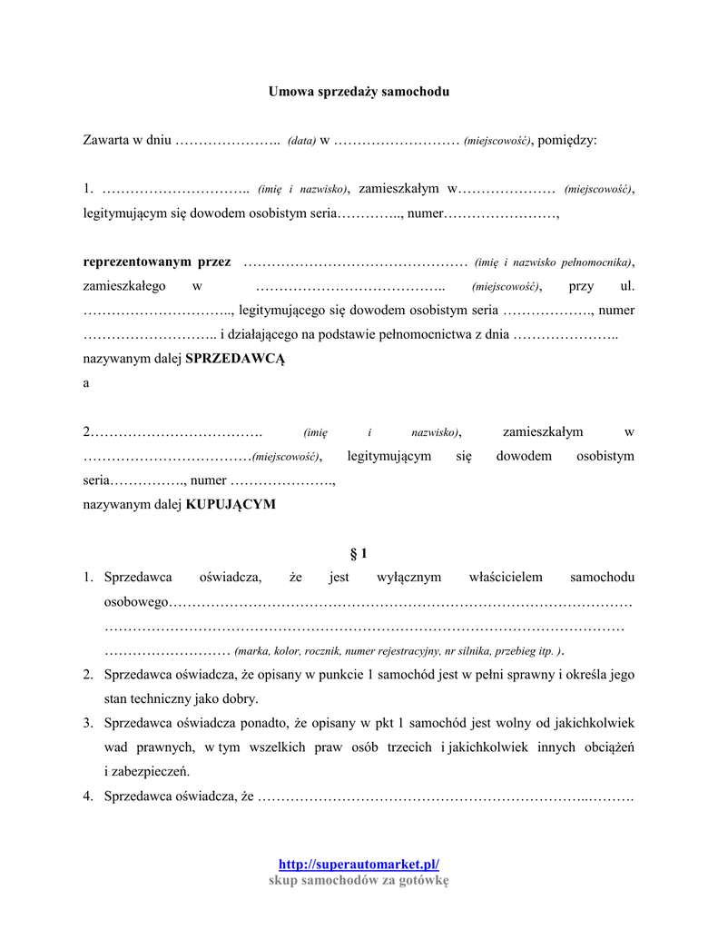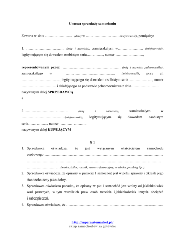 Umowa sprzedaży samochodu Zawarta w dniu ………………….. (data) w ……………………… (miejscowość), pomiędzy: 1. ………………………….. (imię i nazwisko), zamieszkałym w………………… (miejscowość), legitymującym się dowodem osobistym seria………….., numer……………………, reprezentowanym przez ………………………………………… (imię i nazwisko pełnomocnika), zamieszkałego w ………………………………….. (miejscowość), przy ul. ………………………….., legitymującego się dowodem osobistym seria ………………., numer ……………………….. i działającego na podstawie pełnomocnictwa z dnia ………………….. nazywanym dalej SPRZEDAWCĄ a 2………………………………. (imię i ………………………………(miejscowość), nazwisko), legitymującym zamieszkałym się dowodem w osobistym seria……………., numer …………………., nazywanym dalej KUPUJĄCYM §1 1. Sprzedawca oświadcza, że jest wyłącznym właścicielem samochodu osobowego……………………………………………………………………………………… ………………………………………………………………………………………………… ……………………… (marka, kolor, rocznik, numer rejestracyjny, nr silnika, przebieg itp. ). 2. Sprzedawca oświadcza, że opisany w punkcie 1 samochód jest w pełni sprawny i określa jego stan techniczny jako dobry. 3. Sprzedawca oświadcza ponadto, że opisany w pkt 1 samochód jest wolny od jakichkolwiek wad prawnych, w tym wszelkich praw osób trzecich i jakichkolwiek innych obciążeń i zabezpieczeń. 4. Sprzedawca oświadcza, że ……………………………………………………………..………. http://superautomarket.pl/ skup samochodów za gotówkę §2 1. Kupujący oświadcza, że samochód określony w pkt 1 § 1 umowy widział, a także dokonał jego wnikliwego przeglądu technicznego osobiście i w autoryzowanym warsztacie …………………………………………………………………………………………..……… 2. Kupujący oświadcza ponadto, że nie wnosi jakichkolwiek zastrzeżeń zarówno co do stanu technicznego samochodu, jego właściwości, jego wszystkich parametrów, jak i także jego wyglądu. §3 1. Sprzedawca sprzedaje, a Kupujący kupuje samochód opisany w § 1 pkt 1 za cenę …….zł. 2. Potwierdzenie uiszczenia ceny będzie poświadczone pokwitowaniem na podstawie potwierdzonego przelewu. Z tytułu niezapłaconej w terminie raty naliczane będą odsetki umowne w wysokości …….... proc. w skali roku. 3. Wydanie przedmiotu umowy nastąpi niezwłocznie po podpisaniu niniejszej umowy. 4. Wraz z wydaniem przedmiotu umowy Sprzedawca przekaże Kupującemu wszelkie posiadane przez niego rzeczy służące do korzystania z samochodu, w tym dwa komplety kluczyków. Sprzedawca wyda także Kupującemu niezbędne dokumenty związane z samochodem, w tym dowód rejestracyjny, instrukcję obsługi oraz wykaz autoryzowanych stacji i serwisów. §4 1. Koszty zawarcia niniejszej umowy ponosi Kupujący. 2. Wszelkie zmiany niniejszej umowy pod rygorem nieważności wymagają formy pisemnej. 3. W sprawach nieuregulowanych zastosowanie znajdą przepisy Kodeksu cywilnego. 4. Załączniki do umowy stanowią integralna jej część. 5. Umowę sporządzono w dwóch jednobrzmiących egzemplarzach, umowę odczytano, zgodnie przyjęto i podpisano. W IMIENIU SPRZEDAWCY KUPUJĄCY ……………………………… ……………………………… http://superautomarket.pl/ skup samochodów za gotówkę Załączniki: 1. Pełnomocnictwo udzielone ……………………………….., przez ……………………..z dnia ……………………. http://superautomarket.pl/ skup samochodów za gotówkę