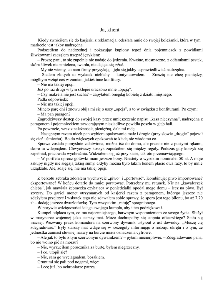Ja, klient Kiedy zwróciłem się do kasjerki z reklamacją, odesłała mnie do swojej koleżanki, która w tym markecie jest jakby nadrzędną. Podszedłem do nadrzędnej i pokazując kupiony tegoż dnia pojemniczek z powidłami śliwkowymi zacząłem trzepać językiem: – Proszę pani, to się zupełnie nie nadaje do jedzenia. Kwaśne, niesmaczne, z odłamkami pestek, skóra śliwek nie zmielona, twarda, nie dająca się zżuć. – My nie wiemy, co nam firmy przysyłają – jęła się jakby usprawiedliwiać nadrzędna. – Siedem złotych to wydatek niebłahy – kontynuowałem. – Zresztą nie chcę pieniędzy, mógłbym wziąć coś w zamian, jakieś inne konfitury. – Nie ma takiej opcji. Już po raz drugi w tym sklepie uraczono mnie „opcją”. – Czy makrela nie jest sucha? – zapytałem onegdaj kobietę z działu mięsnego. Padła odpowiedź: – Nie ma takiej opcji. Minęło parę dni i znowu obija mi się o uszy „opcja”, a to w związku z konfiturami. Po czym: – Ma pan paragon? Zagrodziwszy dostęp do swojej kasy przez umieszczenie napisu „kasa nieczynna”, nadrzędna z paragonem i pojemniczkiem zawierającym niezjadliwe powidła poszła w głąb hali. Po powrocie, wraz z należnością pieniężną, dała mi radę: – Następnym razem niech pan wybiera opakowanie małe i drogie (przy słowie „drogie” pojawił się cień uśmiechu). Bo do większych opakowań to kładą nie wiadomo co. Sprawa została pomyślnie załatwiona, można iść do domu, ale przecie nie z pustymi rękami, skoro tu wdepnąłem. Chwyciwszy koszyk zapuściłem się między regały. Podczas gdy koszyk się zapełniał, pracowała wyobraźnia. Widziałem się już przy kasie, tak oto przemawiającego: – W portfelu oprócz gotówki mam jeszcze bony. Niestety o wysokim nominale: 50 zł. A moje zakupy nigdy nie sięgają takiej sumy. Gdyby można było takim bonem płacić dwa razy, to by mnie urządzało. Ale, zdaje się, nie ma takiej opcji. Z bełkotu żebraka zdołałem wychwycić „piwo” i „portować”. Kombinuję: piwo importowane? eksportowane? W końcu dotarło do mnie: poratować. Potrzebny mu ratunek. Nie na „kawałeczek chleba”, jak mawiała żebraczka czyhająca w poniedziałki opodal mego domu – lecz na piwo. Był szczery. Do garści monet otrzymanych od kasjerki razem z paragonem, którego jeszcze nie zdążyłem przejrzeć i wskutek tego nie zdawałem sobie sprawy, że sporo jest tego bilonu, bo aż 7,70 zł – dodaję jeszcze dwuzłotówkę. Tym wszystkim „ratuję” spragnionego. W porywie wdzięczności ściąga swojego kumpla, aby i ten podziękował. Kumpel odpłaca tym, co ma najcenniejszego, barwnym wspomnieniem ze swego życia. Służył w marynarce wojennej jako starszy mat. Może dochrapałby się stopnia oficerskiego? Stało się inaczej. Wezwany przez komandora na czerwony dywanik usłyszał z ust dowódcy: „Muszę cię zdegradować.” Były starszy mat wdaje się w szczegóły informując o rodzaju okrętu i o tym, że jednostka zamiast słownej nazwy na burcie miała oznaczenia cyfrowe. – Ale jak to było z tym czerwonym dywanikiem? – pytam niecierpliwie. – Zdegradowano pana, bo nie wolno pić na morzu? – Nie, wyrzuciłem porucznika za burtę, byłem niegrzeczny. – I co, utopił się? – Nie, sam go wyciągnąłem, bosakiem. Grunt mi się pali pod nogami, więc: – Lecę już, bo ochroniarze patrzą. 1 Niełatwo uwolnić dłoń z uścisku. Wyszarpnąłem ją pod pretekstem, że chcę podać grabę także temu drugiemu. Ten drugi życzy mi wszystkiego najlepszego, mnie i całej mojej rodzinie, wnuczkom też, „bo chyba pan ma”. . Widząc, że poprzedzająca mnie klientka płaci bonami, zwróciłem się do niej z prośbą: „Czy nie byłaby pani skłonna dać mi pięć bonów 10-złotowych w zamian za bon 50-złotowy?” Nie, nie była skłonna. Wtedy odezwała się kasjerka: – Bony 10-złotowe? Ja panu dam. – Przy okazji dowiem się, jak pani na imię – rzekłem ze wzrokiem wlepionym w przypiętą do fartucha plakietkę. – Wiktoria. Imiona nadał jej dziadek: na pierwsze Małgorzata, na drugie Wiktoria. Nie poprzestając na tych informacjach dodała coś ku memu oświeceniu: pierwsze imię pochodzi z greckiego i oznacza perłę, a drugie z łaciny i znaczy zwycięstwo. Po raz wtóry pogadałem sobie z Wiktorią, gdy w głębi hali, stojąc na schodkach, układała towar na półce. Jaka dowcipna! Przechodzącej koleżance, która się niby zatrwożyła o Wiktorię mówiąc: „Nie spadnij”, odpaliła: „Może mnie kto złapie.” Chętnie bym się znalazł na miejscu tego kogoś. Nie miałbym nic przeciw temu, aby Wiktoria, niewysoka, ale zgrabna, z ładną, pulchną buziulką, osunęła się w moje ramiona. Zbliżyłem się. – Dzień dobry, pani Wiktorio. Szkoda, że dziś nie mogę załatwić transakcji z panią. Bo ja zawsze ze swoimi zakupami walę prosto do pani. Ona też zauważyła, że wszyscy do niej. Ma wskutek tego więcej roboty, lecz mimo to lubi być „na kasie”. Zeszła ze schodków i nie przerywając układania słoików mówiła o sobie i swojej pracy. A więc o milionowym zadłużeniu całego tego interesu i złym traktowaniu pracownic przez szefa. Jedno z drugim idzie w parze. Jeśli zniechęcone sprzedawczynie odejdą z własnej inicjatywy, tym lepiej. Szefowi to na rękę. Owo przykre zadanie: redukcja personelu, jest tym sposobem ułatwione. Nie wolno nawet kasjerce pić wody. Picie ma swoją stronę odwrotną: siusiu. – Jak dziewczyna musi wstać od kasy, żeby pójść do kibla, to problem, bo klienci z koszykami czekają. Do pensji wynoszącej 1400 zł dochodzi premia, ale o nią nie tak łatwo. Premia jest wynagrodzeniem za „wystawkę”. Pracownica musi wystawić to, co widnieje w reklamowym pisemku. Wymaga się od niej natychmiastowego uzupełniania asortymentu, zgodnie z zawartością ilustrowanej broszurki. Chodzi o to, żeby klient odnalazł na półkach wszystko, co sobie