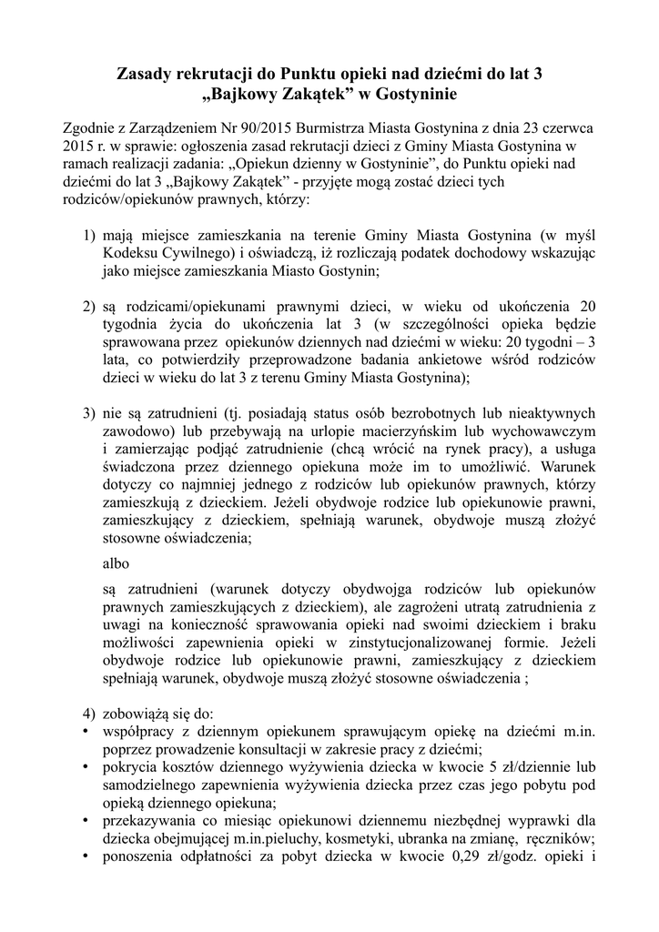 Zasady rekrutacji do Punktu opieki nad dziećmi do lat 3 „Bajkowy Zakątek” w Gostyninie Zgodnie z Zarządzeniem Nr 90/2015 Burmistrza Miasta Gostynina z dnia 23 czerwca 2015 r. w sprawie: ogłoszenia zasad rekrutacji dzieci z Gminy Miasta Gostynina w ramach realizacji zadania: „Opiekun dzienny w Gostyninie”, do Punktu opieki nad dziećmi do lat 3 „Bajkowy Zakątek” - przyjęte mogą zostać dzieci tych rodziców/opiekunów prawnych, którzy: 1) mają miejsce zamieszkania na terenie Gminy Miasta Gostynina (w myśl Kodeksu Cywilnego) i oświadczą, iż rozliczają podatek dochodowy wskazując jako miejsce zamieszkania Miasto Gostynin; 2) są rodzicami/opiekunami prawnymi dzieci, w wieku od ukończenia 20 tygodnia życia do ukończenia lat 3 (w szczególności opieka będzie sprawowana przez opiekunów dziennych nad dziećmi w wieku: 20 tygodni – 3 lata, co potwierdziły przeprowadzone badania ankietowe wśród rodziców dzieci w wieku do lat 3 z terenu Gminy Miasta Gostynina); 3) nie są zatrudnieni (tj. posiadają status osób bezrobotnych lub nieaktywnych zawodowo) lub przebywają na urlopie macierzyńskim lub wychowawczym i zamierzając podjąć zatrudnienie (chcą wrócić na rynek pracy), a usługa świadczona przez dziennego opiekuna może im to umożliwić. Warunek dotyczy co najmniej jednego z rodziców lub opiekunów prawnych, którzy zamieszkują z dzieckiem. Jeżeli obydwoje rodzice lub opiekunowie prawni, zamieszkujący z dzieckiem, spełniają warunek, obydwoje muszą złożyć stosowne oświadczenia; albo są zatrudnieni (warunek dotyczy obydwojga rodziców lub opiekunów prawnych zamieszkujących z dzieckiem), ale zagrożeni utratą zatrudnienia z uwagi na konieczność sprawowania opieki nad swoimi dzieckiem i braku możliwości zapewnienia opieki w zinstytucjonalizowanej formie. Jeżeli obydwoje rodzice lub opiekunowie prawni, zamieszkujący z dzieckiem spełniają warunek, obydwoje muszą złożyć stosowne oświadczenia ; 4) zobowiążą się do: • współpracy z dziennym opiekunem sprawującym opiekę na dziećmi m.in. poprzez prowadzenie konsultacji w zakresie pracy z dziećmi; • pokrycia kosztów dziennego wyżywienia dziecka w kwocie 5 zł/dziennie lub samodzielnego zapewnienia wyżywienia dziecka przez czas jego pobytu pod opieką dziennego opiekuna; • przekazywania co miesiąc opiekunowi dziennemu niezbędnej wyprawki dla dziecka obejmującej m.in.pieluchy, kosmetyki, ubranka na zmianę, ręczników; • ponoszenia odpłatności za pobyt dziecka w kwocie 0,29 zł/godz. opieki i uiszczania tych opłat w terminie do dnia 10 dnia każdego miesiąca za miesiąc poprzedni. Rodzice ubiegający się o zapewnienie opieki sprawowanej w formie dziennego opiekuna zobowiązani są do złożenia: 1. karty zgłoszeniowej dziecka; 2. oświadczenia rodzica/opiekuna prawnego dziecka zgodnie z wzorem – dla osób niepracujących lub 3. oświadczenia rodzica/opiekuna prawnego dziecka zgodnie z wzorem – dla osób pracujących; 4. w przypadku opiekunów prawnych dzieci – kserokopii stosownego dokumentu, z którego wynika prawo opieki nad dzieckiem; 5. kserokopii dowodu osobistego.