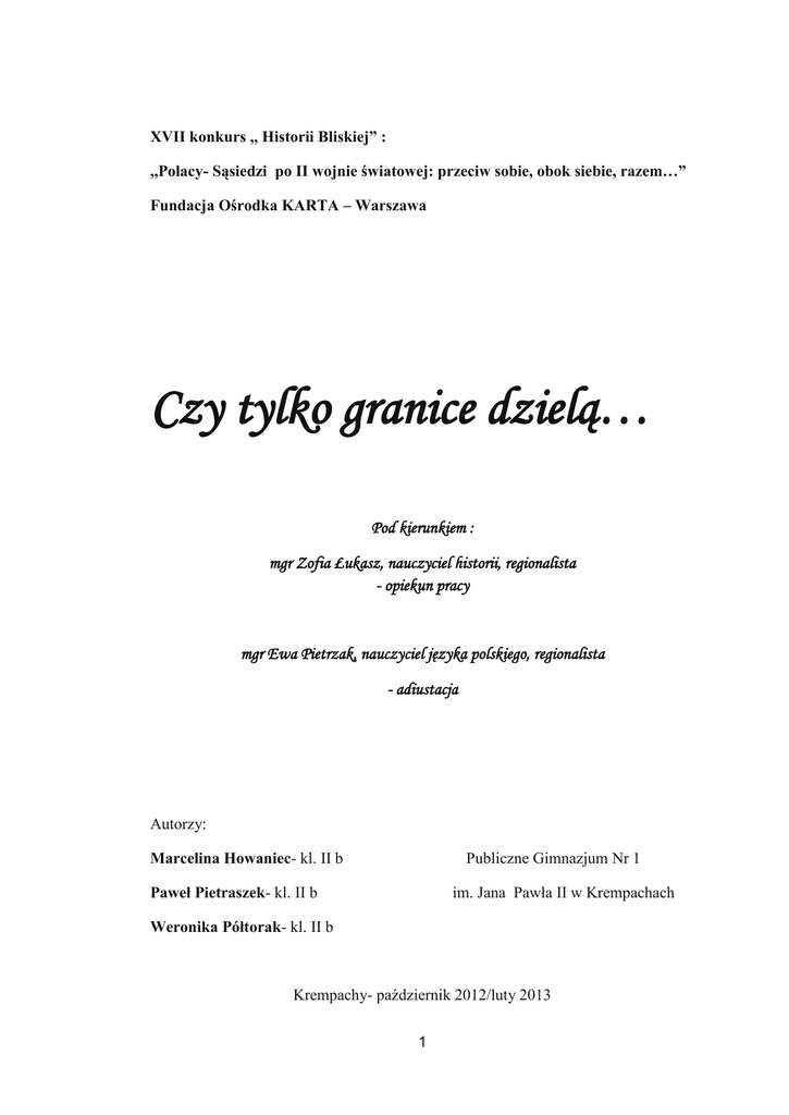 XVII konkurs ,, Historii Bliskiej” : ,,Polacy- Sąsiedzi po II wojnie światowej: przeciw sobie, obok siebie, razem…” Fundacja Ośrodka KARTA – Warszawa Czy tylko granice dzielą… Pod kierunkiem : mgr Zofia Łukasz, nauczyciel historii, regionalista - opiekun pracy mgr Ewa Pietrzak, nauczyciel języka polskiego, regionalista - adiustacja Autorzy: Marcelina Howaniec- kl. II b Publiczne Gimnazjum Nr 1 Paweł Pietraszek- kl. II b im. Jana Pawła II w Krempachach Weronika Półtorak- kl. II b Krempachy- październik 2012/luty 2013 1 Czy tylko granice dzielą… 2 Plan pracy 1. Wprowadzenie.....................................................................................4 2. Nasze korzenie.....................................................................................5 3. Krótka historia problemów ludnościowych Spisza...............................6 4. Konsekwencje przynależności Spisza do Słowacji w czasie II wojny światowej.................................................................................................8 5. ...przy wspólnej robocie......................................................................12 6. Pogłębianie podziału..........................................................................15 7. Zatarg narodowościowy w parafiach Krempachy i Nowa Biała..........18 8. Trudne lata 60-te i 70-te.....................................................................31 9. Narodowość w szkole.........................................................................36 10. Pustelnica ze Spisza wobec konfliktów w Kościele...........................38 11. Łagodzenie konfliktu.........................................................................41 12.Zakończenie.......................................................................................44 13. Streszczenie......................................................................................46 Bibliografia..............................................................................................48 Załączniki................................................................................................52 3 Wprowadzenie Wątpliwości rodzą wolę działania. Tak było w przypadku pracy pt. „Czy tylko granice dzielą…”. Liczne pytania powstałe w wyniku wnikliwej obserwacji społeczności wiejskiej w Krempachach i Nowej Białej na Spiszu przyczyniły się do potrzeby zgłębienia zagadnień dotyczących przyczyn i skutków powstałych w tych miejscowościach antagonizmów narodowościowych. Uczniowie, autorzy pracy pochodzą z rodzin o słowackich i polskich korzeniach. Nie czują z tego powodu żadnego dyskomfortu. Chodzą do jednej klasy, spotykają się codziennie, rozmawiają, darzą przyjaźnią. Mają wiele ze sobą wspólnego. Wiedzą, że inaczej było z ich dziadkami, dla których podstawową wartością i miarą człowieka było określenie, czy jest Polakiem, czy Słowakiem. Młodzież zaczęła pytać, dlaczego i czy zawsze tak było. Przeprowadzone przez nią badania, wywiady oraz analiza bogatej dokumentacji doprowadziły do wielu istotnych wniosków. Najczęstszym i powtarzanym wielokrotnie jest ten, że bez obiektywnego spojrzenia na niejednokrotnie bolesną przeszłość, nie można tworzyć prawdziwych międzyludzkich relacji i budować przyszłości. Zmierzenie się z tym tematem było dla nich bardzo wielkim wyzwaniem, gdyż ich przodkowie stali po „przeciwnych stronach barykady”. Dla nauczyciela, opiekuna projektu, również nie było to łatwe, gdyż musiał sam „stawić czoła ciemnym duchom przeszłości”. Wieloletnia praca wśród młodzieży ze zwaśnionych regionów (Podhale- Spisz, Polacy- Słowacy) uczy dystansu do problemu, z którym spotyka się codziennie. Układanie poprawnych stosunków z ludźmi tu żyjącymi może przebiegać tylko wówczas, kiedy stanie się w prawdzie. To stało się celem tej pracy. 4 Nasze korzenie Nasi rodzice, dziadkowie i pradziadkowie mieszkali i mieszkają na Spiszu, stąd pochodzili i tutaj my jesteśmy zakorzenieni. Jesteśmy „Tu s tela”. Poszukiwanie i badanie śladów przeszłości stało się dla nas ogromnym wyzwaniem. Historia naszej wsi i tragedia, która dotknęła rodziny tu zamieszkałe, żyje nadal w ich pamięci. Wielu z naszych rozmówców nie wyraziło zgody na nagrywanie ścieżki dźwiękowej wywiadów, uważając, że to jest dla nas młodych „za duża polityka”. Trudno w tej chwili zająć stanowisko, czym się kierowali. Czy nadal w nich jest lęk, że problemy podziału narodowościowego powrócą, sąsiad dla sąsiada i brat dla brata będzie wrogiem? Może tak, a może nadal boją się spojrzeć prawdzie w oczy. W rozmowach, w wielu przypadkach wyczuwaliśmy ogromny lęk . A może nie mogą przebaczyć sobie i bliskim, że dali się uwikłać w to, że działacze partyjni i słowaccy agitatorzy dla własnej korzyści manipulowali wieloma mieszkańcami Nowej Białej i Krempach? Przecież tu wręcz dochodziło do utarczek słownych, a nawet rękoczynów. Zmiany granic, przynależność administracyjna, naciski polityczne odgrywają znaczącą rolę w tworzeniu konfliktów narodowościowych pogranicza. Historia Spisza- malowniczego terenu w dolinie Białki jest tego niezbitym dowodem (Polski Spisz- krańce od południa graniczą ze Słowacją, od zachodu odznaczone korytem Białki, od północy rzeki Dunajec i pasmem Pienin- od wschodu). Aby zrozumieć problemy narodowościowe, które rozgrywały się w Krempachach i Nowej Białej po II wojnie światowej aż prawie do czasów nam współczesnych, należy sięgnąć do pamięci świadków tamtych wydarzeń. Zdajemy sobie sprawę z tego, że niejednokrotnie będzie to subiektywna opowieść. 5 Krótka historia problemów ludnościowych Spisza Znamienitym wydarzeniem, które zadecydowało o przynależności Spisza do Polski, był upadek monarchii austro-węgierskiej. Po 123 latach niewoli Polska odzyskała niepodległość, natomia