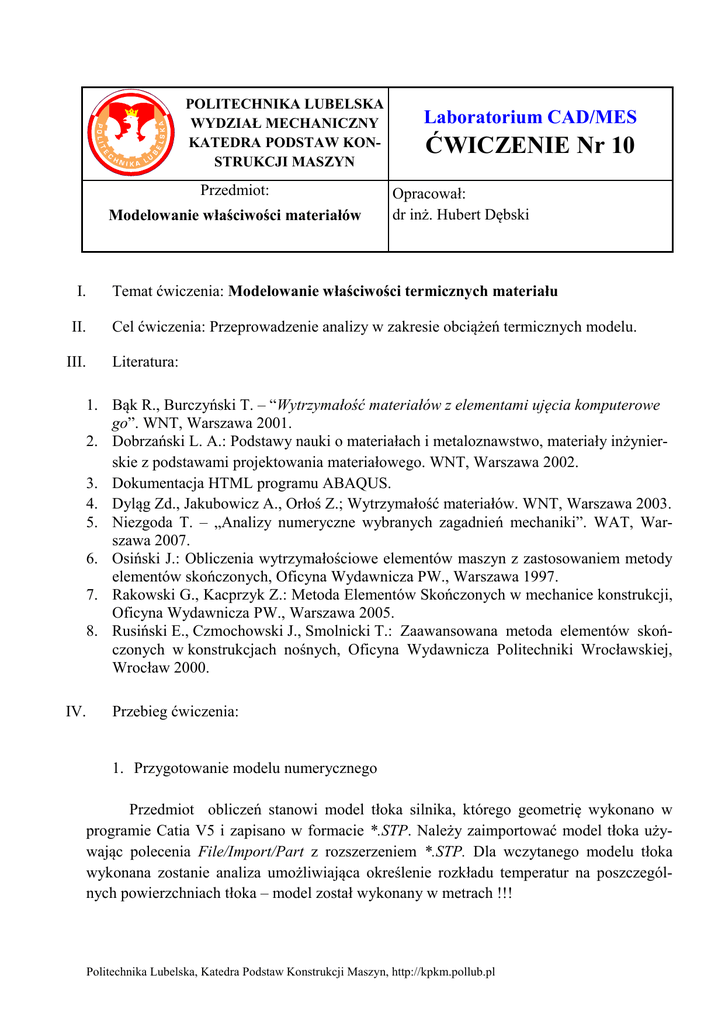 POLITECHNIKA LUBELSKA WYDZIAŁ MECHANICZNY KATEDRA PODSTAW KONSTRUKCJI MASZYN Przedmiot: Modelowanie właściwości materiałów I. II. III. Laboratorium CAD/MES ĆWICZENIE Nr 10 Opracował: dr inż. Hubert Dębski Temat ćwiczenia: Modelowanie właściwości termicznych materiału Cel ćwiczenia: Przeprowadzenie analizy w zakresie obciążeń termicznych modelu. Literatura: 1. Bąk R., Burczyński T. – “Wytrzymałość materiałów z elementami ujęcia komputerowe go”. WNT, Warszawa 2001. 2. Dobrzański L. A.: Podstawy nauki o materiałach i metaloznawstwo, materiały inżynierskie z podstawami projektowania materiałowego. WNT, Warszawa 2002. 3. Dokumentacja HTML programu ABAQUS. 4. Dyląg Zd., Jakubowicz A., Orłoś Z.; Wytrzymałość materiałów. WNT, Warszawa 2003. 5. Niezgoda T. – „Analizy numeryczne wybranych zagadnień mechaniki”. WAT, Warszawa 2007. 6. Osiński J.: Obliczenia wytrzymałościowe elementów maszyn z zastosowaniem metody elementów skończonych, Oficyna Wydawnicza PW., Warszawa 1997. 7. Rakowski G., Kacprzyk Z.: Metoda Elementów Skończonych w mechanice konstrukcji, Oficyna Wydawnicza PW., Warszawa 2005. 8. Rusiński E., Czmochowski J., Smolnicki T.: Zaawansowana metoda elementów skończonych w konstrukcjach nośnych, Oficyna Wydawnicza Politechniki Wrocławskiej, Wrocław 2000. IV. Przebieg ćwiczenia: 1. Przygotowanie modelu numerycznego Przedmiot obliczeń stanowi model tłoka silnika, którego geometrię wykonano w programie Catia V5 i zapisano w formacie *.STP. Należy zaimportować model tłoka używając polecenia File/Import/Part z rozszerzeniem *.STP. Dla wczytanego modelu tłoka wykonana zostanie analiza umożliwiająca określenie rozkładu temperatur na poszczególnych powierzchniach tłoka – model został wykonany w metrach !!! Politechnika Lubelska, Katedra Podstaw Konstrukcji Maszyn, http://kpkm.pollub.pl Rys.1 Model geometryczny i obliczeniowy tłoka Charakterystyka modelu dyskretnego: - właściwości materiałowe: do zdefiniowania obliczeń termicznych należy przyjąć charakterystyki materiału tłoka – aluminium, podane w tabeli Tabela 1 Właściwości materiału tłoka Wartość Moduł Younga, E [Pa] 69 000 000 Liczba Poisona 0,33 3 2700 kg/m3 Gęstość ρ [kg/m ] Współczynnik rozszerzal24⋅10-6 ności cieplnej α [1/K] Współczynnik przewodze220 W/m*K nia ciepła λ [W/mK] Ciepło właściwe 934 J/kgK - warunki brzegowe: utwierdzenie powierzchni otworów w tłoku poprzez zablokowanie 3 translacyjnych stopni swobody węzłom, - obciążenie modelu: – należy zdefiniować parametry obciążenia termicznego dla następujących powierzchni tłoka – rys.2: © Copyright by H.Dębski, Lublin University of Technology, 2011 2 Rys.2 Termiczne warunki brzegowe modelu tłoka Definicję obciążenia termicznego poszczególnych powierzchni tłoka określa się poprzez podanie parametrów przenikalności cieplnej powierzchni i temperatury czynnika opływającego powierzchnię – tabela 2. Tabela 2 Wartości obciążenia termicznego poszczególnych powierzchni tłoka Nazwa powierzchni α [W/m2K] T [°C] Powierzchnia górna 350 480 Powierzchnia boczna górna 200 200 (nad pierścieniami) Powierzchnia pierścieni 220 180 Powierzchnia zewnętrzna 100 60 dolna Powierzchnia wewnętrzna 150 60 Powierzchnia styku ze 600 130 sworzniem - siatka MES: do dyskretyzacji modelu należy zastosować siatkę elementów skończonych opartą na elementach bryłowych typu tetragonalnego z liniową funkcją kształtu o oznaczeniu DC3D4 (przeznaczonych do liniowej analizy termicznej); gęstość siatki przyjąć 0.009m, © Copyright by H.Dębski, Lublin University of Technology, 2011 3 - typ analizy: należy zdefiniować analizę termiczną typu Heat transfer z wykorzystaniem opcji Transient, przyjmując czas obliczeń 300 s oraz początkową wartość incrementu 1s, - edycja i interpretacja wyników: w module Visualisation należy wyedytować mapę rozkładu temperatury w modelu tłoka – rys.3. Przeprowadzić dyskusję dotyczacą otrzymanych wyników. Rys.3 Mapa temperatury w modelu tłoka © Copyright by H.Dębski, Lublin University of Technology, 2011 4
