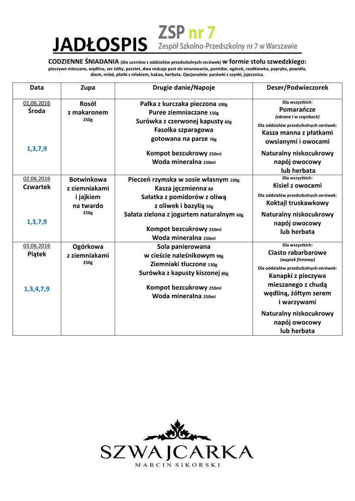 JADŁOSPIS CODZIENNE ŚNIADANIA (dla uczniów z oddziałów przedszkolnych-zerówek) w formie stołu szwedzkiego: pieczywo mieszane, wędlina, ser żółty, pasztet, dwa rodzaje past do smarowania, pomidor, ogórek, rzodkiewka, papryka, powidła, dżem, miód, płatki z mlekiem, kakao, herbata. Opcjonalnie: parówki z szynki, jajecznica. Data Zupa Drugie danie/Napoje 01.06.2016 Rosół z makaronem Pałka z kurczaka pieczona 100g Puree ziemniaczane 150g Surówka z czerwonej kapusty 60g Fasolka szparagowa gotowana na parze 70g Środa 250g 1,3,7,9 02.06.2016 Czwartek Kompot bezcukrowy 250ml Woda mineralna 250ml Botwinkowa z ziemniakami i jajkiem na twardo 250g Pieczeń rzymska w sosie własnym 100g Kasza jęczmienna 80 Sałatka z pomidorów z oliwą z oliwek i bazylią 50g Sałata zielona z jogurtem naturalnym 60g 1,3,7,9 03.06.2016 Piątek Ogórkowa z ziemniakami 250g 1,3,4,7,9 Kompot bezcukrowy 250ml Woda mineralna 250ml Sola panierowana w cieście naleśnikowym 90g Ziemniaki tłuczone 130g Surówka z kapusty kiszonej 80g Kompot bezcukrowy 250ml Woda mineralna 250ml Deser/Podwieczorek Dla wszystkich: Pomarańcze (obrane i w cząstkach) Dla oddziałów przedszkolnych-zerówek: Kasza manna z płatkami owsianymi i owocami Naturalny niskocukrowy napój owocowy lub herbata Dla wszystkich: Kisiel z owocami Dla oddziałów przedszkolnych-zerówek: Koktajl truskawkowy Naturalny niskocukrowy napój owocowy lub herbata Dla wszystkich: Ciasto rabarbarowe (wypiek firmowy) Dla oddziałów przedszkolnych-zerówek: Kanapki z pieczywa mieszanego z chudą wędliną, żółtym serem i warzywami Naturalny niskocukrowy napój owocowy lub herbata JADŁOSPIS CODZIENNE ŚNIADANIA (dla uczniów z oddziałów przedszkolnych-zerówek) w formie stołu szwedzkiego: pieczywo mieszane, wędlina, ser żółty, pasztet, dwa rodzaje past do smarowania, pomidor, ogórek, rzodkiewka, papryka, powidła, dżem, miód, płatki z mlekiem, kakao, herbata. Opcjonalnie: parówki z szynki, jajecznica. Data Zupa Drugie danie/Napoje Deser/Podwieczorek 06.06.2016 Barszcz czerwony z ziemniakami Makaron z białym serem i polewą ze świeżych truskawek 240g Dla wszystkich: Poniedziałek 250g Kisiel z owocami Dla oddziałów przedszkolnych-zerówek: Kompot bezcukrowy 250ml Woda mineralna 250ml 1,3,7,9 Kanapki z pieczywa mieszanego z chudą wędliną, żółtym serem i warzywami Naturalny niskocukrowy napój owocowy lub herbata 07.06.2016 Wtorek Zacierkowa z ziemniakami 250g 1,3,7,9,11 08.06.2016 Środa Pieczarkowa z ziemniakami 250g Czwartek Ogórkowa z ziemniakami 250g Piątek Pomidorowa z drobnym makaronem 250g 1,3,7,9 Szynka pieczona w sosie własnym 110g Kasza gryczana 150g Sałata z jogurtem naturalnym 60g Sałatka z pomidorów 70g Kompot bezcukrowy 250ml Woda mineralna 250ml 1,3,7,9 10.06.2016 Kompot bezcukrowy 250ml Woda mineralna 250ml Gołąbek hiszpański w sosie pomidorowym 100g Ziemniaki 120g Sałatka z ogórków kiszonych 70g Kompot bezcukrowy 250ml Woda mineralna 250ml 1,3,7,9 09.06.2016 Kotlet z piersi kurczaka w sezamie 90g Puree ziemniaczane 120g Buraczki 70g Fasolka szparagowa gotowana 60g Naleśniki z białym serem lub owocami podane z musem truskawkowym 280g Kompot bezcukrowy 250ml Woda mineralna 250ml Dla wszystkich: Marmurek (wypiek firmowy) Dla oddziałów przedszkolnych-zerówek: Sałatka owocowa Naturalny niskocukrowy napój owocowy lub herbata Dla wszystkich: Arbuz Dla oddziałów przedszkolnych-zerówek: Zdrowy domowy Hot-Dog (bułka wieloziarnista, parówka cielęca, warzywa i kiełki) Naturalny niskocukrowy napój owocowy lub herbata Dla wszystkich: Ciasto drożdżowe (wypiek firmowy) Dla oddziałów przedszkolnych-zerówek: Pomarańcze (obrane i w cząstkach) Naturalny niskocukrowy napój owocowy lub herbata Dla wszystkich: Naturalny sok owocowy 100% tłoczony Dla oddziałów przedszkolnych-zerówek: Placuszek orkiszowy z jabłkiem Naturalny niskocukrowy napój owocowy lub herbata JADŁOSPIS CODZIENNE ŚNIADANIA (dla uczniów z oddziałów przedszkolnych-zerówek) w formie stołu szwedzkiego: pieczywo mieszane, wędlina, ser żółty, pasztet, dwa rodzaje past do smarowania, pomidor, ogórek, rzodkiewka, papryka, powidła, dżem, miód, płatki z mlekiem, kakao, herbata. Opcjonalnie: parówki z szynki, jajecznica. Data Zupa Drugie danie/Napoje Deser/Podwieczorek 13.06.2016 Jarzynowa z ziemniakami Ryż paraboliczny z musem jabłkowogruszkowym i jogurtem naturalnym 280g Dla wszystkich: Poniedziałek 250g Lemoniada 250ml Woda mineralna 250ml 1,3,7,9 Jabłko polskie Dla oddziałów przedszkolnych-zerówek: Placuszek kukurydziany z brzoskwinią Naturalny niskocukrowy napój owocowy lub herbata 14.06.2016 Wtorek Pomidorowa z ryżem 250g Kompot bezcukrowy 250ml Woda mineralna 250ml 1,3,7,9 15.06.2016 Środa Fasolowa z ziemniakami 250g 1,3,7,9 16.06.2016 Czwartek Barszcz ukraiński 250g Piątek Krem z białych warzyw z groszkiem ptysiowym 250g 1,3,4,7,9 Befsztyk wiejski z cebulką 100g Kasza gryczana niepalona 80g Surówka wielowarzywna z sosem winegret 60g Kompot bezcukrowy 250ml Woda mineralna 250ml Kotlet schabowy 100g Ziemniaki 130g Sałatka z pomidorów ze szczypiorkiem 60g Sałata zielona 70g Kompot bezcukrowy 250ml Woda mineralna 250ml 1,3,7,9 17.06.2016 Kotlet z piersi indyka (z pieca) 100g Puree ziemniaczane 130g Surówka z sałaty lodowej 70g Mini-marchew gotowana na parze 60g Paluszki rybne 100% filet z mintaja (z pieca) 80g Ziemniaki 120g Surówka z kiszonej kapusty 80g Kompot bezcukrowy 250ml Woda mineralna 250ml Dla wszystkich: Ciasto drożdżowe na maślance (wypiek firmowy) Dla oddziałów przedszkolnych-zerówek: Grahamka z chudą wędliną i warzywami Naturalny niskocukrowy napój owocowy lub herbata Dla wszystkich: Brzoskwinia Dla oddziałów przedszkolnych-zerówek: Panna Cotta Naturalny niskocukrowy napój owocowy lub herbata Dla wszystkich: Kisiel z jabłkiem Dla oddziałów przedszkolnych-zerówek: Kasza manna z dodatkiem płatków owsianych Napój mleczny Dla wszystkich: Babka piaskowa dwuko