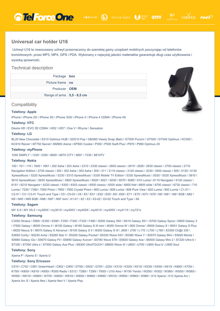 Universal car holder U16 Uchwyt U16 to nowoczesny uchwyt przeznaczony do szerokiej gamy urządzeń mobilnych poczynając od telefonów komórkowych, przez MP3, MP4, GPS i PDA. Wykonany z najwyżej jakości materiałów gwarantuje długi czas użytkowania i wysoką sprawność. Technical description Package box Picture frame no Producer OEM Range of arms 5,5 - 8,5 cm Compatibility Telefony: Apple iPhone \ iPhone 2G \ iPhone 3G \ iPhone 3GS \ iPhone 4 \ iPhone 4 CDMA \ iPhone 4S Telefony: HTC Desire HD \ EVO 3D CDMA \ HD2 \ HD7 \ One V \ Rhyme \ Sensation Telefony: LG BL20 New Chocolate \ E510 Optimus HUB \ GD510 Pop \ GM360 Viewty Snap (Bali) \ GT500 Puccini \ GT505 \ GT540 Optimus \ KC550 \ KC910 Renoir \ KF750 Secret \ KM900 Arena \ KP500 Cookie \ P350 \ P500 Swift Plus \ P970 \ P990 Optimus 2X Telefony: myPhone 1050 SIMPLY \ 1230 \ 3350 \ 6650 \ 6670 CITY \ 6691 \ 7230 \ 8810TV Telefony: Nokia 100 \ 101 \ 110 \ 1600 \ 1661 \ 202 Asha \ 203 Asha \ 2310 \ 2330 classic \ 2600 classic \ 2610 \ 2626 \ 2630 classic \ 2700 classic \ 2710 Navigation Edition \ 2730 classic \ 302 \ 302 Asha \ 303 Asha \ 305 \ 311 \ 3110 classic \ 3120 classic \ 3230 \ 3500 classic \ 500 \ 5130 \ 5130 XpressMusic \ 5220 XpressMusic \ 5230 \ 5310 XpressMusic \ 5330 Mobile TV Edition \ 5330 XpressMusic \ 5530 \ 5530 XpressMusic \ 5610 \ 5610 XpressMusic \ 5630 XpressMusic \ 5800 XpressMusic \ 6020 \ 6021 \ 6030 \ 6070 \ 6080 \ 610 Lumia \ 6110 Navigator \ 6120 classic \ 6151 \ 6210 Navigator \ 6220 classic \ 6300 \ 6303 classic \ 6500 classic \ 6500 slide \ 6600 fold \ 6600 slide \ 6700 classic \ 6730 classic \ 710 Lumia \ 7230 \ 7360 \ 7500 Prism \ 7900 \ 7900 Crystal Prism \ 800 Lumia \ 808 Lumia \ 808 Pure View \ 820 Lumia \ 900 Lumia \ C1-01 \ C2-01 \ C3 \ C3-01 Touch and Type \ C5 \ C5-03 \ C6 \ E5 \ E51 \ E52 \ E55 \ E6 \ E65 \ E71 \ E75 \ N73 \ N78 \ N8 \ N81 \ N81 8GB \ N82 \ N9 \ N95 \ N95 8GB \ N96 \ N97 \ N97 mini \ X1-01 \ X2 \ X3 \ X3-02 \ X3-02 Touch and Type \ X6 Telefony: Sagem MY X-5 \ MY X5-2 \ my300X \ my301X \ my400V \ my400X \ my401X \ my405X \ my411X \ my721x Telefony: Samsung C3050 Stratus \ D900 \ E250 \ E590 \ F250 \ F300 \ F330 \ F480 \ I5500 Galaxy 550 \ I5510 Galaxy 551 \ I5700 Galaxy Spica \ I5800 Galaxy 3 \ I7500 Galaxy \ I8000 Omnia II \ I8150 Galaxy \ i8190 Galaxy S III mini \ i8350 Omnia W \ i900 Omnia \ I9000 Galaxy S \ I9001 Galaxy S Plus \ i9020 Nexus S \ I9070 Galaxy S Advance \ I9100 Galaxy S II \ I9300 Galaxy S III \ J600 \ J700 \ L170 \ L700 \ L760 \ S3350 Ch@t 335 \ S3650 Corby \ S5230 Avila \ S5260 Star II \ S5300 Galaxy Pocket \ S5330 Wave 533 \ S5380 Wave Y \ S5570 Galaxy Mini \ S5620 Monte \ S5660 Galaxy Gio \ S5670 Galaxy Fit \ S5690 Galaxy Xcover \ S5780 Wave 578 \ S5830 Galaxy Ace \ S6500 Galaxy Mini 2 \ S7220 Ultra b \ S7330 \ S7350 Ultra s \ S7500 Galaxy Ace Plus \ S8300 UltraTOUCH \ S8600 Wave III \ U600 \ U700 \ U800 Soul b \ U900 Soul Telefony: Sony Xperia P \ Xperia S \ Xperia U Telefony: Sony Ericsson C510 \ C702 \ C901 GreenHeart \ C902 \ C905 \ D750i \ G502 \ G705 \ J220i \ K310i \ K320i \ K510i \ K530i \ K550i \ K610i \ K660i \ K700i \ K750i \ K800i \ K810i \ K850i \ R300 Radio \ S312 \ T280i \ T290i \ T650i \ U10i Aino \ W150 Yendo \ W200i \ W302 \ W380i \ W550i \ W580i \ W595i \ W610i \ W660i \ W705 \ W800i \ W810i \ W850i \ W880i \ W890i \ W910i \ W950i \ W960i \ W980 \ X10 Xperia \ X12 Xperia Arc \ Xperia Arc S \ Xperia Neo \ Xperia Neo V \ Xperia Play