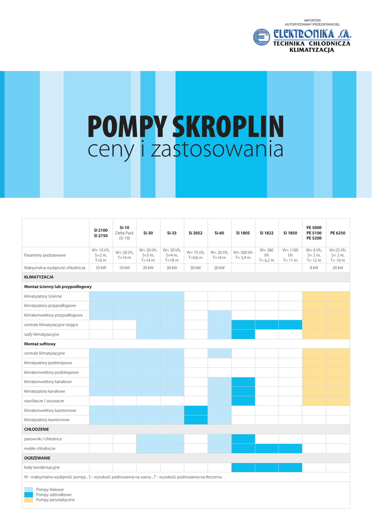 IMPORTER AUTORYZOWANY PRZEDSTAWICIEL POMPY SKROPLIN ceny i zastosowania Parametry podstawowe Maksymalna wydajność chłodnicza SI 2100 SI 2750 Si‐10 Delta Pack (Si‐10) Si-30 Si-33 Si 2052 Si-60 SI 1805 SI 1822 SI 1850 PE 5000 PE 5100 PE 5200 PE 6250 W= 10 l/h, S=2 m, T=6 m W= 20 l/h, T=14 m W= 20 l/h, S=3 m, T=14 m W= 30 l/h, S=4 m, T=18 m W= 75 l/h, T=0,6 m W= 20 l/h, T=14 m W= 500 l/h T= 5,4 m W= 380 l/h T= 6,2 m W= 1100 l/h T= 11 m W= 6 l/h, S= 2 m, T= 12 m W=25 l/h, S= 2 m, T= 10 m 10 kW 10 kW 20 kW 30 kW 30 kW 20 kW 8 kW 20 kW KLIMATYZACJA Montaż ścienny lub przypodłogowy klimatyzatory ścienne klimatyzatory przypodłogowe klimakonwektory przypodłogowe centrale klimatyzacyjne stojące szafy klimatyzacyjne Montaż sufitowy centrale klimatyzacyjne klimatyzatory podstropowe klimakonwektory podstropowe klimakonwektory kanałowe klimatyzatory kanałowe nawilżacze / osuszacze klimakonwektory kasetonowe klimatyzatory kasetonowe CHŁODZENIE parowniki / chłodnice meble chłodnicze OGRZEWANIE kotły kondensacyjne W ‐ maksymalna wydajność pompy , S ‐ wysokość podnoszenia na ssaniu , T ‐ wysokość podnoszenia na tłoczeniu Pompy tłokowe Pompy odśrodkowe Pompy perystaltyczne 1 Pompki skroplin monoblokowe Wydajność max. [ l / h ] Wys. podnoszenia max. ssanie / tłoczenie [m] Zbiornik [ l ] Cena netto [EURO] Si – 10 univers 20 - / 10,0 - 85 DELTA PACK (zestaw z pompką Si -10 univers) 20 - / 10,0 - 110 SI 2052 (klimat. kasetonowe) 70 - / 0,7 - 72 Model Wydajność max. [ l / h ] Wys. podnoszenia max. ssanie / tłoczenie [m] Zbiornik [ l ] Cena netto [EURO] SI 2100 10 1,5 / 6,0 - 55 SI 2750 10 2,0 / 6,0 - 66 Si - 20 20 3,0 / 10,0 - 110 Omega Pack (zestaw z pompką Si-20) 20 3,0 / 10,0 - 110 Si – 30 20 3,0 / 10,0 - 110 Si – 33 30 4,0 / 18,0 - 125 SI 3100 10 2,0 / 6,0 - 103 Model pompki skroplin Pompki skroplin split Karty katalogowe, zdjęcia, katalogi pomp skroplin - znaleźć można w zakładce „Akcesoria”, na stronie internetowej www.mhi.info.pl 2 Gdynia tel. 58 66 33 300 [email protected]; Katowice tel. 32 609 87 00 [email protected]; Łódź tel. 42 689 26 66 [email protected]; Poznań tel. 61 639 76 00 [email protected]; Szczecin tel. 91 431 34 34 [email protected]; Tarnów tel. 14 6 277 377 [email protected]; Warszawa tel. 22 644 18 81 [email protected]; Wrocław tel. 71 338 00 10 [email protected]; www.elektronika-sa.com.pl, www.mhi.info.pl Importer Autoryzowany Przedstawiciel Pompki skroplin zbiornikowe Wydajność max. [ l / h ] Wys. podnoszenia max. ssanie / tłoczenie [m] Zbiornik [ l ] Cena netto [EURO] Si – 60 20 - / 10,0 0,37 130 Si – 61 (pompka do pieców kondensacyjnych) 10 - / 8,0 0,37 125 SI 1805 500 - / 5,0 0,5 70 Si - 82 500 - / 5,0 2,0 80 SI 1822 380 - / 5,8 3,8 130 SI 1850 1100 - / 10,0 3,8 438 Si – 93 (pompka membranowa) 360 - / 20,0 4,0 530 Wydajność max. [ l / h ] Wys. podnoszenia max. ssanie / tłoczenie [m] Zbiornik [ l ] Cena netto [EURO] PE 5000 6 2,0 / 12,0 - 125 PE 5100 6 2,0 / 12,0 - 155 PE 5200 6 2,0 / 12,0 - 150 PE 6250 25 2,0 / 10,0 - 345 pompki skroplin Model Pompki perystaltyczne Model Karty katalogowe, zdjęcia, katalogi pomp skroplin - znaleźć można w zakładce „Akcesoria”, na stronie internetowej www.mhi.info.pl Importer Autoryzowany Przedstawiciel Gdynia tel. 58 66 33 300 [email protected]; Katowice tel. 32 609 87 00 [email protected]; Łódź tel. 42 689 26 66 [email protected]; Poznań tel. 61 639 76 00 [email protected]; Szczecin tel. 91 431 34 34 [email protected]; Tarnów tel. 14 6 277 377 [email protected]; Warszawa tel. 22 644 18 81 [email protected]; Wrocław tel. 71 338 00 10 [email protected]; www.elektronika-sa.com.pl, www.mhi.info.pl 3 Akcesoria do pompek skroplin Cena netto [EURO] Nazwa SI 2958 czujnik pływakowy do pompek typu split ACC 00100 zestaw instalacyjny do pompek SI 2100 -2750 ACC 00105 przewód odprowadzenia skroplin 6 mm, 5mb ACC 00106 przewód odprowadzenia skroplin 15 mm ; 0,5 mb ACC 00125 przewód odprowadzenia skroplin 10 mm, 25 mb ACC 00151 przewód odprowadzenia skroplin 6 mm, wzmocniony 50 mb ACC 00201 złączka 17/22 mm ACC 00202 złączka 17/32 mm ACC 00204 komplet złączek 6 mm: nypel (5szt.) , kolano (5szt.) ACC 00205 złączka uszczelniająca / redukcja 10 / 6 mm (6 szt.) ACC 00207 komplet złączek 6 mm: nypel (10szt.) ACC 00209 złączka elast. mimośrodowa odpr. skroplin 15 mm ACC 00210 kolano redukcyjne 90' 17/15 mm ACC 00211 komplet złączek 6 mm: trójnik (5szt.) ACC 00213 komplet złączek 10 mm: nypel (5szt.) 11 ACC 00225 złącze redukcyjne D=25 mm do pompek zbiornikowych Sauermann 5 ACC 00230 złącze redukcyjne D=30 mm do pompek zbiornikowych Sauermann 5 ACC 00240 złącze redukcyjne D=40 mm do pompek zbiornikowych Sauermann ACC 00304 zestaw antywibracyjny do pompek SI 2100 - 2750 ACC 00703 przewód sterowania pompą 3 m do pompek typu split ACC 00705 przewód sterowania pompą 5 m do pompek typu split ACC 00801 zawór zwrotny 10 mm do pompki SI 1805-1820 ACC 00805 zawór zwrotny 6 mm do pompki typu split (5 szt.) PE 5002 przewód do pompki PE 5000-5200 PE 5003 redukcja 17 / 6 mm 5 47 21 6 6 40 75 7 15 27 14 5 5 10 11 9 17 21 5 22 14 5 IMPORTER AUTORYZOWANY PRZEDSTAWICIEL Gdynia ul. Hutnicza 3 81-212 Gdynia tel. 58 66 33 300 fax 58 66 30 140 [email protected] Katowice ul. Ks. Bednorza 2a-6 40-384 Katowice tel. 32 609 87 00 fax 32 609 87 01 [email protected] Łódź ul. Senatorska 31 93-192 Łódź tel. 42 689 26 66 fax 42 689 26 62 [email protected] Poznań ul. Św. Michała 43 61-119 Poznań tel. 61 650 33 44 fax 61 650 36 44 [email protected] Szczecin ul. Bagienna 38c 70-772 Szczecin tel. 91 431 34 34 fax 91 431 34 30 [email protected] Tarnów ul. Przemysłowa 27 a 33-100 Tarnów tel. 14 6 277 377 fax 14 6 277 440 [email protected] Warszawa ul. Puławska 538 02-884 Warszawa tel. 22 644 18 81 fax 22 644 26 13 [email protected] Wrocław ul. Cesarzowicka 5 52-408 Wrocław tel. 71 338 00 10 fax 71 338 00 23 [email protected] www.elektronika-sa.com.pl 4 www.mhi.