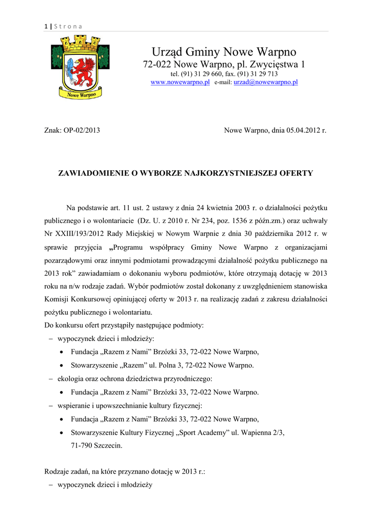 GMINA NOWE WARPNO pl. Zwycięstwa 1 72