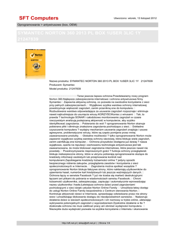 SFT Computers Utworzono: wtorek, 13 listopad 2012 Oprogramowanie > antywirusowe (box, OEM) SYMANTEC NORTON 360 2013 PL BOX 1USER 3LIC 1Y 21247839 Nazwa produktu: SYMANTEC NORTON 360 2013 PL BOX 1USER 3LIC 1Y 21247839 Producent: Symantec Model produktu: 21247839 Teraz jeszcze lepsza ochrona.Przedstawiamy nowy program Norton 360.Najlepsze zabezpieczenia internetowe i ochrona antywirusowa firmy Symantec Zapewnia aktywną ochronę, co pozwala na swobodne korzystanie z sieci przy pełnych zabezpieczeniach. Wyjątkowo szybka warstwa ochrony internetowej powstrzymuje większość zagrożeń, zanim przenikną one do komputera. Rozbudowana warstwa odpowiadająca za usuwanie zagrożeń rozpoznaje i eliminuje nawet najtrudniejsze do usunięcia wirusy.KORZYŚCIKoniec z wirusami Tak, to prawda ? technologia SONAR i całodobowe monitorowanie zagrożeń w czasie rzeczywistym analizują podejrzaną aktywność w komputerze, aby szybko identyfikować zagrożenia. Pobieranie do woli ? oprogramowanie Norton skanuje pobierane pliki i eliminuje znalezione zagrożenia pochodzące z sieci. Dokładne czyszczenie komputera ? wydajny mechanizm usuwania zagrożeń znajduje i usuwa agresywne, problematyczne wirusy, które są często pomijane przez mniej zaawansowane produkty. Globalne możliwości ? tylko oprogramowanie Norton może zapewnić wyjątkowo szybką warstwę ochrony sieciowej, która blokuje wiele zagrożeń, zanim zainfekują one komputer. Ochrona przyszłości dostępna już dzisiaj ? nasza wyjątkowa, oparta na reputacji i zachowaniu technologia antywirusowa jest tak zaawansowana, że może blokować zagrożenia internetowe, które jeszcze nawet nie powstały. Powstrzymywanie nieproszonych gości ? funkcja ochrony przeglądarek blokuje niebezpieczne strony, które w ukryciu pobierają oprogramowanie służące do kradzieży informacji osobistych lub przejmowania kontroli nad komputerami.Zapobieganie kradzieży tożsamości online ? jedyny sposób bezpiecznego robienia zakupów, przeglądania zasobów i korzystania z sieci społecznościowych w Internecie. Zagrożenia można spotkać wszędzie ? oprogramowanie Norton blokuje fałszywe strony, które nakłaniają użytkowników do ujawnienia haseł, numerów kart kredytowych lub jeszcze ważniejszych danych. Ochrona łączy w serwisie Facebook ? już nie trzeba się martwić destrukcyjnymi łączami ani plikami do pobrania w wiadomościach serwisu Facebook. Chroni tożsamość użytkownika, zabezpieczając, zapisując i automatycznie wprowadzając nazwy użytkownika i hasła.Łatwiejsza ochrona dzieci przed zagrożeniami pochodzącymi z sieci dzięki usłudze Norton Online Family Umożliwia łatwy dostęp do usługi Norton Online Family bezpośrednio z Centrum sterowania Norton. Kontroluje aktywność dzieci w Internecie, sprawdzając odwiedzane przez nie strony www i umożliwiając blokowanie dostępu do nieodpowiednich serwisów. Nadzoruje działania dzieci w sieciach społecznościowych i ich rozmowy w trybie online, ułatwiając wykrywanie potencjalnych zagrożeń z wyprzedzeniem.Dyskretne działanie w tle ? doskonała ochrona nie musi zakłócać pracy ani obniżać wydajności komputera. Niezwykle duża wydajność pozwala na szybkie korzystanie z Internetu i skanowanie http://sft.net.pl | [email protected] | | Strona 1/4 SFT Computers Utworzono: wtorek, 13 listopad 2012 Oprogramowanie > antywirusowe (box, OEM) SYMANTEC NORTON 360 2013 PL BOX 1USER 3LIC 1Y 21247839 plików. Dzięki inteligentnym funkcjom wykrywania oraz dyskretnemu działaniu w tle oprogramowanie blokuje zagrożenia bez wyświetlania wielu wyskakujących ostrzeżeń i ponownego uruchamiania komputera. Dzięki inteligentnemu działaniu operacje skanowania i aktualizacje są przeprowadzane tylko wtedy, gdy użytkownik nie korzysta z komputera, i nie wymagają ponownego uruchamiania systemu.Technologia chmury jest obecnie bardzo popularnym tematem. Nowe usługi Norton Management oparte na chmurze ułatwiają utrzymanie pełnej kontroli Usługi te umożliwiają naprawę, aktualizację, odnawianie subskrypcji lub instalowanie pakietu Norton Internet Security w dodatkowych komputerach bez klucza produktu lub instalacyjnego dysku CD. Usługi działają w każdym miejscu sieci i można je obsługiwać za pomocą kilku kliknięć.Wypadki się zdarzają. Dyski twarde ulegają awarii. Istnieje też ryzyko oblania komputera kawą. Warto zatem regularnie tworzyć kopie zapasowe. Automatyczne kopie zapasowe pozwalają na wykonywanie kopii zapasowych zdjęć, muzyki oraz innych ważnych plików na dyskach twardych, w urządzeniach USB lub online w zabezpieczonych centrach danych firmy Symantec. Funkcja ta chroni kopie zapasowe plików online za pomocą mechanizmów szyfrowania stosowanych przez urzędy państwowe. Szybkie rozpoczęcie pracy ? oprogramowanie Norton pozwala na przywracanie plików z kopii zapasowych za pomocą kilku kliknięć.Komputer potrzebuje przyspieszenia? Wyjątkowa funkcja czyszczenia i optymalizacji wydajności zapewnia sprawne, bezproblemowe działanie systemu. Rozwiązuje typowe problemy, które mogą obniżać wydajność komputera lub powodować jego awarie. Eliminuje zbędne pliki i optymalizuje wydajność dysku twardego. Zwalnia zasoby pamięci systemowej.FUNKCJE Najlepsze rozwiązanie zabezpieczające firmy Symantec ? zawiera wszystkie składniki, w tym programy Norton AntiVirus i Norton Internet Security oraz 2 GB bezpiecznego miejsca na kopie zapasowe online.TYLKO W PROGRAMACH NORTON Norton Protection System ? pięć opatentowanych warstw ochrony wykrywa i eliminuje prawie wszystkie zagrożenia szybciej i bardziej precyzyjnie niż inne technologie. Warstwy ochrony sieciowej ? powstrzymuje zagrożenia pochodzące z Internetu, zanim przenikną one do komputera.ULEPSZENIE Oparta na analizie zachowań technologia SONAR oraz nieprzerwane, całodobowe monitorowanie zagrożeń ? śledzą podejrzane działania w komputerze, dzięki czemu pozwalają skutecznie przewidy