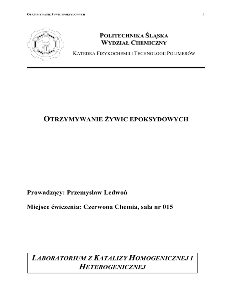 1 OTRZYMYWANIE ŻYWIC EPOKSYDOWYCH POLITECHNIKA ŚLĄSKA WYDZIAŁ CHEMICZNY KATEDRA FIZYKOCHEMII I TECHNOLOGII POLIMERÓW OTRZYMYWANIE ŻYWIC EPOKSYDOWYCH Prowadzący: Przemysław Ledwoń Miejsce ćwiczenia: Czerwona Chemia, sala nr 015 LABORATORIUM Z KATALIZY HOMOGENICZNEJ I HETEROGENICZNEJ 2 OTRZYMYWANIE ŻYWIC EPOKSYDOWYCH I. CEL ĆWICZENIA Celem ćwiczenia jest zapoznanie się z procesem otrzymywania żywic epoksydowych. Jednocześnie, ćwiczenie ma na celu zapoznanie się z rolą katalizatora na przebieg reakcji. II. WSTĘP TEORETYCZNY Pierścień epoksydowy jest to silnie naprężony trójczłonowy pierścień heterocykliczny, składający się z atomu tlenu i dwóch atomów węgla. Taka budowa powoduje, że łatwo ulega różnym reakcjom chemicznym. Żywice epoksydowe są to związki zawierające w swojej budowie co najmniej dwie grupy epoksydowe. Mają stosunkowo niewielki ciężar cząsteczkowy, nie przekraczający 4000. Zazwyczaj są to ciecze lub łatwo topliwe ciała stałe. W obecności utwardzacza i katalizatora przechodzą w stan nietopliwy i nierozpuszczalny. Substratami najczęściej wykorzystywanymi do syntezy tego typu polimerów są epichlorohydryna i di lub wielowodorotlenowe fenole. Tworzenie liniowych żywic epoksydowych obejmuje reakcje addycji grup wodorotlenowych dianu z grupą epoksydową epichlorohydryny, odszczepienie się chlorowodoru i tworzenie się nowej grupy epoksydowej, dalsze reakcje addycji i kondensacji z tworzeniem się liniowych żywic epoksydowych. W pierwszym etapie ogrzewa się ich mieszaninę w obecności NaOH. W reakcji addycji NaOH działa jak katalizator, a w reakcji dehydrohalogenacji reaguje stechiometrycznie. W zależności od stosunku stechiometrycznego substratów otrzymuje się różne produkty. Przykładowa reakcja epichlorohydryny z bisfenolem A: HO OH HO + O OH Cl O Cl Cl HO O OH + NaOH HO + NaCl + O O NaOH OH O O O O O n O H2O OTRZYMYWANIE ŻYWIC EPOKSYDOWYCH 3 Żywice epoksydowe sieciują w wyniku reakcji grup epoksydowych ze środkiem sieciującym. Do utwardzania żywic epoksydowych najczęściej wykorzystywane są aminy pierwszo- i drugorzędowe oraz bezwodniki kwasów organicznych. III. WYKONANIE ĆWICZENIA Aparatura: Kolba trójszyjna (250 ml), chłodnica powietrzna, termometr, mieszadło, wkraplacz. Odczynniki: Ćwiczenie 1: - Żywica epoksydowa , - Epidian 5, - Dian techniczny, - Trietanoloamina Ćwiczenie 2: - Dian techniczny - Epichlorohydryna, - Wodorotlenek sodu, - Kwas octowy. Oznaczenie liczby epoksydowej: - HCl w dioksanie - Fenoloftaleina - Wodorotlenek potasu Pomiary: Ćwiczenie 1: Do kolby trójszyjnej o poj. 250 ml zaopatrzonej w termometr, mieszadło, chłodnicę powietrzną (50 cm) wprowadzić odważony dian i żywicę epoksydową Epidian 5 oraz katalizator trietanoloaminę. Zawartość kolby ogrzać do temperatury 150 °C. Oznaczać liczbę epoksydową w odstępach 1 godzinnych. Reakcję uważa się za zakończoną gdy liczba epoksydowa osiągnie założoną wartość. Po reakcji gorącą żywicę wylać na metalową tacę. Ćwiczenie 2: Do kolby trójszyjnej o poj. 250 ml zaopatrzonej w termometr, mieszadło, wprowadzić dian techniczny oraz epichlorohydrynę. Po uruchomieniu mieszadła substraty ogrzać do temperatury 40 °C, po czym rozpocząć wkraplanie 10 % wodnego r-ru NaOH. Wkraplanie prowadzić przez 40 min. zwiększając stopniowo temperaturę do 80 °C (reakcja przebiega egzotermicznie). Następnie temperaturę podnieść do 95 °C i prowadzić dalszą kondensację przez 2 godziny. Żywica zaczyna się wytrącać po 30 - 40 min. kondensacji. Początkowo jest ona płynna, pod koniec reakcji staje się gęsta, ciastowata. Po zakończeniu kondensacji odciągnąć górną, wodną OTRZYMYWANIE ŻYWIC EPOKSYDOWYCH 4 warstwę ługów poreakcyjnych. Surową żywicę przemyć porcjami czystej, wrzącej wody. Do pierwszej porcji wody dodać kilka ml kwasu octowego w celu zobojętnienia nadmiaru NaOH. Z kolby wyciągnąć stałą żywicę. Zbadać liczbę epoksydową. Oznaczenie liczby epoksydowej: Do kolby stożkowej o pojemności 100 ml naważa się na wadze analitycznej 0.1 – 0.5 g badanej substancji i dodaje 25 ml odczynnika do oznaczenia LE (16 ml st. HCl w 1 l dioksanu). Po 1 godzinie miareczkuje się zawartość roztworem 0,2 molowym KOH w alkoholu etylowym względem czerwieni krezolowej lub fenoloftaleiny. Jednocześnie wykonuje się ślepą próbę. IV. Obliczenia Ćwiczenie 1: Obliczyć skład surowcowy zakładając, że: 1. Należy otrzymać 100 g żywicy epoksydowej twardej, straty wynoszą 5 %. 2. Liczba epoksydowa żywicy Epidiam 5 wynosi 0,48. 3. Należy otrzymać żywicę epoksydową twardą o liczbie epoksydowej 0,12. 4. Dodatek katalizatora trietanoloaminy wynosi 0,3 % wag. licząc na wsad. Ćwiczenie 2: Obliczyć skład surowcowy zakładając, że: 1. Należy otrzymać 100 g żywicy epoksydowej twardej, straty wynoszą 5 %. 2. Stosunek molowy dian/epichlorohydryna / NaOH wynosi 1 / 1,2 / 1,6 Oznaczenie liczby epoksydowej: Liczba epoksydowa (LE) jest to ilość grup epoksydowych zawarta w 100 g próbki. LE obliczana jest ze wzoru: gdzie: V – różnica objętości KOH w ślepej i właściwej próbie n – normalność roztworu KOH f – faktor m – naważka V. PYTANIA KONTROLNE 1. Wymienić surowce stosowane do otrzymywania żywic epoksydowych. 2. Opisać mechanizm reakcji dianu z epichlorohydryną ze szczególnym uwzględnieniem roli katalizatora. 3. Wymienić rodzaje utwardzaczy żywic epoksydowych, omówić ich wpływ na reakcję sieciowania, podać przykłady. OTRZYMYWANIE ŻYWIC EPOKSYDOWYCH 5 VI. LITERATURA 1. Praca zbiorowa pod redakcją Z. Floriańczyka i S. Penczka, Chemia Polimerów, tom I, Oficyna Wydawnicza Politechniki Warszawskiej, Warszawa 1997. 2. Praca zbiorowa pod redakcją Z. Floriańczyka i S. Penczka, Chemia Polimerów, tom II, Oficyna Wydawnicza Politechniki Warszawskiej, Warszawa 1997. 3. W. Szlezyngier, Tworzywa Sztuczne, tom I, Oficyna Wydawnicza Politechniki Rzes