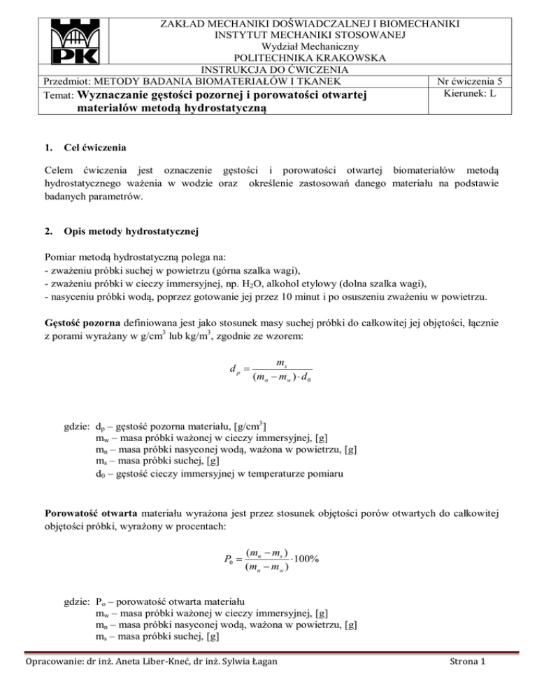 ZAKŁAD MECHANIKI DOŚWIADCZALNEJ I BIOMECHANIKI INSTYTUT MECHANIKI STOSOWANEJ Wydział Mechaniczny POLITECHNIKA KRAKOWSKA INSTRUKCJA DO ĆWICZENIA Przedmiot: METODY BADANIA BIOMATERIAŁÓW I TKANEK Nr ćwiczenia 5 Kierunek: L Temat: Wyznaczanie gęstości pozornej i porowatości otwartej materiałów metodą hydrostatyczną 1. Cel ćwiczenia Celem ćwiczenia jest oznaczenie gęstości i porowatości otwartej biomateriałów metodą hydrostatycznego ważenia w wodzie oraz określenie zastosowań danego materiału na podstawie badanych parametrów. 2. Opis metody hydrostatycznej Pomiar metodą hydrostatyczną polega na: - zważeniu próbki suchej w powietrzu (górna szalka wagi), - zważeniu próbki w cieczy immersyjnej, np. H2O, alkohol etylowy (dolna szalka wagi), - nasyceniu próbki wodą, poprzez gotowanie jej przez 10 minut i po osuszeniu zważeniu w powietrzu. Gęstość pozorna definiowana jest jako stosunek masy suchej próbki do całkowitej jej objętości, łącznie z porami wyrażany w g/cm3 lub kg/m3, zgodnie ze wzorem: dp ms ( mn mw ) d 0 gdzie: dp – gęstość pozorna materiału, [g/cm3] mw – masa próbki ważonej w cieczy immersyjnej, [g] mn – masa próbki nasyconej wodą, ważona w powietrzu, [g] ms – masa próbki suchej, [g] d0 – gęstość cieczy immersyjnej w temperaturze pomiaru Porowatość otwarta materiału wyrażona jest przez stosunek objętości porów otwartych do całkowitej objętości próbki, wyrażony w procentach: P0 (mn ms ) 100% ( mn mw ) gdzie: Po – porowatość otwarta materiału mw – masa próbki ważonej w cieczy immersyjnej, [g] mn – masa próbki nasyconej wodą, ważona w powietrzu, [g] ms – masa próbki suchej, [g] Opracowanie: dr inż. Aneta Liber-Kneć, dr inż. Sylwia Łagan Strona 1 3. Wykonanie ćwiczenia zamontować na wadze zestaw do pomiarów metodą hydrostatyczną, napełnić zlewkę cieczą immersyjną, wprowadzić odpowiednie parametry na wadze, badaną próbkę ważyć dwukrotnie: raz w powietrzu na „górnej” szalce, drugi raz w cieczy wzorcowej, na „dolnej” szalce, nasycić próbkę wodą poprzez gotowanie jej przez 10 minut i ponownie zważyć, kolejno zapisywać wyniki w tabeli. Rys.1. Widok stanowiska. Rys. 1. Budowa urządzenia do wyznaczania gęstości: 1 – szalka zestawu, 2 – zlewka, 3 – termometr, 4 – podstawka zlewki, 6 – ramka szalki 7 – miejsce do umieszczenia badanej próbki Opracowanie: dr inż. Aneta Liber-Kneć, dr inż. Sylwia Łagan Strona 2 4. Opracowanie sprawozdania Sprawozdanie powinno zawierać następujące składowe: a) Cel ćwiczenia b) Zestawienie wyników: Nazwa badanego materiału c) ms [g] mw [g] mn [g] Porowatość otwarta [%] Gęstość pozorna [g/cm3] Wnioski Analiza wyników i porównanie otrzymanych wartości parametrów badanych materiałów. Opisanie wpływu tych parametrów na potencjalne zastosowania materiałów w biomedycynie. Opracowanie: dr inż. Aneta Liber-Kneć, dr inż. Sylwia Łagan Strona 3