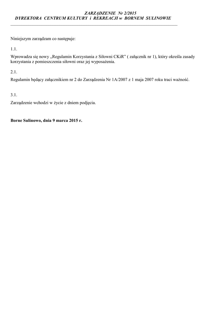 ZARZĄDZENIE Nr 2/2015 DYREKTORA CENTRUM KULTURY i REKREACJI w BORNEM SULINOWIE ___________________________________________________________________________ Niniejszym zarządzam co następuje: 1.1. Wprowadza się nowy „Regulamin Korzystania z Siłowni CKiR” ( załącznik nr 1), który określa zasady korzystania z pomieszczenia siłowni oraz jej wyposażenia. 2.1. Regulamin będący załącznikiem nr 2 do Zarządzenia Nr 1A/2007 z 1 maja 2007 roku traci ważność. 3.1. Zarządzenie wchodzi w życie z dniem podjęcia. Borne Sulinowo, dnia 9 marca 2015 r. Załącznik nr 1 REGULAMIN korzystania z siłowni Centrum Kultury i Rekreacji w Bornem Sulinowie 1. Regulamin niniejszy reguluje zasady korzystania z pomieszczeń oraz urządzeń siłowni Centrum Kultury i Rekreacji w Bornem Sulinowie. 2. Zasady określone w niniejszym Regulaminie stanowią uzupełnienie zasad korzystania z obiektów Hali Widowiskowo-Sportowej CKiR, określonych w regulaminie ogólnym Centrum Kultury i Rekreacji w Bornem Sulinowie. 3. Siłownia udostępniana jest klientom: Od poniedziałku do piątku – w godz. 08.00 do 21.00, W soboty – w godz. 11.00-17.00 *, Każdorazowo wg zapotrzebowania do godz. 19.00 dopuszcza się rezerwacje dla grup zorganizowanych. 4. Regulamin niniejszy dotyczy wszystkich użytkowników siłowni: klientów indywidualnych, grup zorganizowanych, osób dorosłych oraz dzieci i młodzieży szkolnej. 5. Nieprzestrzeganie zasad określonych w Regulaminie uprawnia CKiR do nakazania osobom naruszającym porządek i bezpieczeństwo opuszczenia obiektu siłowni, bez prawa zwrotu uiszczonej opłaty. 6. Osoby notorycznie naruszające postanowienia niniejszego Regulaminu będą miały zakaz wstępu na obiekt. 7. Korzystanie z urządzeń siłowni winno odbywać się pod nadzorem uprawnionego instruktora lub przynajmniej w asyście innej pełnoletniej osoby. 8. Osoby, które nie ukończyły 16 lat mogą korzystać z urządzeń siłowni pod nadzorem rodziców lub opiekunów prawnych, nauczycieli, instruktorów lub trenerów. 9. Korzystanie z poszczególnych urządzeń siłowni musi być zgodne z ich przeznaczeniem oraz funkcją. Instrukcje użytkowania znajdują się przy każdym z urządzeń. 10. Z jednego stanowiska siłowni w tym samym czasie może korzystać tylko jedna osoba. Na terenie sali siłowni może jednocześnie przebywać do 24 osób. 11. Każdą nieprawidłowość w funkcjonowaniu urządzenia należy niezwłocznie zgłosić pracownikom CKiR. Użytkowanie wadliwie funkcjonującego urządzenia siłowni jest zabronione. 12. Korzystanie z urządzeń siłowni odbywa się na wyłączne ryzyko ćwiczącego. 13. Korzystając z urządzeń, zwłaszcza do podnoszenia ciężarów, ćwiczący powinien dostosowywać intensywności ćwiczeń i związane z tym obciążenie organizmu do swoich umiejętności oraz wieku. Podnoszenie dużych ciężarów powinno odbywać się w obecności dwóch asekurujących. 14. CKiR nie ponosi odpowiedzialności za skutki zdrowotne spowodowane: doborem przez ćwiczącego urządzenia siłowni, intensywnością wykonywanych ćwiczeń oraz użytkowaniem urządzeń niezgodnie z ich przeznaczeniem. 15. Wejście na salę siłowni dopuszczalne jest tylko w stroju sportowym oraz zmiennym obuwiu sportowym. 16. Zabrania się przesuwania, podnoszenia lub innego przemieszczania urządzeń siłowni. Okna pomieszczenia siłowni nie mogą być otwierane przez ćwiczących. 17. Na teren sali siłowni można wnosić napoje bezalkoholowe wyłącznie w plastikowych butelkach. Na terenie całego obiektu Hali Sportowo-Widowiskowej istnieje zakaz palenia tytoniu. * godziny udostępniania siłowni będą inne niż podane w przypadku odbywających się imprez na terenie Hali WidowiskowoSportowej. Borne Sulinowo, dnia 9 marca 2015 r.