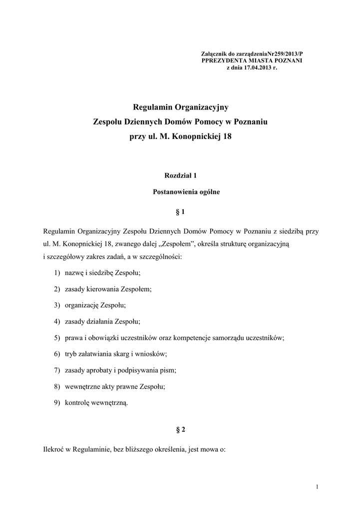 Załącznik do zarządzeniaNr259/2013/P PPREZYDENTA MIASTA POZNANI z dnia 17.04.2013 r. Regulamin Organizacyjny Zespołu Dziennych Domów Pomocy w Poznaniu przy ul. M. Konopnickiej 18 Rozdział 1 Postanowienia ogólne §1 Regulamin Organizacyjny Zespołu Dziennych Domów Pomocy w Poznaniu z siedzibą przy ul. M. Konopnickiej 18, zwanego dalej „Zespołem”, określa strukturę organizacyjną i szczegółowy zakres zadań, a w szczególności: 1) nazwę i siedzibę Zespołu; 2) zasady kierowania Zespołem; 3) organizację Zespołu; 4) zasady działania Zespołu; 5) prawa i obowiązki uczestników oraz kompetencje samorządu uczestników; 6) tryb załatwiania skarg i wniosków; 7) zasady aprobaty i podpisywania pism; 8) wewnętrzne akty prawne Zespołu; 9) kontrolę wewnętrzną. §2 Ilekroć w Regulaminie, bez bliższego określenia, jest mowa o: 1 1) Mieście - należy przez to rozumieć Miasto Poznań, będące gminą w rozumieniu ustawy o samorządzie gminnym oraz miastem na prawach powiatu w rozumieniu ustawy o samorządzie powiatowym; 2) Zespole - należy przez to rozumieć Zespół Dziennych Domów Pomocy w Poznaniu z siedzibą przy ul. M. Konopnickiej 18; 3) Regulaminie - należy przez to rozumieć Regulamin Organizacyjny Zespołu Dziennych Domów Pomocy w Poznaniu z siedzibą przy ul. M. Konopnickiej 18. §3 1. Zespół nosi nazwę „Zespół Dziennych Domów Pomocy w Poznaniu przy ul. Marii Konopnickiej 18”. 2. Zespół jest miejską jednostką organizacyjną, działającą jako jednostka budżetowa Miasta. 3. Zespół ma siedzibę w Poznaniu przy ul. M. Konopnickiej 18. 4. W skład Zespołu wchodzi 5 Filii zwanych „Klubami”, którymi kierują kierownicy. 5. Zespół przeznaczony jest dla osób obojga płci, które z powodu choroby, niepełnosprawności lub wieku wymagają częściowej opieki i pomocy w zaspokajaniu niezbędnych potrzeb życiowych, a którym rodzina takiej pomocy nie może zapewnić. §4 Zespół prowadzi swoją działalność na podstawie: 1) ustawy z dnia 12 marca 2004 r. o pomocy społecznej (Dz. U. z 2009 r. Nr 175, poz. 1362 z późniejszymi zmianami); 2) ustawy z dnia 8 marca 1990 r. o samorządzie gminnym (Dz. U. z 2001 r. Nr 142, poz. 1591 z późniejszymi zmianami); 3) ustawy z dnia 21 listopada 2008 r. o pracownikach samorządowych (Dz. U. z 2008 r. Nr 223, poz. 1458 z późniejszymi zmianami); 4) ustawy z dnia 27 sierpnia 2009 r. o finansach publicznych (Dz. U. z 2009 r. Nr 157, poz. 1240 z późniejszymi zmianami); 5) ustawy z dnia 29 września 1994r. o rachunkowości (Dz. U. z 2009 r. Nr 152, poz. 1223 z późniejszymi zmianami); 6) ustawy z dnia 29 stycznia 2004 r. Prawo zamówień publicznych (Dz. U. z 2010 r. Nr 113, poz. 759 z późniejszymi zmianami); 2 7) ustawy z dnia 19 sierpnia 1994 r. o ochronie zdrowia psychicznego (Dz. U. z 2011 r. Nr 231, poz. 1375); 8) ustawy z dnia 24 kwietnia 2003r. o działalności pożytku publicznego i o wolontariacie (Dz. U. z 2010 r. Nr 234, poz. 1536 z późniejszymi zmianami); 9) ustawy z dnia 26 października 1982 r. o wychowaniu w trzeźwości i przeciwdziałaniu alkoholizmowi (Dz. U. z 2007 r. Nr 70, poz. 473 z późniejszymi zmianami); 10) Statutu Zespołu nadanego uchwałą Nr XXVIII/392/VI/2012 Rady Miasta Poznania z dnia 20 marca 2012 r.; 11) niniejszego Regulaminu. Rozdział 2 Zadania Zespołu §5 1. Do zakresu działania Zespołu należy wykonywanie zadania własnego gminy z zakresu pomocy społecznej. 2. Zespół jest ośrodkiem wsparcia w rozumieniu przepisów ustawy z dnia 12 marca 2004 r. o pomocy społecznej. 3. Zespół pracuje w systemie dziennym. Rozdział 3 Zasady kierowania Zespołem §6 1. Zespołem kieruje i reprezentuje go na zewnątrz dyrektor zatrudniony przez Prezydenta Miasta Poznania. 2. Dyrektor kieruje Zespołem przy pomocy kierowników Filii oraz głównego księgowego. 3. W czasie nieobecności dyrektora, jego kompetencje przejmuje wyznaczony kierownik Fili lub główny księgowy, lub wyznaczony przez dyrektora pracownik. 3 Rozdział 4 Organizacja Zespołu §7 1. W skład Zespołu wchodzą: 1) Dział Ekonomiczny; 2) Dział Administracyjno-Prawny; 3) Filia nr 1 - „Klub Centrum” z siedzibą w Poznaniu przy ul. M. Konopnickiej 18; 4) Filia nr 2 - „ Klub Ogrody” z siedzibą w Poznaniu przy ul. Nowy Świat 7/11; 5) Filia nr 3 - „Klub Promień” z siedzibą w Poznaniu na os. Piastowskim 101; 6) Filia nr 4 - „Klub Starówka” z siedzibą w Poznaniu przy ul Wielkiej 1; 7) Filia nr 5 - „Klub Winogrady” z siedzibą w Poznaniu na os. Kosmonautów 15. 2. Do zadań Działu Ekonomicznego w szczególności należy: 1) planowanie budżetu; 2) prowadzenie rachunkowości zgodnie z obowiązującymi przepisami; 3) prowadzenie działalności finansowej i gospodarczej oraz analizy wykorzystania budżetu; 4) dokonywanie wstępnej kontroli kompletności i rzetelności dokumentów dotyczących operacji gospodarczych i finansowych; 5) prowadzenie gospodarki magazynowej; 6) sporządzanie sprawozdań finansowych. 3. Do zadań Działu Administracyjno-Prawnego w szczególności należy: 1) prowadzenie spraw związanych z administrowaniem, zagadnieniami technicznymi i obsługą gospodarczą Zespołu; 2) prowadzenie spraw z zakresu bezpieczeństwa i higieny pracy; 3) prowadzenie spraw kadrowych Zespołu; 4) prowadzenie spraw płacowych Zespołu; 5) tworzenie aktów prawnych; 6) udzielanie opinii i porad prawnych w zakresie funkcjonowania Zespołu; 7) prowadzenie rejestru skarg, wniosków i listów. 4 4. Zadania Zespołu obejmują: 1) udzielanie pomocy w podstawowych czynnościach życiowych i wsparcia socjalnego uczestnikom; 2) zapewnienie podstawowych świadczeń opiekuńczych; 3) prowadzenie różnych form terapii zajęciowej; 4) rozwijanie i podtrzymywanie potrzeb i zainteresowań uczestników; 5) prowadzenie działalności kulturalno-oświatowej i rekreacyjnej, organizowanie świąt, uroczystości okazjonalnych oraz imprez takich jak wystawy, koncerty, spotkania, konkursy, wycieczk