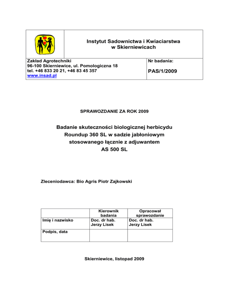 Instytut Sadownictwa i Kwiaciarstwa w Skierniewicach Zakład Agrotechniki 96-100 Skierniewice, ul. Pomologiczna 18 tel. +46 833 20 21, +46 83 45 357 www.insad.pl Nr badania: PAS/1/2009 SPRAWOZDANIE ZA ROK 2009 Badanie skuteczności biologicznej herbicydu Roundup 360 SL w sadzie jabłoniowym stosowanego łącznie z adjuwantem AS 500 SL Zleceniodawca: Bio Agris Piotr Zajkowski Imię i nazwisko Kierownik badania Doc. dr hab. Jerzy Lisek Opracował sprawozdanie Doc. dr hab. Jerzy Lisek Podpis, data Skierniewice, listopad 2009 Formularz Nr 2/PO-02a SPRAWOZDANIE KOŃCOWE Z BADAŃ Badania przeprowadzono zgodnie z Zasadami Dobrej Praktyki Eksperymentalnej 1. Jednostka organizacyjna przeprowadzająca badanie: Instytut Sadownictwa i Kwiaciarstwa w Skierniewicach, Zakład Agrotechniki 2. Tytuł i numer badania: Wpływ adjuwanta AS 500 SL na biologiczną skuteczność herbicydu Roundup 360 SL w zwalczaniu chwastów w sadzie jabłoniowym 3. Zleceniodawca: Bio Agris Piotr Zajkowski 4. Rodzaj i cel badania: 1. Ocena biologicznej aktywności środka Roundup 360 SL z dodatkiem adjuwanta AS 500 SL w zwalczaniu chwastów, ze szczególnym uwzględnieniem wierzbownicy gruczołowatej 2. Porównanie skuteczności zwalczania chwastów środkiem Roundup 360 SL z dodatkiem adjuwanta AS 500 SL do skuteczności środka Roundup 360 SL stosowanego z dwoma adjuwantami AS 500 SL i Protector oraz bez wspomagaczy 3. Ocena fitotoksyczności badanego środka dla rośliny uprawnej - badanie polowe 5. Kierownik badania: Doc. dr hab. Jerzy Lisek 6. Terminy rozpoczęcia i zakończenia części eksperymentalnej badania: 23.06.2009 18.08.2009 7. Termin sporządzenia sprawozdania: Listopad 2009 8. Liczba stron sprawozdania: 10 9. Metody i sposób prowadzenia badania: Badania przeprowadzono zgodnie z Zasadami Dobrej Praktyki Eksperymentalnej, wg wytycznych EPPO i odpowiednich procedur oraz instrukcji roboczych (PR 02, IR-01/PR-02, IR-02/PR-02), obowiązujących podczas badań rejestracyjnych środków ochrony roślin w ISK. 10. Lista osób przeprowadzających badania: Doc. dr hab. Jerzy Lisek 11. Charakterystyka badanej próbki środka ochrony roślin: a/ numer próbki: b/ nazwa środka ochrony roślin: 1 2 AS 500 SL Protector 2 c/ nazwa i zawartość substancji aktywnej ś.o.r. oraz nazwa i adres producenta tej substancji: AS 500 SL: Mieszanina soli amonowych kwasów wielozasadowych i hydroksykwasów karboksylowych, polimer oksyetylowanej aminy, regulator pH Zakład Produkcyjno-Handlowy AGROMIX ul. Mokra 7, 32-005 Niepołomice Protector: 96% di-1-P mentenu związku z grupy terpenowych polimerów Miller Chemical and Fertilizer Corp. Radio Road, Hanover, Pennsylwania 17331 USA d/ numer partii: e/ data produkcji: f/ termin dostarczenia próbki: 5/2008/AGR 15806007 06.01.2009 04/2008 08.05.2009 12. Sposób prowadzenia obserwacji i pomiarów: Obiekty badane i porównawcze aplikowano na ulistnione chwasty w różnych fazach rozwojowych. Ocenę skuteczności chwastobójczej prowadzono po 7, 14, 21 (ocena końcowa) dniach od opryskiwania. Dodatkowo, po 56 dniach od zabiegu oceniano zachwaszczenie wtórne i odrastanie chwastów trwałych. Selektywność herbicydu dla jabłoni oceniano w tych samych terminach. 13. Obliczenia statystyczne: Skuteczność chwastobójczą oceniano wizualnie, określając procent zniszczenia nadziemnej części chwastów traktowanych herbicydami, w porównaniu do chwastów nie opryskiwanych, na obiektach kontrolnych. Wyniki opracowano statystycznie metodą analizy wariancji, którą wykonano na wartościach przekształconych według transformacji Bliss’a. Istotność różnic oceniano za pomocą testu Newmana-Keuls’a przy poziomie 5%. 14. Kod doświadczenia: PAS 1/2009 15. Charakterystyka miejsca przeprowadzenia badania: a/ miejsce przeprowadzenia badania: b/ układ badania: Dąbrowice k. Skierniewic bloki losowane c/ liczba powtórzeń w przeprowadzonym badaniu: d/ wielkość poletek: e/ przedplon: f/ gatunek rośliny uprawnej i odmiana: 30 m2 (15,0 x 2,0 m) nie dotyczy jabłoń – odm. Jonagold/M 26 g/ termin sadzenia rośliny uprawnej: h/ norma wysiewu rośliny uprawnej lub rozstawa: i/ termin zbioru rośliny uprawnej: Sad Doświadczalny 1987 4,5 x 3,0 m 4 9.10.2009 (po zakończeniu części eksperymentalnej) j/ charakterystyka gleby: płowa, wytworzona z gliny zwałowej lekkiej; IV kl. bonitacyjna; pH 6,0; zaw. próchnicy 1,1% k/ określenie przeprowadzonych zabiegów uprawowych, nawozowych i innych zabiegów ochrony roślin oraz terminów ich przeprowadzenia: Zabiegi/ nawóz/ pestycyd Dawka (l, kg/ha) Termin stosowania/organizm zwalczany 3 Standardowy program ochrony przed chorobami i szkodnikami oparty o środki Miedzian Extra 350 SC, Delan 700 WG, Captan 80 WG, Calypso 480 SC, Mythos 300 SC i Score 250 EC stosowane przed rozpoczęciem badań Wapno nawozowe Saletra amonowa 03.2009 – nawożenie 04.2009 – nawożenie 2000,0 150,0 16. Parametry techniczne zabiegu: a/ typ opryskiwacza: (plecakowy, polowy, inne): poletkowy plecakowy firmy „Aporo” , z osłonami b/ pojemność zbiornika opryskiwacza [l]: 1,5 (zbiornik wymienny) c/ typ, liczba i rozstawa rozpylaczy w opryskiwaczu: d/ ciśnienie cieczy roboczej oraz rozprowadzenie cieczy: Tee Jet XR 110-03 VP (płaskostrumieniowy) - 1 0,2 MPa szerokość robocza: e/ ilość zużytej wody [l/ha]: 1,0 m f/ prędkość robocza opryskiwacza [km/h]: 4 200 Obiekty aplikowano w wodzie wodociągowej o twardości 15o d (stopni niemieckich). g/ wysokość zawieszenia belki polowej: 0,70 m 17. Dawka badanego środka ochrony roślin [kg(l)/ha]: Roundup 360 SL – 3,5 + AS 500 SL – 1,0 Roundup 360 SL – 5,0 + AS 500 SL – 1,0 Roundup 360 SL – 3,5 + AS 500 SL – 1,0 + Protector – 0,4 l/ha 18. Nazwa, zawartość substancji czynnej i dawka środka ochrony roślin stosowanego jako porównawczy [kg(l)/ha]: Roundup 360 SL – 3,5 s.a. – glifosat (sól izopropyloaminowa) 360 g/l Roundup 360 SL – 5,0 19. Terminy zabiegów: 23.06.2009 20. Faza rozwojowa roślin