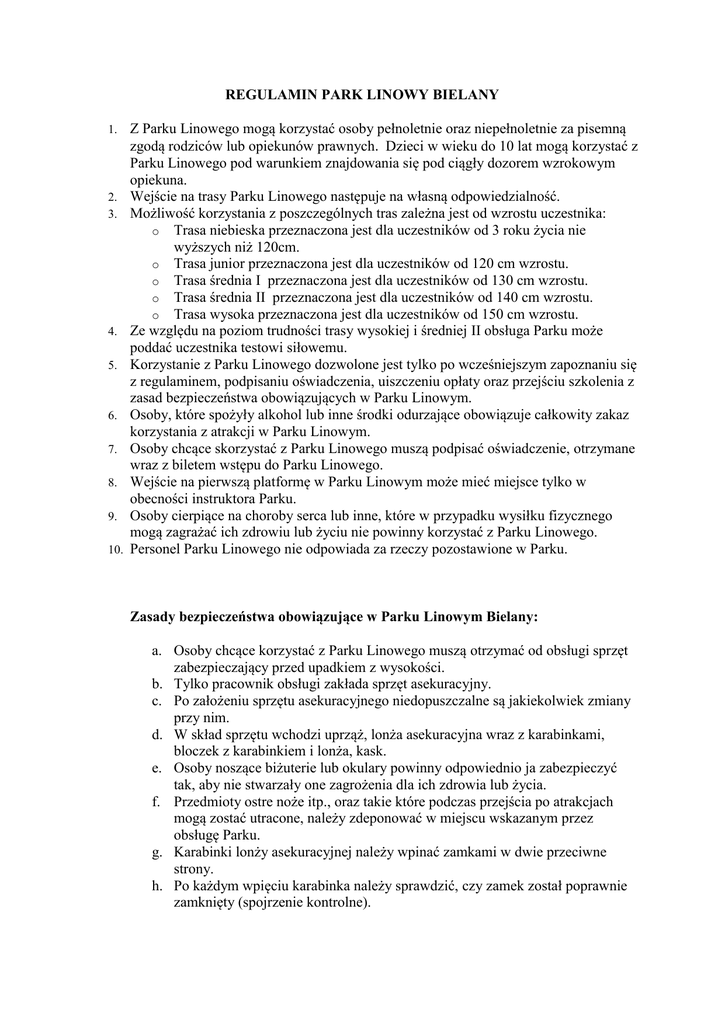 REGULAMIN PARK LINOWY BIELANY 1. 2. 3. 4. 5. 6. 7. 8. 9. 10. Z Parku Linowego mogą korzystać osoby pełnoletnie oraz niepełnoletnie za pisemną zgodą rodziców lub opiekunów prawnych. Dzieci w wieku do 10 lat mogą korzystać z Parku Linowego pod warunkiem znajdowania się pod ciągły dozorem wzrokowym opiekuna. Wejście na trasy Parku Linowego następuje na własną odpowiedzialność. Możliwość korzystania z poszczególnych tras zależna jest od wzrostu uczestnika: o Trasa niebieska przeznaczona jest dla uczestników od 3 roku życia nie wyższych niż 120cm. o Trasa junior przeznaczona jest dla uczestników od 120 cm wzrostu. o Trasa średnia I przeznaczona jest dla uczestników od 130 cm wzrostu. o Trasa średnia II przeznaczona jest dla uczestników od 140 cm wzrostu. o Trasa wysoka przeznaczona jest dla uczestników od 150 cm wzrostu. Ze względu na poziom trudności trasy wysokiej i średniej II obsługa Parku może poddać uczestnika testowi siłowemu. Korzystanie z Parku Linowego dozwolone jest tylko po wcześniejszym zapoznaniu się z regulaminem, podpisaniu oświadczenia, uiszczeniu opłaty oraz przejściu szkolenia z zasad bezpieczeństwa obowiązujących w Parku Linowym. Osoby, które spożyły alkohol lub inne środki odurzające obowiązuje całkowity zakaz korzystania z atrakcji w Parku Linowym. Osoby chcące skorzystać z Parku Linowego muszą podpisać oświadczenie, otrzymane wraz z biletem wstępu do Parku Linowego. Wejście na pierwszą platformę w Parku Linowym może mieć miejsce tylko w obecności instruktora Parku. Osoby cierpiące na choroby serca lub inne, które w przypadku wysiłku fizycznego mogą zagrażać ich zdrowiu lub życiu nie powinny korzystać z Parku Linowego. Personel Parku Linowego nie odpowiada za rzeczy pozostawione w Parku. Zasady bezpieczeństwa obowiązujące w Parku Linowym Bielany: a. Osoby chcące korzystać z Parku Linowego muszą otrzymać od obsługi sprzęt zabezpieczający przed upadkiem z wysokości. b. Tylko pracownik obsługi zakłada sprzęt asekuracyjny. c. Po założeniu sprzętu asekuracyjnego niedopuszczalne są jakiekolwiek zmiany przy nim. d. W skład sprzętu wchodzi uprząż, lonża asekuracyjna wraz z karabinkami, bloczek z karabinkiem i lonża, kask. e. Osoby noszące biżuterie lub okulary powinny odpowiednio ja zabezpieczyć tak, aby nie stwarzały one zagrożenia dla ich zdrowia lub życia. f. Przedmioty ostre noże itp., oraz takie które podczas przejścia po atrakcjach mogą zostać utracone, należy zdeponować w miejscu wskazanym przez obsługę Parku. g. Karabinki lonży asekuracyjnej należy wpinać zamkami w dwie przeciwne strony. h. Po każdym wpięciu karabinka należy sprawdzić, czy zamek został poprawnie zamknięty (spojrzenie kontrolne). i. Podczas przeprawy przez Park Linowy lonża asekuracyjna musi zawsze znajdować się między rękami idącego. j. Po dojściu do platformy należy przepiąć pojedynczo najpierw pierwszy potem drugi karabinek do liny asekuracyjnej. k. Na jednej platformie nie powinny znajdować się więcej niż dwie osoby. l. Podczas przepinania się należy w jednym momencie dotykać tylko jednego karabinka. m. Do przepinania się można używać również pętli z liny stalowej oplecionej wokół słupa. n. Wpinając się do pętli wokół drzewa należy zwrócić uwagę na to, aby karabinek był wpięty zamkiem na zewnątrz (od drzewa). o. Przed wejściem na kolejna przeszkodę należy ponownie sprawdzić poprawność wpięcia karabinków. p. Przed zjazdem na linie należy najpierw jednym karabinkiem wpiąć się do pętli oplecionej wokół drzewa, potem drugim karabinkiem w linę stalowa a następnie wpiąć bloczek w linę. Dopiero potem odpiąć karabinek z pętli oplecionej wokół drzewa i przepiać w linę zjazdową zamkiem w odwrotną stronę w stosunku do pierwszego karabinka. q. Na linie zjazdowej w pierwszej kolejności powinien znajdować się bloczek zjazdowy (symbolizuje go żółta taśma naklejona na linę służącą do zjazdu) a następnie karabinki z lonży (symbolizuje je czerwona taśma naklejona na każdą linę asekuracyjną). r. Podczas zjazdu na bloczku należy trzymać się tylko lonży bloczka i nie kłaść ręki na stalowej linie, co grozi skaleczeniem. s. Po przejechaniu na druga stronę należy zatrzymać się stopami na materacu amortyzując ugiętymi w kolanach nogami - około 50cm nad platforma, chwycić ręka liny przed bloczkiem tak, aby nie odjechać z powrotem i wstać. Uwaga!!! W ostatniej fazie zjazdu nie wyciągać przed siebie rąk w kierunku materaca. t. Szczególnie należy przestrzegać nie wchodzenia w zjazd tyrolką zanim poprzednik nie opuści podestu na końcu tyrolki, grozi to niebezpiecznym zderzeniem uczestników! u. Po przejechaniu na linie powinno się zachować następująca kolejność przepinania sprzętu asekuracyjnego; najpierw wypinamy jeden karabinek i wpinamy go do pętli oplecionej wokół drzewa, następnie wypinamy bloczek i wpinamy go do ucha u boku uprzęży, jako ostatni wypinamy karabinek będący jeszcze na stalowej linie zjazdowej i wpinamy go do kontynuacji tej liny. v. W przypadku zasłabnięcia należy wezwać obsługę Parku Linowego zostaniemy sprawnie sprowadzeni na poziom zerowy. w. Podczas przechodzenia przez Park Linowy wskazany jest spokój, nie można skakać po przeszkodach. x. Podczas wizyty w Parku Linowym powinniśmy bezwzględnie wykonywać polecenia obsługi. y. Osoby znajdujące się na terenie Parku Linowego nie mogą swoim zachowaniem zarówno na ziemi jak i na wysokości stwarzać zagrożenia dla życia lub zdrowia swojego lub innych. z. Osoby znajdujące się na terenie Parku Linowego nie mogą przeszkadzać w pracy personelowi Parku. i. Za nieprzestrzeganie jakiegokolwiek punktu regulaminu grozi bezwzględne wydalenie z terenu Parku Linowego.