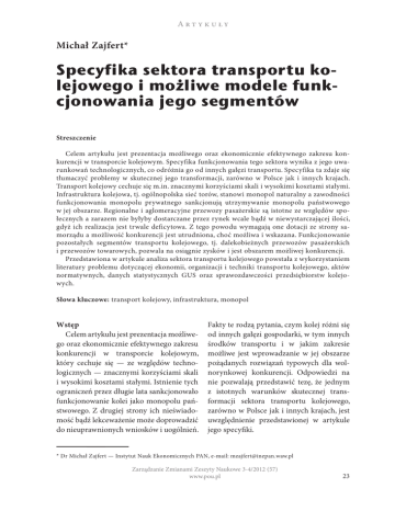 A Michał Zajfert* Specyfika sektora transportu kolejowego i możliwe modele funkcjonowania jego segmentów Streszczenie Celem artykułu jest prezentacja możliwego oraz ekonomicznie efektywnego zakresu konkurencji w transporcie kolejowym. Specyfika funkcjonowania tego sektora wynika z jego uwarunkowań technologicznych, co odróżnia go od innych gałęzi transportu. Specyfika ta zdaje się tłumaczyć problemy w skutecznej jego transformacji, zarówno w Polsce jak i innych krajach. Transport kolejowy cechuje się m.in. znacznymi korzyściami skali i wysokimi kosztami stałymi. Infrastruktura kolejowa, tj. ogólnopolska sieć torów, stanowi monopol naturalny a zawodności funkcjonowania monopolu prywatnego sankcjonują utrzymywanie monopolu państwowego w jej obszarze. Regionalne i aglomeracyjne przewozy pasażerskie są istotne ze względów społecznych a zarazem nie byłyby dostarczane przez rynek wcale bądź w niewystarczającej ilości, gdyż ich realizacja jest trwale deficytowa. Z tego powodu wymagają one dotacji ze strony samorządu a możliwość konkurencji jest utrudniona, choć możliwa i wskazana. Funkcjonowanie pozostałych segmentów transportu kolejowego, tj. dalekobieżnych przewozów pasażerskich i przewozów towarowych, pozwala na osiągnie zysków i jest obszarem możliwej konkurencji. Przedstawiona w artykule analiza sektora transportu kolejowego powstała z wykorzystaniem literatury problemu dotyczącej ekonomii, organizacji i techniki transportu kolejowego, aktów normatywnych, danych statystycznych GUS oraz sprawozdawczości przedsiębiorstw kolejowych. Słowa kluczowe: transport kolejowy, infrastruktura, monopol Wstęp Celem artykułu jest prezentacja możliwego oraz ekonomicznie efektywnego zakresu konkurencji w transporcie kolejowym, który cechuje się — ze względów technologicznych — znacznymi korzyściami skali i wysokimi kosztami stałymi. Istnienie tych ograniczeń przez długie lata sankcjonowało funkcjonowanie kolei jako monopolu państwowego. Z drugiej strony ich nieświadomość bądź lekceważenie może doprowadzić do nieuprawnionych wniosków i uogólnień. Fakty te rodzą pytania, czym kolej różni się od innych gałęzi gospodarki, w tym innych środków transportu i w jakim zakresie możliwe jest wprowadzanie w jej obszarze pożądanych rozwiązań typowych dla wolnorynkowej konkurencji. Odpowiedzi na nie pozwalają przedstawić tezę, że jednym z istotnych warunków skutecznej transformacji sektora transportu kolejowego, zarówno w Polsce jak i innych krajach, jest uwzględnienie przedstawionej w artykule jego specyfiki. * Dr Michał Zajfert — Instytut Nauk Ekonomicznych PAN, e-mail: [email protected] Zarządzanie Zmianami Zeszyty Naukowe 3-4/2012 (57) www.pou.pl 23 Z Z -/ Artykuł składa się z siedmiu rozdziałów. W pierwszych czterech przedstawiono czynniki ekonomiczne wynikające z występowania tych ograniczeń dla poszczególnych segmentów: infrastruktury, przewozów towarowych, przewozów pasażerskich oraz taboru kolejowego. W kolejnym rozdziale zostały zaprezentowane czynniki wynikające z dostarczania przez kolej usług o charakterze użyteczności publicznej. W rozdziale szóstym przedstawiony jest kolejny czynnik: uwarunkowania historyczne, tj. ukształtowany historycznie monopol państwowy. Opisane wcześniej czynniki i ograniczenia pozwalają wskazać na możliwy obszar konkurencji, który przedstawiono w ostatnim rozdziale. 1. Infrastruktura Ogół linii kolejowych wraz ze wszystkimi stacjami (w tym dworcami kolejowymi), przystankami, posterunkami ruchu, stacjami rozrządowymi i przeładunkowymi oraz urządzeniami sterowania ruchem kolejowym, zasilania itd. tworzy sieć kolejową stanowiącą infrastrukturę transportu kolejowego [Koźlak 2008, s.34]. W przypadku sieci kolejowej niepodzielność procesu produkcji sprawia, że konieczne jest ponoszenie znacznych kosztów jej utrzymania niezależnie od poziomu jej wykorzystania. Sprawia to, że wraz ze wzrostem ruchu pociągów koszty przeciętne przypadające na jeden pociąg szybko spadają. Technicznym ograniczeniem maksymalnych rozmiarów produkcji (podaży usług polegających na dostępie do infrastruktury) jest przepustowość linii i stacji kolejowych wynikająca z wymogów bezpieczeństwa ruchu kolejowego. Określają one, że na jednym odstępie (czyli na odcinku toru kolejowego pomiędzy stacjami bądź se24 maforami blokady liniowej) może znajdować się tylko jeden pociąg. Oprócz oczywistego ograniczenia możliwości jazdy pociągów w przeciwnych kierunkach po tym samym torze, oznacza to, że dwa różne pociągi jadące w tym samym kierunku nie mogą wyruszyć z tej samej stacji dokładnie o tej samej godzinie. Konsekwencją tego technicznego ograniczenia jest konieczność wcześniejszego planowania całości ruchu kolejowego (tj. tras i godzin przejazdu wszystkich pociągów, w tym towarowych) zapewniającego ich bezkolizyjny przejazd, co ujęte jest w formie rozkładu jazdy i wykresów ruchu pociągów. Osiągnięcie przez ruch kolejowy granicy przepustowości sprawia, że dalsze zwiększanie produkcji przy istniejącej infrastrukturze jest po prostu techniczne niemożliwe. Dlatego przedstawiona na rys. 1. krzywa kosztów przeciętnych utrzymania infrastruktury danej linii przypadających na jeden pociąg zawsze opada wraz ze wzrostem ruchu kolejowego i kończy się w punkcie Q1 opisującym granicę przepustowości tej linii. Opisany kształt krzywej kosztów przeciętnych determinuje występowanie w obszarze infrastruktury kolejowej znacznych korzyści ze skali produkcji. W przypadku produkcji typowego dobra prywatnego wzrost popytu powyżej aktualnego poziomu podaży motywuje jego producentów do budowy nowej fabryki bądź modernizacji już istniejących. W odniesieniu do kolei zastosowanie obydwu tych rozwiązań także jest technicznie możliwe. Jednak przeprowadzenie modernizacji linii kolejowej pozwalające na zwiększenie jej przepu