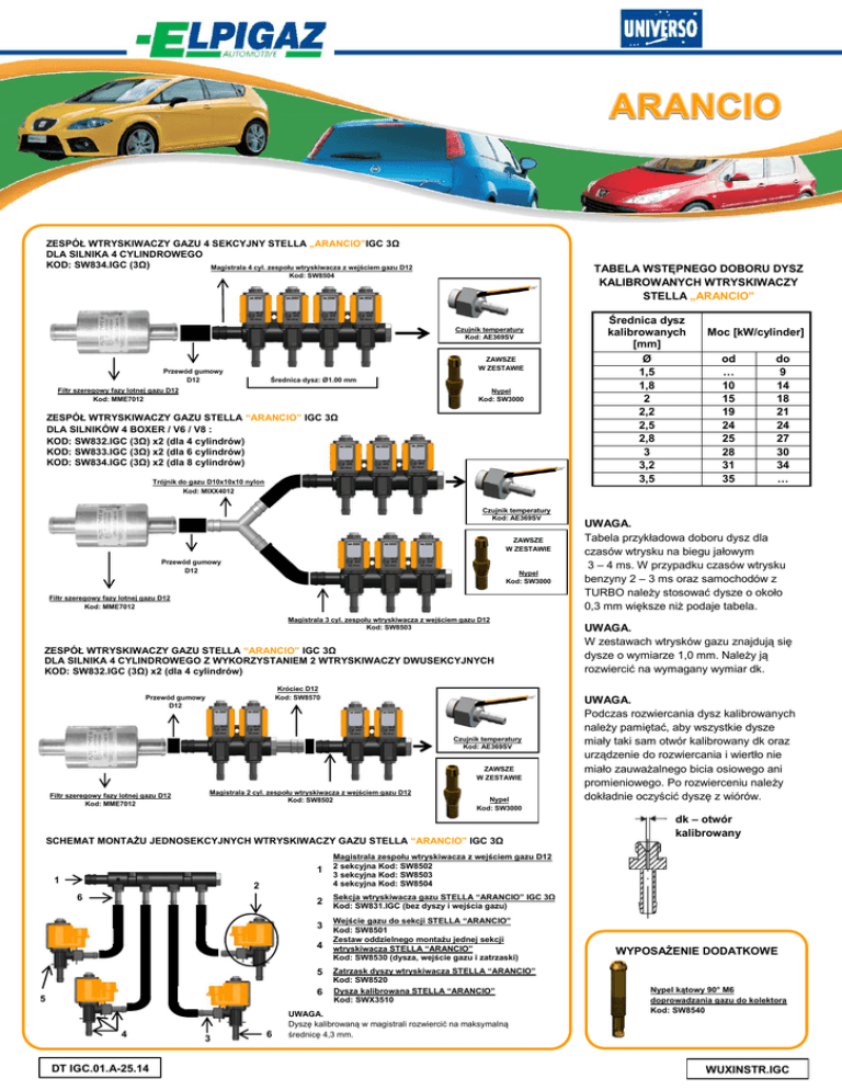 ZESPÓŁ WTRYSKIWACZY GAZU 4 SEKCYJNY STELLA „ARANCIO”IGC 3Ω DLA SILNIKA 4 CYLINDROWEGO KOD: SW834.IGC (3Ω) Magistrala 4 cyl. zespołu wtryskiwacza z wejściem gazu D12 TABELA WSTĘPNEGO DOBORU DYSZ KALIBROWANYCH WTRYSKIWACZY STELLA „ARANCIO” Kod: SW8504 Czujnik temperatury Kod: AE369SV ZAWSZE W ZESTAWIE Przewód gumowy D12 Średnica dysz: Ø1.00 mm Filtr szeregowy fazy lotnej gazu D12 Kod: MME7012 Nypel Kod: SW3000 ZESPÓŁ WTRYSKIWACZY GAZU STELLA “ARANCIO” IGC 3Ω DLA SILNIKÓW 4 BOXER / V6 / V8 : KOD: SW832.IGC (3Ω) x2 (dla 4 cylindrów) KOD: SW833.IGC (3Ω) x2 (dla 6 cylindrów) KOD: SW834.IGC (3Ω) x2 (dla 8 cylindrów) Trójnik do gazu D10x10x10 nylon Kod: MIXX4012 Czujnik temperatury Kod: AE369SV ZAWSZE W ZESTAWIE Przewód gumowy D12 Nypel Kod: SW3000 nozzles Filtr szeregowy fazy lotnej gazu D12 Kod: MME7012 Magistrala 3 cyl. zespołu wtryskiwacza z wejściem gazu D12 Kod: SW8503 ZESPÓŁ WTRYSKIWACZY GAZU STELLA “ARANCIO” IGC 3Ω DLA SILNIKA 4 CYLINDROWEGO Z WYKORZYSTANIEM 2 WTRYSKIWACZY DWUSEKCYJNYCH KOD: SW832.IGC (3Ω) x2 (dla 4 cylindrów) Króciec D12 Kod: SW8570 Przewód gumowy D12 Czujnik temperatury Kod: AE369SV ZAWSZE W ZESTAWIE Filtr szeregowy fazy lotnej gazu D12 Kod: MME7012 Magistrala 2 cyl. zespołu wtryskiwacza z wejściem gazu D12 Kod: SW8502 Nypel Kod: SW3000 SCHEMAT MONTAŻU JEDNOSEKCYJNYCH WTRYSKIWACZY GAZU STELLA “ARANCIO” IGC 3Ω 1 1 Magistrala zespołu wtryskiwacza z wejściem gazu D12 2 sekcyjna Kod: SW8502 3 sekcyjna Kod: SW8503 4 sekcyjna Kod: SW8504 2 Sekcja wtryskiwacza gazu STELLA “ARANCIO” IGC 3Ω Kod: SW831.IGC (bez dyszy i wejścia gazu) 2 6 3 4 5 6 5 4 DT IGC.01.A-25.14 3 6 Wejście gazu do sekcji STELLA “ARANCIO” Kod: SW8501 Zestaw oddzielnego montażu jednej sekcji wtryskiwacza STELLA “ARANCIO” Kod: SW8530 (dysza, wejście gazu i zatrzaski) Zatrzask dyszy wtryskiwacza STELLA “ARANCIO” Kod: SW8520 Dysza kalibrowana STELLA “ARANCIO” Kod: SWX3510 UWAGA. Dyszę kalibrowaną w magistrali rozwiercić na maksymalną średnicę 4,3 mm. Średnica dysz kalibrowanych [mm] Ø 1,5 1,8 2 2,2 2,5 2,8 3 3,2 3,5 Moc [kW/cylinder] od … 10 15 19 24 25 28 31 35 do 9 14 18 21 24 27 30 34 … UWAGA. Tabela przykładowa doboru dysz dla czasów wtrysku na biegu jałowym 3 – 4 ms. W przypadku czasów wtrysku benzyny 2 – 3 ms oraz samochodów z TURBO należy stosować dysze o około 0,3 mm większe niż podaje tabela. UWAGA. W zestawach wtrysków gazu znajdują się dysze o wymiarze 1,0 mm. Należy ją rozwiercić na wymagany wymiar dk. UWAGA. Podczas rozwiercania dysz kalibrowanych należy pamiętać, aby wszystkie dysze miały taki sam otwór kalibrowany dk oraz urządzenie do rozwiercania i wiertło nie miało zauważalnego bicia osiowego ani promieniowego. Po rozwierceniu należy dokładnie oczyścić dyszę z wiórów. dk – otwór kalibrowany WYPOSAŻENIE DODATKOWE Nypel kątowy 90° M6 doprowadzania gazu do kolektora Kod: SW8540 WUXINSTR.IGC Wtryskiwacz STELLA „ARANCIO”- instrukcja kompletacji UWAGA!!! Przed włożeniem elementu posmaruj WSZYSTKIE O-ringi olejem 5 1 2 I 6 WTRYSKIWACZ (1 SEKCJA) II 7 3 GNIAZDO MAGISTRALI ZATRZASK GNIAZDO WTRYSKIWACZA 4 ZATRZASK DYSZA KALIBROWANA 8 UWAGA!!! W pierwszej kolejności należy wykonać czynności związane z osadzeniem DYSZY KALIBROWANEJ we wtryskiwaczu - czynności oznaczone "I" (zdjęcia 1-4). Po wykonaniu ww. we wszystkich sekcjach, należy przystąpić do osadzania wtryskiwaczy w magistrali wtryskowej - czynności oznaczone "II" (zdjęcia 5-8). Przed włożeniem dyszy kalibrowanej i wtryskiwacza w odpowiednie gniazdo, sprawdź czy w gnieździe nie ma "zadziorów" mogących uszkodzić O-ring. OPIS POSTĘPOWANIA ZGODNIE Z NUMERACJĄ ZDJĘĆ. 1/ Umieścić dyszę kalibrowaną w gnieździe wtryskiwacza. Przed włożeniem posmarować O-ringi olejem. Czynność powtórzyć dla każdego wtryskiwacza (sekcji). 2/ Docisnąć dyszę kalibrowaną tak aby całkowicie schowała się w gnieździe wtryskiwacza - powinna wejść dość swobodnie. 3/ Wsunąć zawleczkę zgodnie ze zdjęciem nr 3. UWAGA!!! Zatrzask powinna wejść dość swobodnie bez konieczności używania dużej siły. 4/ Prawidłowo osadzona dysza kalibrowana we wtryskiwaczu. 5/ Umieścić wtryskiwacz w gnieździe magistrali wtryskowej. Przed włożeniem posmarować O-ringi olejem. Czynność powtórzyć dla każdego wtryskiwacza (sekcji). 6/ Docisnąć wtryskiwacz tak aby jego króciec przyłączeniowy całkowicie schował się w gnieździe magistrali - powinien wejść dość swobodnie. 7/ Wsunąć zawleczkę zgodnie ze zdjęciem nr 7. UWAGA!!! Zatrzask powinna wejść dość swobodnie bez konieczności używania dużej siły. 8/ Prawidłowo zmontowany wtryskiwacz. DT IGC.01.A-25.14 WUXINSTR.IGC