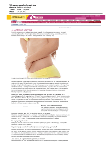 Wirusowe zapalenie w¹troby Gazeta: kobieta.interia.pl Tytu³: Atak z ukrycia Data: 14.07.2011 poczta znajomi CZATeria INTERIA.PL Szukaj w Internecie MEDYCYNA KOBIETA Start CASINO GRY ON-LINE OBRAZY BIELIZNA DZIECKO WESELE I ŚLUB Zdrowie Uroda Seks Moda Dom i ogród Psychologia Być kobietą Kuchnia Książki Wywiady Konkursy Quizy Profilaktyka Terapie Diety Rozmiar tekstu: A A A Atak z ukrycia Przeciw wirusowemu zapaleniu wątroby typu B chroni szczepionka, wobec wirusa C Jeste śmy bezradni. Nadal najbardziej niebezpieczne są kontakty... ze służbą zdrowia. Patrzmy więc na ręce lekarzom i pielęgniarkom oraz badajmy się! U pacjentów zakażonych HCV mogą rozwinąć się marsko ść lub rak wątroby /© Panthermedia Oficjalne statystyki mówią o 40 tys. Polaków zakażonych wirusem HCV, ale specjaliści twierdzą, że może być ich nawet 700 tys. Rozbieżności biorą się stąd, że chorzy przez wiele lat nie odczuwają żadnych dolegliwości albo są one mało charakterystyczne, np. osłabienie, apatia, bóle mięśni czy obniżenie nastroju. - Dlatego raz na 2-3 lata warto sprawdzić, czy wirus HCV nie zadomowił się w naszym organizmie - radzi prof. dr hab. Waldemar Halota, szef Polskiej Grupy Ekspertów HCV, kierownik Katedry i Kliniki Chorób Zakaźnych i Hepatologii Collegium Medicum Uniwersytetu Mikołaja Kopernika w Bydgoszczy. PANI: Przy okazji rutynowych badań dowiadujemy się, że mamy we krwi wirus HCV wywołujący zapalenie wątroby typu C. Szok! To przecież potencjalnie śmiertelna choroba. Prof. Waldemar Halota: Wykrycie przeciwciał anty-HCV nie przesądza jeszcze o tym, że jesteśmy chorzy. To tylko dowód na to, że w przeszłości zostaliśmy zakażeni. Żeby dowiedzieć się, czy zakażenie jest aktywne i czy wywołało jakiekolwiek skutki zdrowotne w organizmie, niezbędne są badania molekularne wykrywające wirusa HCV. DIETY Może je zlecić lekarz rodzinny? Nie, powinien skierować pacjenta z dodatnim wynikiem badania na obecność przeciwciał do specjalisty chorób zakaźnych lub hepatologa. Podobno niektóre typy HCV są bardziej oporne na leczenie. Wiadomo, że pacjent z wirusem o genotypie 1 prawdopodobnie nie będzie reagował na terapię tak dobrze jak chory z genotypem 2 lub 3. Półroczna terapia pozwala pozbyć się wirusa u 80 proc. chorych z "2" i "3". Przy "1" pozytywnego wyniku spodziewamy się tylko u połowy. Na czym polega leczenie? Podajemy dwa leki przeciwwirusowe: interferon i rybawirynę, przez 6-12 miesięcy, w przypadku genotypu 1 dłużej - do 72 tygodni. Czy obowiązuje zasada: im szybciej rozpoczniemy terapię, tym lepiej? Badania potwierdzają, że im szybciej rozpoczniemy leczenie, tym lepszy będzie efekt terapeutyczny. Ale wiemy też, że tylko 20 procent chorych bez leczenia będzie mieć marskość i raka wątroby. Nie ma wątpliwości, że pacjent z zaawansowaną patologią wątroby powinien być natychmiast leczony, a w innych przypadkach można poczekać. Nie potrafi my prognozować rozwoju choroby, musimy pacjenta wnikliwie i systematycznie obserwować. Jest szansa, że organizm sam wyeliminuje wirusa? Prawdopodobnie 20 proc. zakażonych zwalcza wirusa spontanicznie. Pacjenci ci nie są aktywnie zakażeni, stąd nie wymagają leczenia. U pozostałych 80 proc. zakażenie HCV przechodzi w stan przewlekły. Marskość, rzadziej rak wątroby rozwiną się u co piątego z nich. Niestety, choć bardzo szukaj KONESER ASTROLOGIA Galerie Tylko u nas Czy obowiązuje zasada: im szybciej rozpoczniemy terapię, tym lepiej? Badania potwierdzają, że im szybciej rozpoczniemy leczenie, tym lepszy będzie efekt terapeutyczny. Ale wiemy też, że tylko 20 procent chorych bez leczenia będzie mieć marskość i raka wątroby. Nie Wirusowe zapalenie w¹troby ma wątpliwości, że pacjent z zaawansowaną patologią wątroby powinien być natychmiast leczony, Gazeta: kobieta.interia.plpoczekać. Nie potrafi my prognozować rozwoju choroby, musimy a w innych przypadkach można Tytu³: Atak z ukrycia pacjenta wnikliwie i systematycznie obserwować. Data: 14.07.2011 Jest szansa, że organizm sam wyeliminuje wirusa? Prawdopodobnie 20 proc. zakażonych zwalcza wirusa spontanicznie. Pacjenci ci nie są aktywnie zakażeni, stąd nie wymagają leczenia. U pozostałych 80 proc. zakażenie HCV przechodzi w stan przewlekły. Marskość, rzadziej rak wątroby rozwiną się u co piątego z nich. Niestety, choć bardzo byśmy chcieli, nie potrafi my przewidzieć, dla kogo choroba jest najgroźniejsza. Chorzy, którzy przeszli leczenie przeciwwirusowe, twierdzą, że to koszmar. Podobno mogą wystąpić zaburzenia psychiczne, a nawet przypadki uszkodzenia szpiku kostnego. Niektórzy chorzy rzeczywiście fatalnie to znoszą. Bywa, że muszą przerwać leczenie. Jednak w większości przypadków objawy uboczne łagodnieją po kilku tygodniach. Nie ma trwałych negatywnych skutków leczenia interferonem. Ale podobno zdarzają się nawroty choroby... Owszem. Dlatego pacjent jest pod obserwacją jeszcze przez 24 tygodnie od zakończenia terapii. Ale nawet jeśli dojdzie do nawrotu, to rokowania są dobre, bo ci chorzy prawdopodobnie znowu pozytywnie zareagują na leczenie. Czy lekarz może wtedy coś zaoferować? Niewiele, ale jest szansa, że jeszcze w tym roku pojawi się nowy lek. Zamiast dwóch standardowych preparatów będziemy mogli zaproponować skuteczniejszą terapię trójlekową. Co to za substancja? Ta cała nowa grupa leków to inhibitory proteazy serynowej, czyli enzymu niezbędnego do namnażania wirusa. Wiemy z badań klinicznych, że szansa na skuteczną terapię zwiększa się wtedy o kilkadziesiąt procent w stosunku do obowiązujących obecnie schematów. Te leki dają nadzieję zwłaszcza tym, którzy wcześniej nie reagowali na leczenie. Ostatnio dwa takie preparaty - boceprevir i telaprevir - zostały wprowadzone w Stanach Zjednoczonych. Kto powinien się zbadać w kierunku HCV? Właściwie każdy, bo okazji do zakażenia mieliś