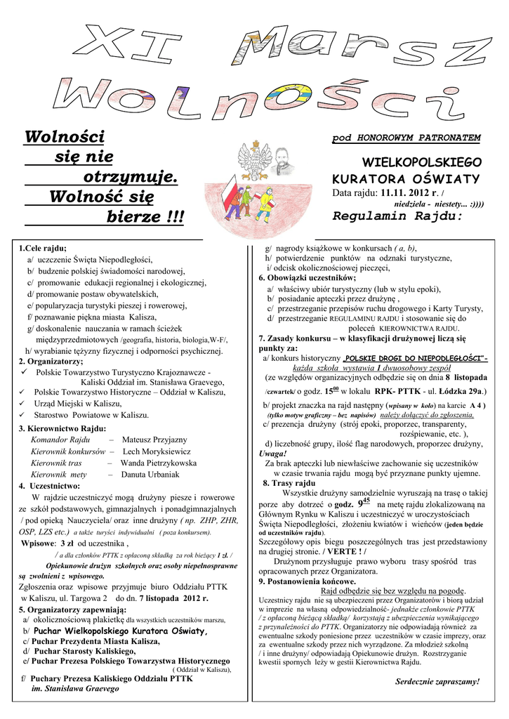 „W Wolności się nie otrzymuje. Wolność się bierze !!! 1.Cele rajdu; a/ uczczenie Święta Niepodległości, b/ budzenie polskiej świadomości narodowej, c/ promowanie edukacji regionalnej i ekologicznej, d/ promowanie postaw obywatelskich, e/ popularyzacja turystyki pieszej i rowerowej, f/ poznawanie piękna miasta Kalisza, g/ doskonalenie nauczania w ramach ścieżek międzyprzedmiotowych /geografia, historia, biologia,W-F/, h/ wyrabianie tężyzny fizycznej i odporności psychicznej. 2. Organizatorzy; Polskie Towarzystwo Turystyczno Krajoznawcze Kaliski Oddział im. Stanisława Graevego, Polskie Towarzystwo Historyczne – Oddział w Kaliszu, Urząd Miejski w Kaliszu, Starostwo Powiatowe w Kaliszu. 3. Kierownictwo Rajdu: Komandor Rajdu – Mateusz Przyjazny Kierownik konkursów – Lech Moryksiewicz Kierownik tras – Wanda Pietrzykowska Kierownik mety – Danuta Urbaniak 4. Uczestnictwo: W rajdzie uczestniczyć mogą drużyny piesze i rowerowe ze szkół podstawowych, gimnazjalnych i ponadgimnazjalnych / pod opieką Nauczyciela/ oraz inne drużyny ( np. ZHP, ZHR, OSP, LZS etc.) a także turyści indywidualni ( poza konkursem). Wpisowe: 3 zł od uczestnika , / a dla członków PTTK z opłaconą składką za rok bieżący 1 zł. / Opiekunowie drużyn szkolnych oraz osoby niepełnosprawne są zwolnieni z wpisowego. Zgłoszenia oraz wpisowe przyjmuje biuro Oddziału PTTK w Kaliszu, ul. Targowa 2 do dn. 7 listopada 2012 r. 5. Organizatorzy zapewniają: a/ okolicznościową plakietkę dla wszystkich uczestników marszu, b/ Puchar Wielkopolskiego Kuratora Oświaty, c/ Puchar Prezydenta Miasta Kalisza, d/ Puchar Starosty Kaliskiego, e/ Puchar Prezesa Polskiego Towarzystwa Historycznego ( Oddział w Kaliszu), f/ Puchary Prezesa Kaliskiego Oddziału PTTK im. Stanisława Graevego pod HONOROWYM PATRONATEM WIELKOPOLSKIEGO KURATORA OŚWIATY Data rajdu: 11.11. 2012 r. / niedziela - niestety... :)))) Regulamin Rajdu: g/ nagrody książkowe w konkursach ( a, b), h/ potwierdzenie punktów na odznaki turystyczne, i/ odcisk okolicznościowej pieczęci, 6. Obowiązki uczestników; a/ właściwy ubiór turystyczny (lub w stylu epoki), b/ posiadanie apteczki przez drużynę , c/ przestrzeganie przepisów ruchu drogowego i Karty Turysty, d/ przestrzeganie REGULAMINU RAJDU i stosowanie się do poleceń KIEROWNICTWA RAJDU. 7. Zasady konkursu – w klasyfikacji drużynowej liczą się punkty za: a/ konkurs historyczny „POLSKIE DROGI DO NIEPODLEGŁOŚCI”każda szkoła wystawia 1 dwuosobowy zespół (ze względów organizacyjnych odbędzie się on dnia 8 listopada /czwartek/ o godz. 1500 w lokalu RPK- PTTK - ul. Łódzka 29a.) b/ projekt znaczka na rajd następny (wpisany w koło) na karcie A 4 ) (tylko motyw graficzny – bez napisów) należy dołączyć do zgłoszenia, c/ prezencja drużyny (strój epoki, proporzec, transparenty, rozśpiewanie, etc. ), d) liczebność grupy, ilość flag narodowych, proporzec drużyny, Uwaga! Za brak apteczki lub niewłaściwe zachowanie się uczestników w czasie trwania rajdu mogą być przyznane punkty ujemne. 8. Trasy rajdu Wszystkie drużyny samodzielnie wyruszają na trasę o takiej 45 porze aby dotrzeć o godz. 9 na metę rajdu zlokalizowaną na Głównym Rynku w Kaliszu i uczestniczyć w uroczystościach Święta Niepodległości, złożeniu kwiatów i wieńców (jeden będzie od uczestników rajdu). Szczegółowy opis biegu poszczególnych tras jest przedstawiony na drugiej stronie. / VERTE ! / Drużynom przysługuje prawo wyboru trasy spośród tras opracowanych przez Organizatora. 9. Postanowienia końcowe. Rajd odbędzie się bez względu na pogodę. Uczestnicy rajdu nie są ubezpieczeni przez Organizatorów i biorą udział w imprezie na własną odpowiedzialność- jednakże członkowie PTTK / z opłaconą bieżącą składką/ korzystają z ubezpieczenia wynikającego z przynależności do PTTK. Organizatorzy nie odpowiadają również za ewentualne szkody poniesione przez uczestników w czasie imprezy, oraz za ewentualne szkody przez nich wyrządzone. Za młodzież szkolną / i inne drużyny/ odpowiadają Opiekunowie drużyn. Rozstrzyganie kwestii spornych leży w gestii Kierownictwa Rajdu. Serdecznie zapraszamy! Wykaz tras pieszych: Trasa A Cmentarz Wojskowy (zbiórka przy wejściu) dalej ulicami ► Żołnierska► Stawiszyńska ►Plac Kilińskiego► Zamkowa► Główny Rynek /meta/, Trasa B Dworzec PKP /start/ dalej ulicami: ► Dworcowa ► Górnośląska ► Śródmiejska ► Główny Rynek /meta/, Trasa C Tyniec- Przystanek KLA (przy cmentarzu )/ start/ dalej ulicami: Łódzka Walecznych ► Plac św. Józefa ►Mariańska ► Główny Rynek /meta/, Trasa D Nowy Szpital- Przystanek KLA / start / dalej ulicami► Poznańska ►Al. Wojska Polskiego ►Wodna ►Narutowicza ►Grodzka ►Złota ► Główny Rynek /meta/, Trasa E Kościół św. Gotarda / start/ dalej ulicami: ►Częstochowska ►Nowy Świat ► Legionów ► Al. Wolności ► Sukiennicza ►Rzeźnicza ► Główny Rynek /meta/, Trasa F Szczypiorno – Ośrodek Szkolenia Kadr Służby Więziennej / start/ dalej ulicami ► Wrocławska ► Górnośląska ► Śródmiejska ► Główny Rynek /meta/. Trasa G Winiary -Przystanek KLA / start/ dalej ulicami: Łódzka ► Trakt Bursztynowy ► Częstochowska ► Al. Wolności ► Sukiennicza ► Główny Rynek /meta/. Trasa własna drużyny: w zgłoszeniu należy podać jej przebieg (szczególnie ze względu na pkt. 7c i 7d regulaminu)! Zakres chronologiczny konkursu historycznego: „Polskie drogi do niepodległości”: lata 1794 – 1922 pytania opracowane zostaną na podstawie (głównie): Historia - Podręczniki szkolne do szkoły podstawowej z listy a/ dla szkół podstawowych: zatwierdzonych przez MEN b/ dla gimnazjum: c/ dla liceum, technikum , szkół zawodowych Historia - Podręczniki szkolne do gimnazjum z listy zatwierdzonych przez MEN oraz odpowiedni chronologicznie fragment „Bożego Igrzyska” Normana Daviesa. Historia