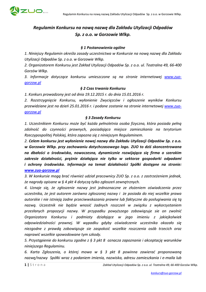 Regulamin Konkursu na nową nazwę Zakładu Utylizacji Odpadów Sp. z o.o. w Gorzowie Wlkp. Regulamin Konkursu na nową nazwę dla Zakładu Utylizacji Odpadów Sp. z o.o. w Gorzowie Wlkp. § 1 Postanowienia ogólne 1. Niniejszy Regulamin określa zasady uczestnictwa w Konkursie na nową nazwę dla Zakładu Utylizacji Odpadów Sp. z o.o. w Gorzowie Wlkp. 2. Organizatorem Konkursu jest Zakład Utylizacji Odpadów Sp. z o.o. ul. Teatralna 49, 66-400 Gorzów Wlkp. 3. Informacje dotyczące konkursu umieszczone są na stronie internetowej www.zuogorzow.pl § 2 Czas trwania Konkursu 1. Konkurs prowadzony jest od dnia 19.12.2015 r. do dnia 15.01.2016 r. 2. Rozstrzygnięcie Konkursu, wyłonienie Zwycięzców i ogłoszenie wyników Konkursu przewidziane jest na dzień 25.01.2016 r. i podane zostanie na stronie internetowej www.zuogorzow.pl § 3 Zasady Konkursu 1. Uczestnikiem Konkursu może być każda pełnoletnia osoba fizyczna, która posiada pełną zdolność do czynności prawnych, posiadająca miejsce zamieszkania na terytorium Rzeczypospolitej Polskiej, która zapozna się z niniejszym Regulaminem. 2. Celem konkursu jest wyłonienie nowej nazwy dla Zakładu Utylizacji Odpadów Sp. z o.o. w Gorzowie Wlkp. przy zachowaniu dotychczasowego logo. ZUO to dziś skoncentrowana na dbałości o środowisko, nowoczesna, dynamicznie rozwijająca się firma o szerokim zakresie działalności, prężnie działająca nie tylko w sektorze gospodarki odpadami i ochrony środowiska. Informacje na temat działalności Spółki dostępne na stronie: www.zuo-gorzow.pl 3. W konkursie mogą brać również udział pracownicy ZUO Sp. z o.o. z zastrzeżeniem jednak, że nagrody opisane w § 4 pkt 4 dotyczą tylko zgłoszeń zewnętrznych. 4. Uznaje się, że zgłoszenie nazwy jest jednoznaczne ze złożeniem oświadczenia przez uczestnika, że jest autorem zarówno zgłoszonej nazwy i że posiada do niej wszelkie prawa autorskie i nie istnieją żadne przeciwwskazania prawne lub faktyczne do posługiwania się tą nazwą. Uczestnik nie będzie wnosić żadnych roszczeń w związku z wykorzystaniem przesłanych propozycji nazwy. W przypadku powyższego zobowiązuje sie on zwolnić Organizatora Konkursu i podmioty działające w jego imieniu z jakiejkolwiek odpowiedzialności prawnej. W wypadku gdyby oświadczenie uczestnika okazało się niezgodne z prawdą zobowiązuje sie zaspokoić wszelkie roszczenia osób trzecich oraz naprawić wszelkie spowodowane tym szkody. 5. Przystąpienie do konkursu zgodne z § 3 pkt 8 oznacza zapoznanie i akceptację warunków niniejszego Regulaminu. 6. Karta Zgłoszenia, o której mowa w § 3 pkt 8 powinna zawierać proponowaną nazwę/nazwy Spółki wraz z podaniem imienia, nazwiska, adresu zamieszkania i e-maila lub 1|Stro na Zakład Utylizacji Odpadów Sp. z o.o. ul. Teatralna 49, 66-400 Gorzów Wlkp. [email protected] Regulamin Konkursu na nową nazwę Zakładu Utylizacji Odpadów Sp. z o.o. w Gorzowie Wlkp. telefonu kontaktowego osoby zgłaszającej. Wzór Karty Zgłoszenia stanowi załącznik nr 1 do niniejszego regulaminu. 7. Naruszenie regulaminu powoduje utratę prawa uczestnictwa w Konkursie oraz utratę prawa do otrzymania nagrody. 8. Uczestnictwo w konkursie odbywa się poprzez złożenie Karty Zgłoszenia w skrzynce konkursowej podczas Jarmarku Bożonarodzeniowego w dniach 19-20.12.2015 roku, lub przez cały czas trwania konkursu tj. od dnia 19.12.2015 r. do dnia 15.01.2016 r.: a. w formie elektronicznej na adres: [email protected] b. lub listownie na adres (liczy się data wpływu korespondencji do ZUO): Zakład Utylizacji Odpadów Sp. z o.o. ul. Teatralna 49, 66-400 Gorzów Wlkp. z dopiskiem: KONKURS. 9. Ilość zgłoszonych propozycji nazw przez jednego uczestnika konkursu jest dowolna. § 4 Rozstrzygnięcie Konkursu i nagrody 1. Komisja Konkursowa wyłoni Zwycięzców spośród Uczestników Konkursu, którzy złożyli zgodnie z § 3 pkt 8 Kartę Zgłoszenia. 2. Organizator zastrzega sobie prawo do wykluczenia z Konkursu przesłanej propozycji. W szczególności przyczyną wykluczenia zgłoszenia z Konkursu może być: a) zawarcie treści, która nie jest związana z tematyką Konkursu; b) zawarcie treści naruszającej prawo bądź godzących w dobre obyczaje, która może naruszać ogólnie przyjęte normy moralności, w szczególności obrażać uczucia religijne, stanowić wyraz dyskryminacji, zawierać treści wulgarne, obraźliwe itp. 2. Kryteria oceny są subiektywne i zależą wyłącznie od preferencji członków Komisji Konkursowej. 3.Nagrodzone zostaną 3 najlepsze propozycje wyłonione prze Komisję Konkursową. 4. Nagrodami w Konkursie są nagrody rzeczowe w postaci sprzętu IT: Miejsce 1 - Laptop : HP 250 Miejsce 2 - Tablet : Lenovo Tab2 Miejsce 3 – Smartphone Huawei Honor Holly Black 5. Nagroda nie podlega zamianie na inną nagrodę rzeczową. Uprawnienie do nagrody nie może być przeniesione na osobę trzecią. 6. O wynikach Konkursu i sposobie odebrania nagród, Zwycięzcy zostaną poinformowani drogą e-mailową lub telefonicznie. 7. Organizator nie ponosi odpowiedzialności za niemożność przekazania nagrody z przyczyn od niego niezależnych, w szczególności w przypadku, gdy Uczestnik podał w Karcie Zgłoszenia nieprawdziwe bądź niepoprawne dane kontaktowe. 8. Spośród 3 wybranych przez Komisję Konkursową propozycji ostatecznego wyboru nazwy dla Spółki dokona Prezydent Miasta Gorzowa Wlkp. § 5 Prawa autorskie Organizator działając na podstawie art. 921 § 3 kodeksu cywilnego, zastrzega, że z chwilą wydania nagrody nabywa całość autorskich praw majątkowych do wybranych propozycji 2|Stro na Zakład Utylizacji Odpadów Sp. z o.o. ul. Teatralna 49, 66-400 Gorzów Wlkp. [email protected] Regulamin Konkursu na nową nazwę Zakładu Utylizacji Odpadów Sp. z o.o. w Gorzowie Wlkp. nazwy dla Zakładu Utylizacji Odpadów Sp. z o.o. w rozumieniu Ustawy z dnia 4 lutego 1994 r. o prawie autorskim i prawach pokrewnych (Dz.U.06.90 631 z pó