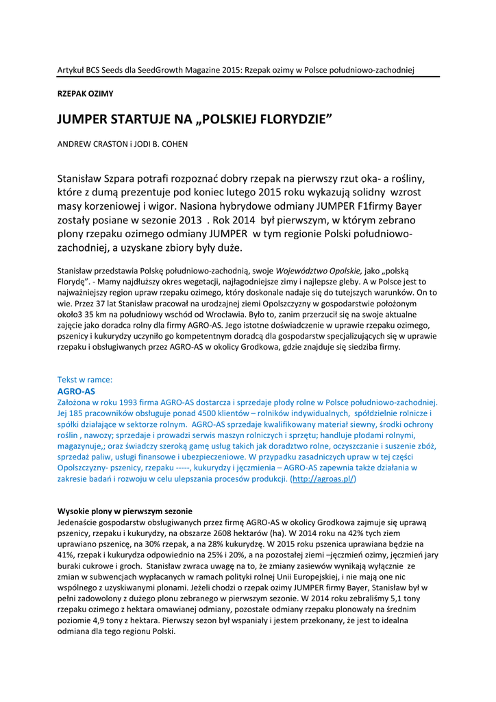 Artykuł BCS Seeds dla SeedGrowth Magazine 2015: Rzepak ozimy w Polsce południowo-zachodniej RZEPAK OZIMY JUMPER STARTUJE NA „POLSKIEJ FLORYDZIE” ANDREW CRASTON i JODI B. COHEN Stanisław Szpara potrafi rozpoznać dobry rzepak na pierwszy rzut oka- a rośliny, które z dumą prezentuje pod koniec lutego 2015 roku wykazują solidny wzrost masy korzeniowej i wigor. Nasiona hybrydowe odmiany JUMPER F1firmy Bayer zostały posiane w sezonie 2013 . Rok 2014 był pierwszym, w którym zebrano plony rzepaku ozimego odmiany JUMPER w tym regionie Polski południowozachodniej, a uzyskane zbiory były duże. Stanisław przedstawia Polskę południowo-zachodnią, swoje Województwo Opolskie, jako „polską Florydę”. - Mamy najdłuższy okres wegetacji, najłagodniejsze zimy i najlepsze gleby. A w Polsce jest to najważniejszy region upraw rzepaku ozimego, który doskonale nadaje się do tutejszych warunków. On to wie. Przez 37 lat Stanisław pracował na urodzajnej ziemi Opolszczyzny w gospodarstwie położonym około3 35 km na południowy wschód od Wrocławia. Było to, zanim przerzucił się na swoje aktualne zajęcie jako doradca rolny dla firmy AGRO-AS. Jego istotne doświadczenie w uprawie rzepaku ozimego, pszenicy i kukurydzy uczyniło go kompetentnym doradcą dla gospodarstw specjalizujących się w uprawie rzepaku i obsługiwanych przez AGRO-AS w okolicy Grodkowa, gdzie znajduje się siedziba firmy. Tekst w ramce: AGRO-AS Założona w roku 1993 firma AGRO-AS dostarcza i sprzedaje płody rolne w Polsce południowo-zachodniej. Jej 185 pracowników obsługuje ponad 4500 klientów – rolników indywidualnych, spółdzielnie rolnicze i spółki działające w sektorze rolnym. AGRO-AS sprzedaje kwalifikowany materiał siewny, środki ochrony roślin , nawozy; sprzedaje i prowadzi serwis maszyn rolniczych i sprzętu; handluje płodami rolnymi, magazynuje,; oraz świadczy szeroką gamę usług takich jak doradztwo rolne, oczyszczanie i suszenie zbóż, sprzedaż paliw, usługi finansowe i ubezpieczeniowe. W przypadku zasadniczych upraw w tej części Opolszczyzny- pszenicy, rzepaku -----, kukurydzy i jęczmienia – AGRO-AS zapewnia także działania w zakresie badań i rozwoju w celu ulepszania procesów produkcji. (http://agroas.pl/) Wysokie plony w pierwszym sezonie Jedenaście gospodarstw obsługiwanych przez firmę AGRO-AS w okolicy Grodkowa zajmuje się uprawą pszenicy, rzepaku i kukurydzy, na obszarze 2608 hektarów (ha). W 2014 roku na 42% tych ziem uprawiano pszenicę, na 30% rzepak, a na 28% kukurydzę. W 2015 roku pszenica uprawiana będzie na 41%, rzepak i kukurydza odpowiednio na 25% i 20%, a na pozostałej ziemi –jęczmień ozimy, jęczmień jary buraki cukrowe i groch. Stanisław zwraca uwagę na to, że zmiany zasiewów wynikają wyłącznie ze zmian w subwencjach wypłacanych w ramach polityki rolnej Unii Europejskiej, i nie mają one nic wspólnego z uzyskiwanymi plonami. Jeżeli chodzi o rzepak ozimy JUMPER firmy Bayer, Stanisław był w pełni zadowolony z dużego plonu zebranego w pierwszym sezonie. W 2014 roku zebraliśmy 5,1 tony rzepaku ozimego z hektara omawianej odmiany, pozostałe odmiany rzepaku plonowały na średnim poziomie 4,9 tony z hektara. Pierwszy sezon był wspaniały i jestem przekonany, że jest to idealna odmiana dla tego regionu Polski. Przeciętne zbiory na ziemiach uprawianych przez klientów firmy AGRO-AS to 12,4 tony kukurydzy, 90,7 ton pszenicy i 4,9 ton rzepaku z hektara. Plony max. to: 5,5 tony rzepaku,11,1 tony pszenicy i 13,7 kukurydzy z hektara. Zdaniem Stanisława, plon rzepaku JUMPER w pierwszym sezonie jest wysoce obiecujący. Wpływ zakazu stosowania CNI na rzepak oleisty Dwuletni zakaz stosowania narzucony przez Unię Europejską w grudniu 2013 roku na trzy zaprawy nasienne oparte na CNI (chloronikotynylu) miał negatywny wpływ na uprawy rzepaku ozimego w całej Europie, Polska nie była tu wyjątkiem. Nasiona rzepaku zaprawiane neonikotynoidami - Imidaklopridem i Klotianidyną sprzedawanymi przez Bayer CropScience - stosowane były w celu skutecznej ochrony przed zarówno przedwschodowymi jak i powschodowymi szkodnikami, np. pchełkami, chowaczem galasówkiem. Obecnie brak ochronnego działania tych zapraw nasiennych jest boleśnie odczuwalny na plantacjach rzepaku ozimego zasianego jesienią 2014 roku. Zgodnie z tym, co mówi Stanisław, gospodarstwa uprawiające go w okolicy Grodkowa nie stanowią tu wyjątku. Dały się więc zaobserwować szkody spowodowane przez insekty na rzepaku uprawianym w 2014 roku. - Zakaz stosowania określonych zapraw nasiennych oznacza, że nasi rolnicy muszą chronić plantacje rzepaku ozimego innymi środkami kilka razy w ciągu sezonu. To jest nie tylko droższe niż zakup nasion zaprawionych, lecz także gorsze dla organizmów pożytecznych i dla środowiska. Korzystny JUMPER JUMPER, hybrydowy rzepak ozimy firmy Bayer sprzedawany w Europie Wschodniej i Centralnej, charakteryzuje się bardzo wysokim, wczesnym wigorem i niezwykle intensywnym wzrostem od wschodu do kwitnienia. Jest to odmiana średnio-wysoka, średnio-wczesna, o dobrej odporności na wyleganie, dobrym potencjale plonotwórczym i zawartości oleju. Chociaż miniona zima była łagodna na Opolszczyźnie i Dolnym Śląsku, udowodniona zimotrwałość JUMPERa okaże się przydatna, jeżeli w Polsce południowo-zachodniej w przyszłych sezonach przyjdzie chłodniejsza zima. Inną cenioną właściwością JUMPERa jest jego wysoka masa tysiąca nasion. - Najważniejsze kryterium stosowane przy doborze odmian to maksymalny potencjał plonotwórczy - mówi Stanisław. Na podstawie tego, co widział on dotychczas, potwierdza, że JUMPER wykazuje wszystkie powyższe cechy na tutejszych żyznych glebach. I dlatego będzie on nadal zalecał stosowanie tych nasion współpracującym z firmą AGRO-AS producentom rzepaku. Z firmą Bayer od 1996 roku Stanisław jest klientem firmy Bayer od 1996 roku. Wtedy pracował on jeszcze jako rolnik i siał 