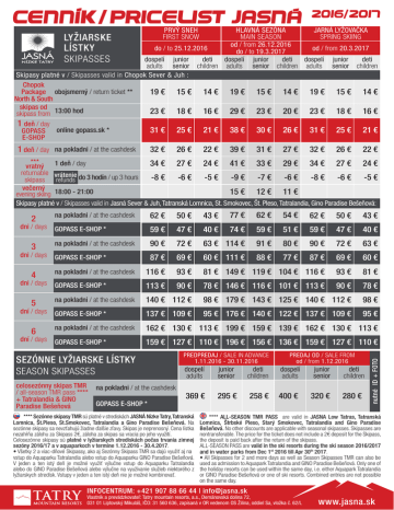 CENNiK pricelist jasna 2016 2017 Prvý sneh First snow Hlavná sezóna Jarná lyžovačka Main season Spring skiing od / from 26.12.2016 do / to 25.12.2016 od / from 20.3.2017 do / to 19.3.2017 dospelí junior deti dospelí junior deti dospelí junior deti adults senior children adults senior children adults senior children Skipasy platné v / Skipasses valid in Chopok Sever & Juh : Chopok Package obojsmerný / return ticket ** 19 € 15 € 14 € 19 € 15 € 14 € 19 € 15 € 14 € North & South skipas od 23 € 18 € 16 € 29 € 23 € 20 € 23 € 18 € 16 € skipass from 13:00 hod LYŽIARSKE LÍSTKY SKIPASSES 1 deň / day GOPASS E-SHOP 1 deň / day online gopass.sk * 31 € 25 € 21 € 38 € 30 € 26 € 31 € 25 € 21 € na pokladni / at the cashdesk 32 € 26 € 22 € 39 € 31 € 27 € 32 € 26 € 22 € *** 34 € 27 € 24 € 41 € 33 € 29 € 34 € 27 € 24 € vratný 1 deň / day returnable vrátenie -8 € -6 € -5 € -9 € -7 € -6 € -8 € -6 € -5 € skipass refunds do 3 hodín / up 3 hours večerný 15 € 12 € 11 € evening skiing 18:00 - 21:00 Skipasy platné v / Skipasses valid in Jasná Sever & Juh, Tatranská Lomnica, St. Smokovec, Št. Pleso, Tatralandia, Gino Paradise Bešeňová: 3 dni / days 4 dni / days 5 dní / days 6 dní / days na pokladni / at the cashdesk 62 € 50 € 43 € 77 € 62 € 54 € 62 € 50 € 43 € GOPASS E-SHOP * 59 € 47 € 40 € 74 € 59 € 51 € 59 € 47 € 40 € na pokladni / at the cashdesk 90 € 72 € 63 € 114 € 91 € 80 € 90 € 72 € 63 € GOPASS E-SHOP * 87 € 69 € 60 € 111 € 88 € 77 € 87 € 69 € 60 € na pokladni / at the cashdesk 116 € 93 € 81 € 149 € 119 € 104 € 116 € 93 € 81 € GOPASS E-SHOP * 113 € 90 € 78 € 146 € 116 € 101 € 113 € 90 € 78 € na pokladni / at the cashdesk 140 € 112 € 98 € 179 € 143 € 125 € 140 € 112 € 98 € GOPASS E-SHOP * 137 € 109 € 95 € 176 € 140 € 122 € 137 € 109 € 95 € na pokladni / at the cashdesk 162 € 130 € 113 € 199 € 159 € 139 € 162 € 130 € 113 € GOPASS E-SHOP * 159 € 127 € 110 € 196 € 156 € 136 € 159 € 127 € 110 € SEZÓNNE LYŽIARSKE LÍSTKY SEASON SKIPASSES celosezónny skipas TMR / all-season TMR pass **** + Tatralandia & GINO Paradise Bešeňová na pokladni / at the cashdesk GOPASS E-SHOP * PREDPREDAJ / SALE IN ADVANCE 1.11.2016 - 30.11.2016 PREDAJ OD / SALE FROM od / from 1.12.2016 dospelí adults junior senior deti children dospelí adults junior senior deti children 369 € 295 € 258 € 400 € 320 € 280 € **** Sezónne skipasy TMR sú platné v strediskách JASNÁ Nízke Tatry, Tatranská Lomnica, Št.Pleso, St.Smokovec, Tatralandia a Gino Paradise Bešeňová. Na sezónne skipasy sa nevzťahujú žiadne ďalšie zľavy. Skipas je neprenosný. Cena lístka nezahŕňa zálohu za Skipass 2€, záloha za skipas sa vracia po jeho využití. Celosezónne skipasy sú platné v lyžiarskych strediskách počas trvania zimnej sezóny 2016/17 a v aquaparkoch v termíne 1.12.2016 - 30.4.2017. • Všetky 2 a viac-dňové Skipassy, ako aj Sezónny Skipass TMR sa dajú využiť aj na vstup do Aquaparku Tatralandia alebo vstup do Aquaparku GINO Paradise Bešeňová. V jeden a ten istý deň je možné využiť výlučne vstup do Aquaparku Tatralandia alebo do GINO Paradise Bešeňová alebo výlučne na využívanie služieb niektorého z lyžiarskych stredísk. Vstupy v jeden a ten istý deň nie je možné kombinovať. nutné ID + FOTO 2 dni / days **** ALL-SEASON TMR PASS are valid in JASNA Low Tatras, Tatranská Lomnica, Štrbské Pleso, Starý Smokovec, Tatralandia and Gino Paradise Bešeňová. No other discounts are applicable with seasonal skipasses. Skipasses are nontransferable. The price for the ticket does not include a 2€ deposit for the Skipass, the deposit is paid back after the return of the skipass. ALL-SEASON PASS are valid in the ski resorts during the ski season 2016/2017 and in water parks from Dec 1st 2016 till Apr 30th 2017. • All Skipasses for 2 and more days as well as Season Skipasses TMR can also be used as admission to Aquapark Tatralandia and GINO Paradise Bešeňová. Only one of the holiday resorts can be used within the same day, i.e. either Aquapark Tatralandia or GINO Paradise Bešeňová or one of ski resorts. Combined entries are not possible on the same day. INFOCENTRUM: +421 907 88 66 44 | [email protected] Vlastník a prevádzkovateľ: Tatry mountain resorts, a.s., Demänovská dolina 72, 031 01 Liptovský Mikuláš, IČO: 31 560 636, zapísaná v OR vedenom OS Žilina, oddiel Sa, vložka č. 62/L www.jasna.sk PREVÁDZKOVÁ DOBA HOURS OF OPERATION / GODZINY OTWARCIA Lanové dráhy a lyžiarske vleky sú v prevádzke v závislosti od snehových a poveternostných podmienok. do / until 31.1.2017 od / from 1.2.2017 Operation of cable ways and ski lifts depends on snow and weather conditions. 8:30-15:30 8:30-16:00 Rozkład jazdy kolei linowych w zależności od warunków śniegowych i pogodowych. VYSVETLIVKY A UPOZORNENIA / EXPLANATORY NOTES & WARNINGS / OBJAŚNIENIA I OSTRZEŻENIA * E-SHOP - zvýhodnenú cenu lyžiarskeho lístka s kartou GOPASS získate po jeho nákupe cez internetový obchod na www.gopass.sk. Informácie o špeciálnych cenách, odmenách a obchodných podmienkach získate na www.gopass.sk alebo na infolinke 0850 122 155. ** Chopok Package North & South: obojsmerná jazda lanovkami v úseku Biela Púť / Záhrady - Priehyba CHOPOK - Kosodrevina - Krupová / Srdiečko a rovnakou trasou späť. Z Chopku Juh platí na rovnakú trasu v opačnom smere. *** Vratný 1 deň: Klient má možnosť rozhodnúť sa pre skrátenie pobytu v stredisku. Podľa časového limitu, v ktorom vráti nevyužitý skipas v pokladni, mu bude časť hodnoty cestovného refundovaná podľa uvedenej tabuľky. Časový limit začína plynúť od prvého prechodu skipasu cez turniket a
